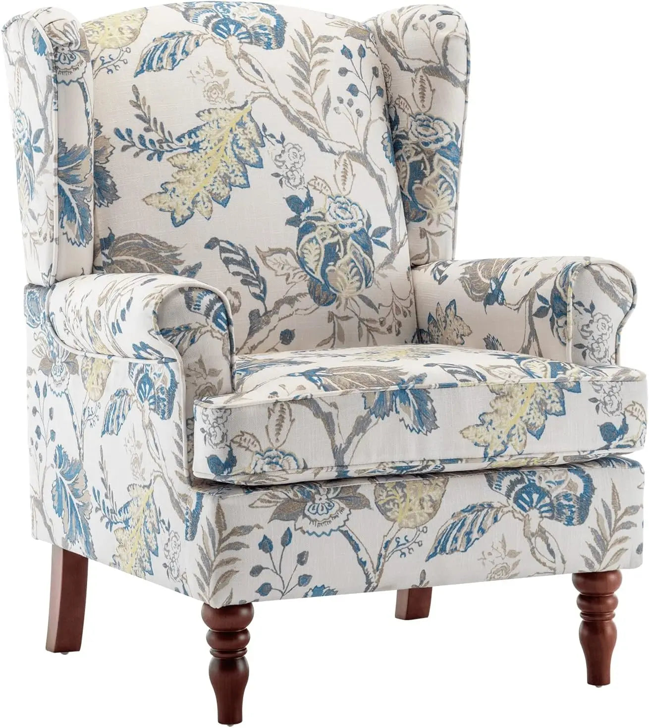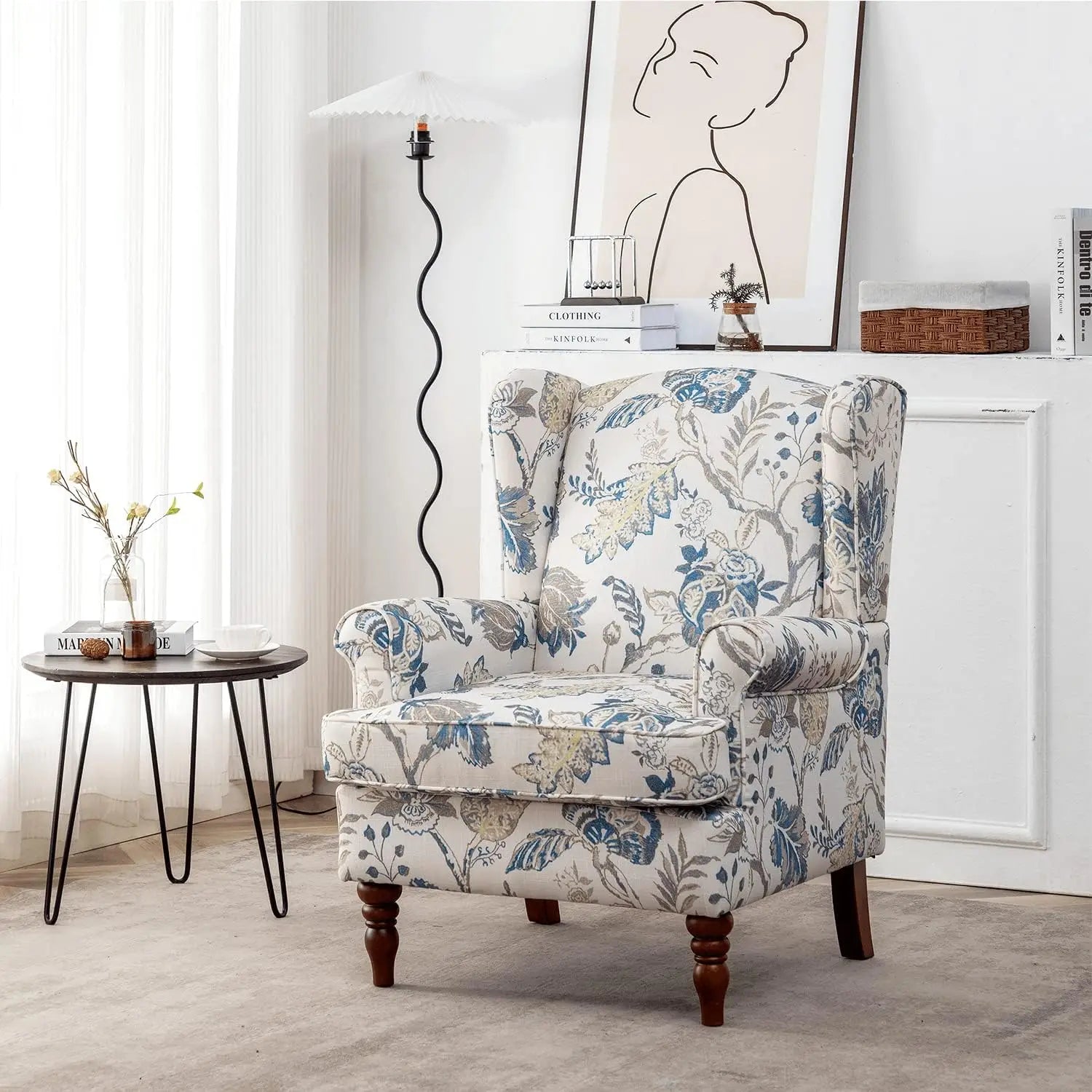 Floral Accent Chair High Back Upholstered Armchair Blue Solid