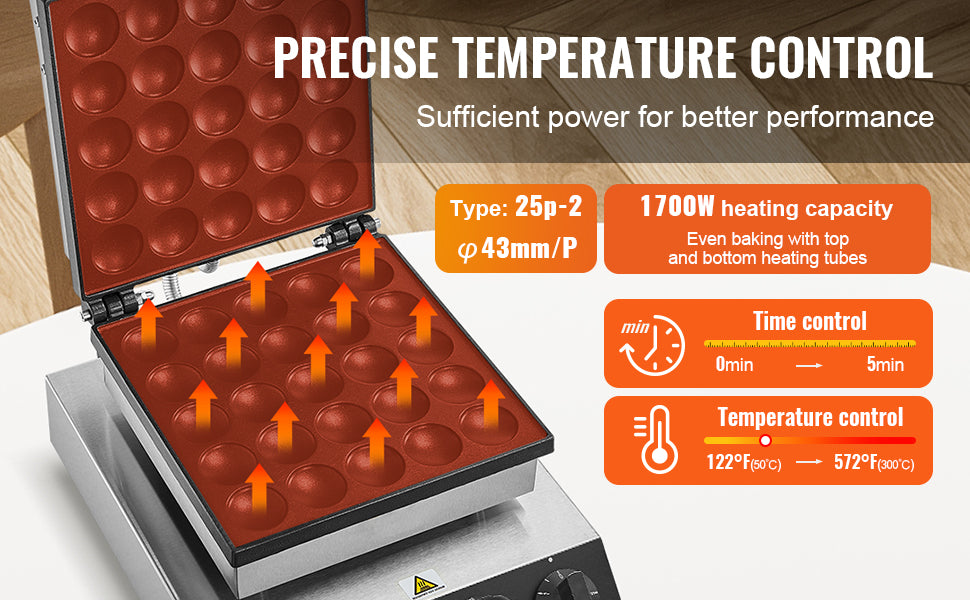 Quickly Make Delicious Pancakes: Our 1700W high-power dutch pancake maker can independently produce 25 delicious mini waffles (approximately Ø43mm) at a time, crispy on the outside and fluffy on the inside, saving you time and providing an effortless breakfast. Evenly distributed heating elements ensure your waffles are uniformly baked. Get ready to enjoy delicious waffles filled with your favorite toppings.