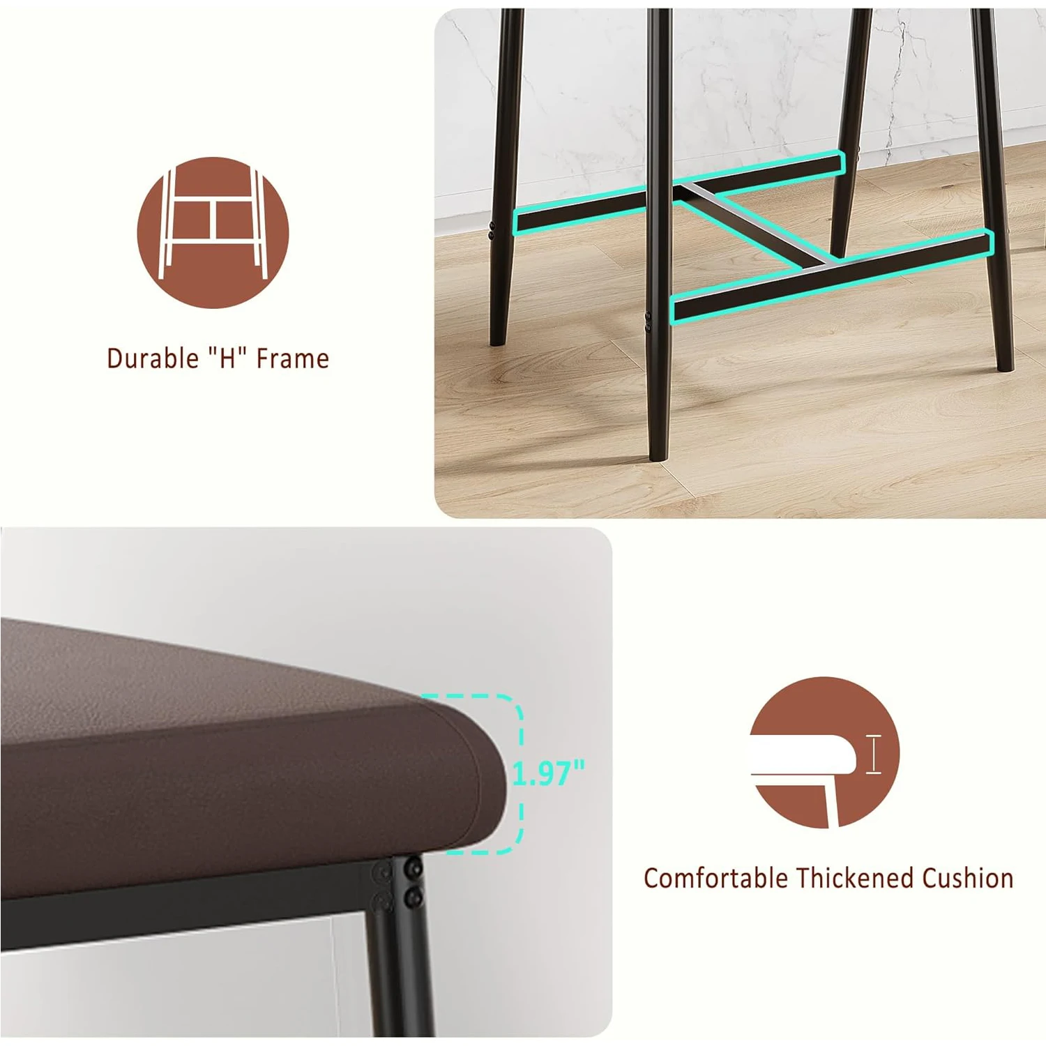 2. Sturdy and Durable: Measuring 19.29” L × 18.9” W × 37.01” H with a cushion height of 25.59”, this kitchen island bar stool set of 2 is built with a heavy-duty metal frame capable of supporting up to 400 LBS. Its innovative “H”-shaped base enhances structural stability, providing a safe and reliable seating experience