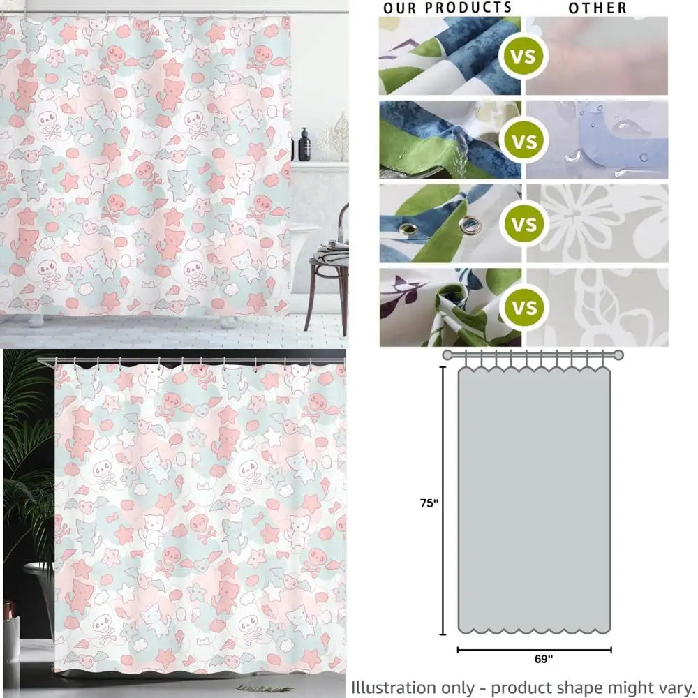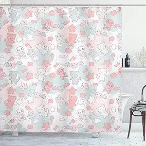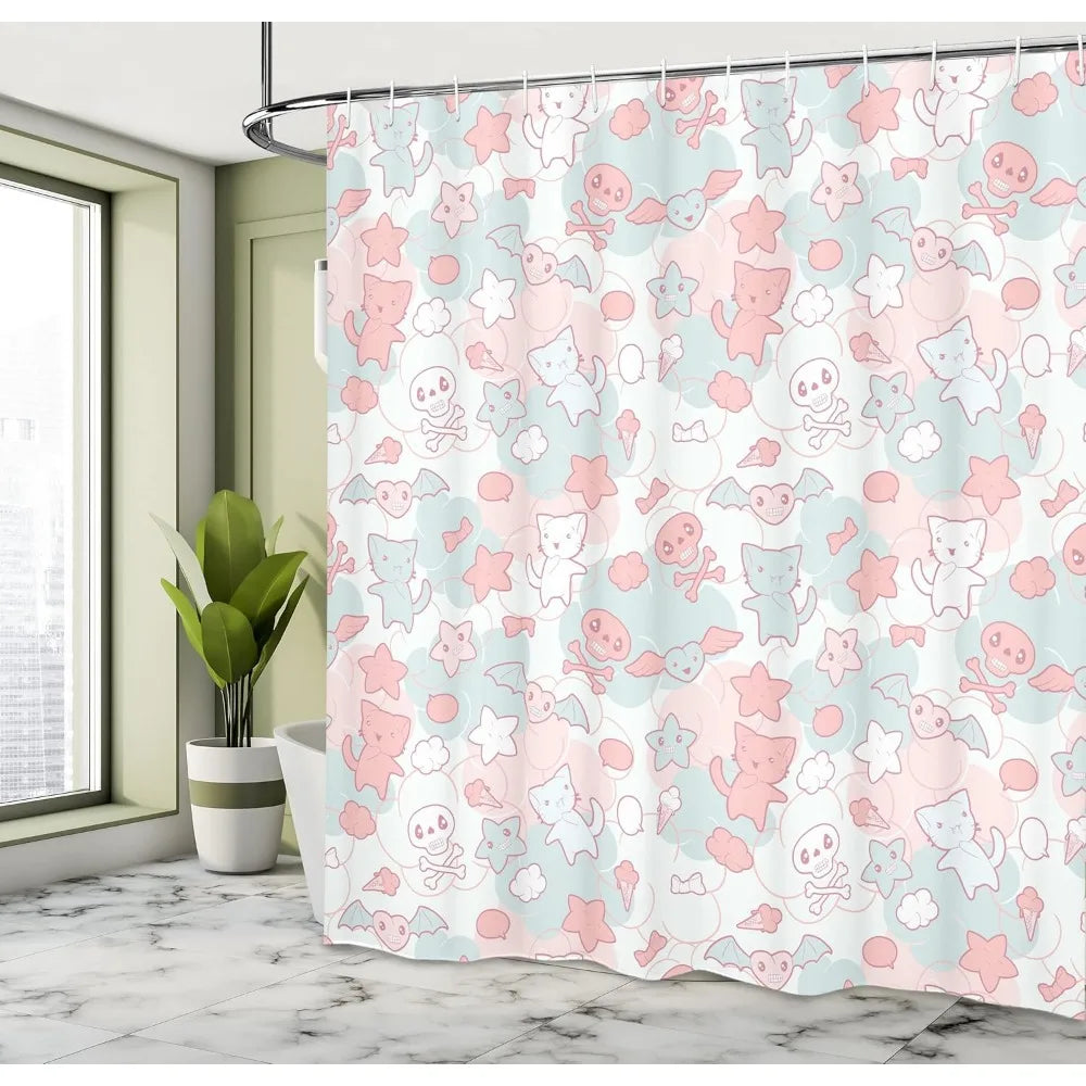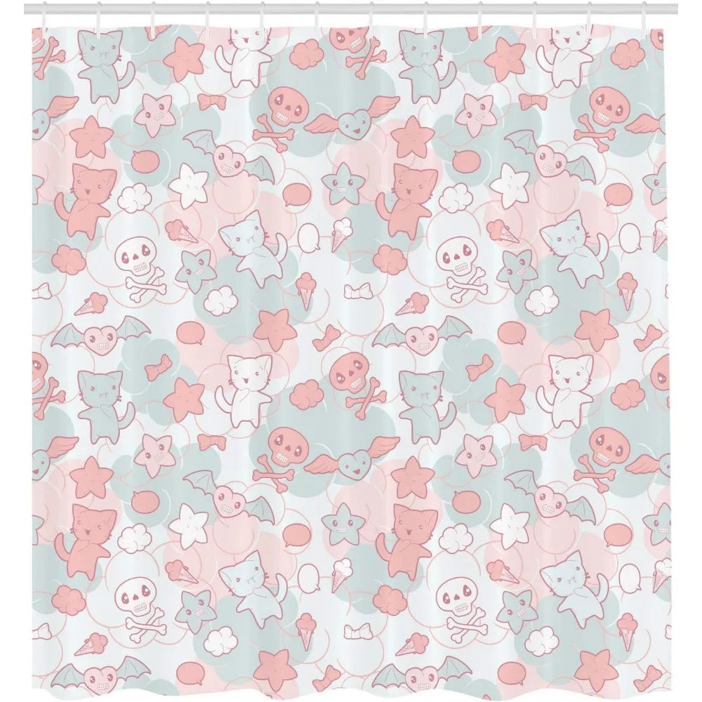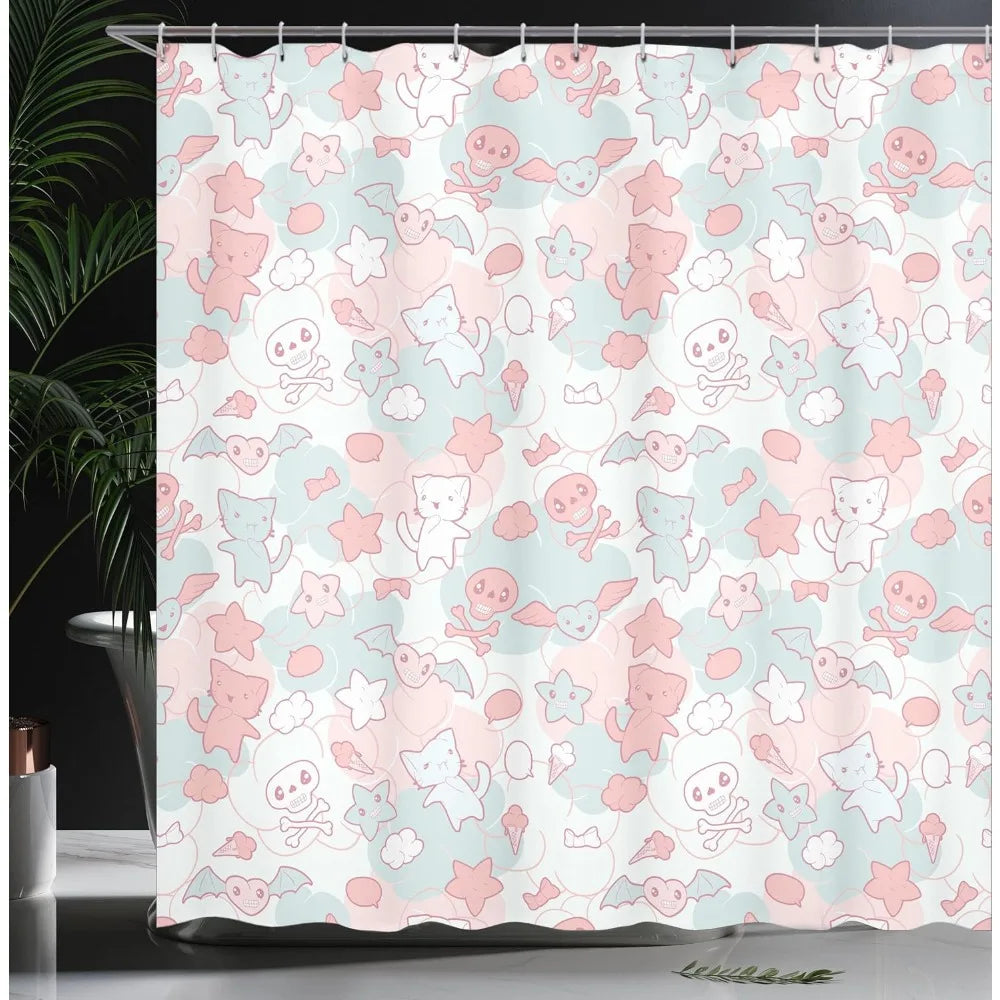 Japanese Inspired Kawaii Shower Curtain Cute Cats Bats And