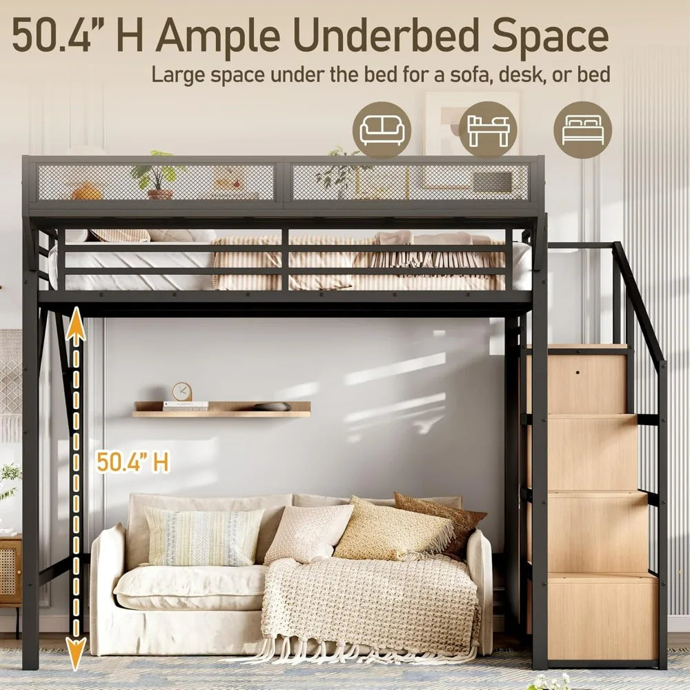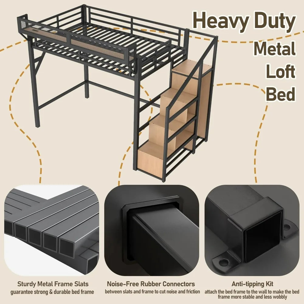 Twin Metal Loft Bed with Storage Stairs Side Shelf
