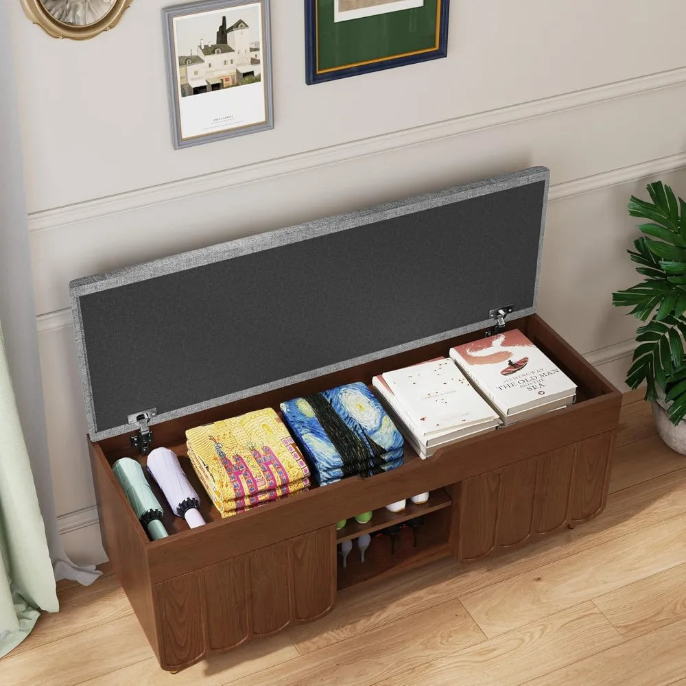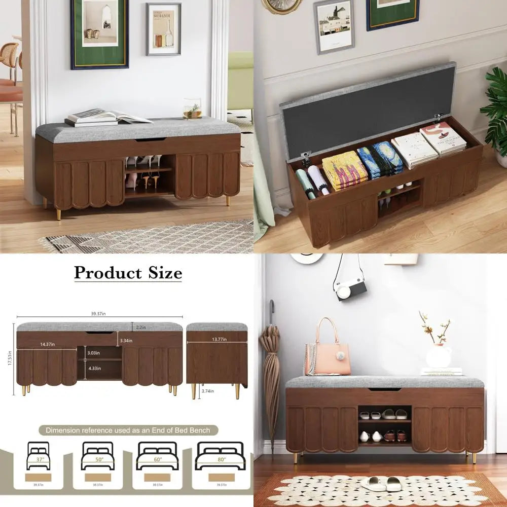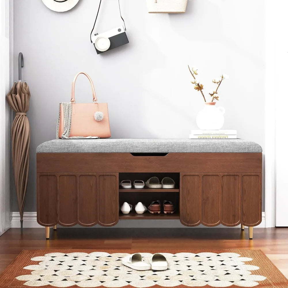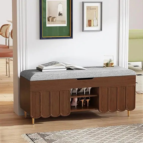 This item features a spacious and beautiful entryway bench with upholstery, offering hidden storage space beneath for organizing daily essentials. The central open compartment is perfect for storing indoor shoes, while the cabinets on either side provide ample room for various shoe sizes. This versatile storage solution caters to different storage needs and enhances the shoe-changing experience. The modern style accent shoe bench boasts a geometric design with wavy lines, reflecting a contemporary minimalist aesthetic. Serving as both functional storage and a decorative piece, this shoe bench is suitable for various home styles and enhances the visual appeal of your home. Its versatile design allows for placement in different areas of your home. Durability and easy maintenance are key features of this entryway bench. It is supported by solid wood legs that ensure stability and longevity. The decorative wood grain surface is both beautiful and waterproof, making it easy to clean and maintain. The shoe stool is an ideal addition to your entryway, accommodating various shoe styles and providing a comfortable place to sit while putting on shoes. The soft cushioning adds to the convenience. Moreover, the storage space is not only great for entryways but also suitable for bedrooms and dining rooms. Assembly and use of the entryway cabinet are straightforward. Illustrated instructions are included, and the assembly can be completed within 30 minutes. Should you encounter any issues, feel free to reach out for assistance, as we are committed to providing you with the best support.