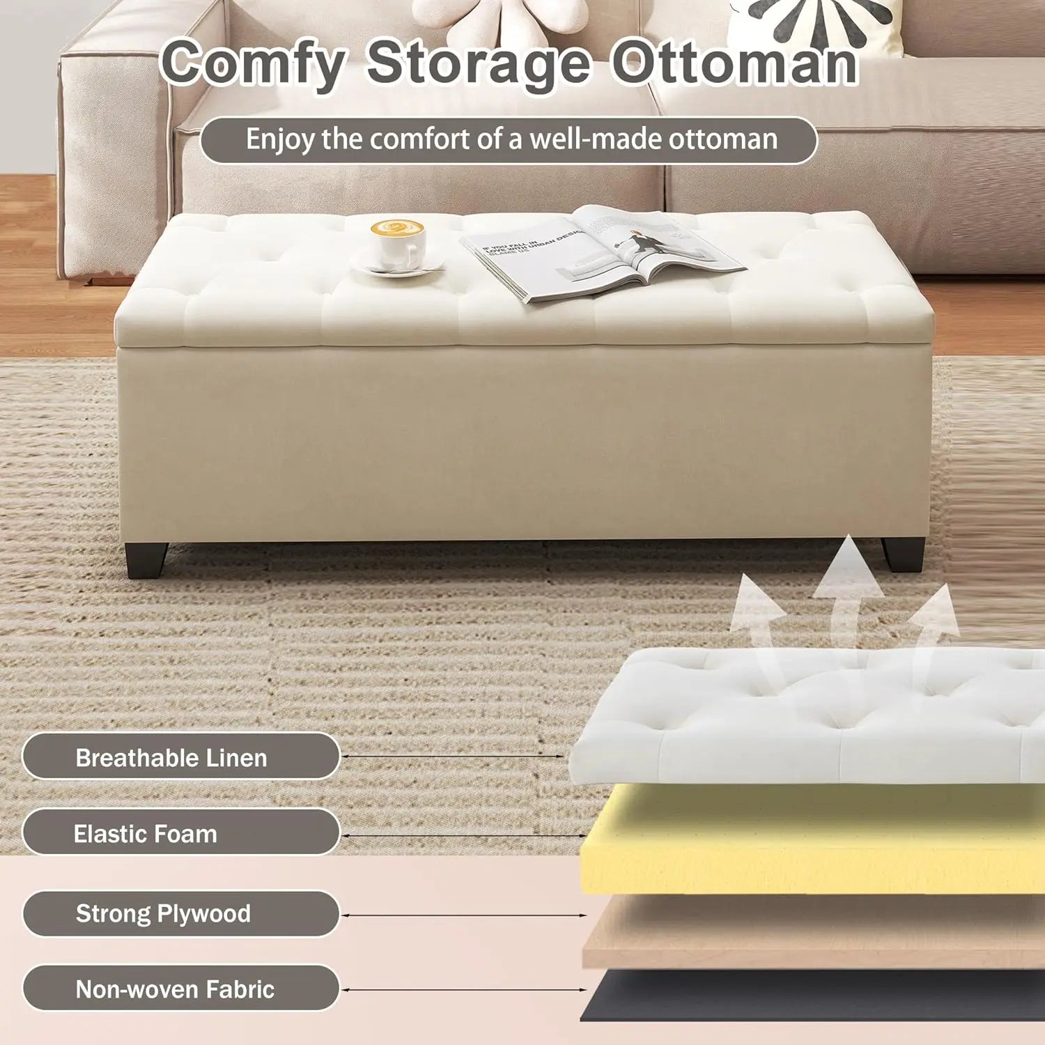 48" Tufted Storage Ottoman Bench with Hinged Lid, End of Bed Bench for Living Room, Bedroom, and Entryway, Beige