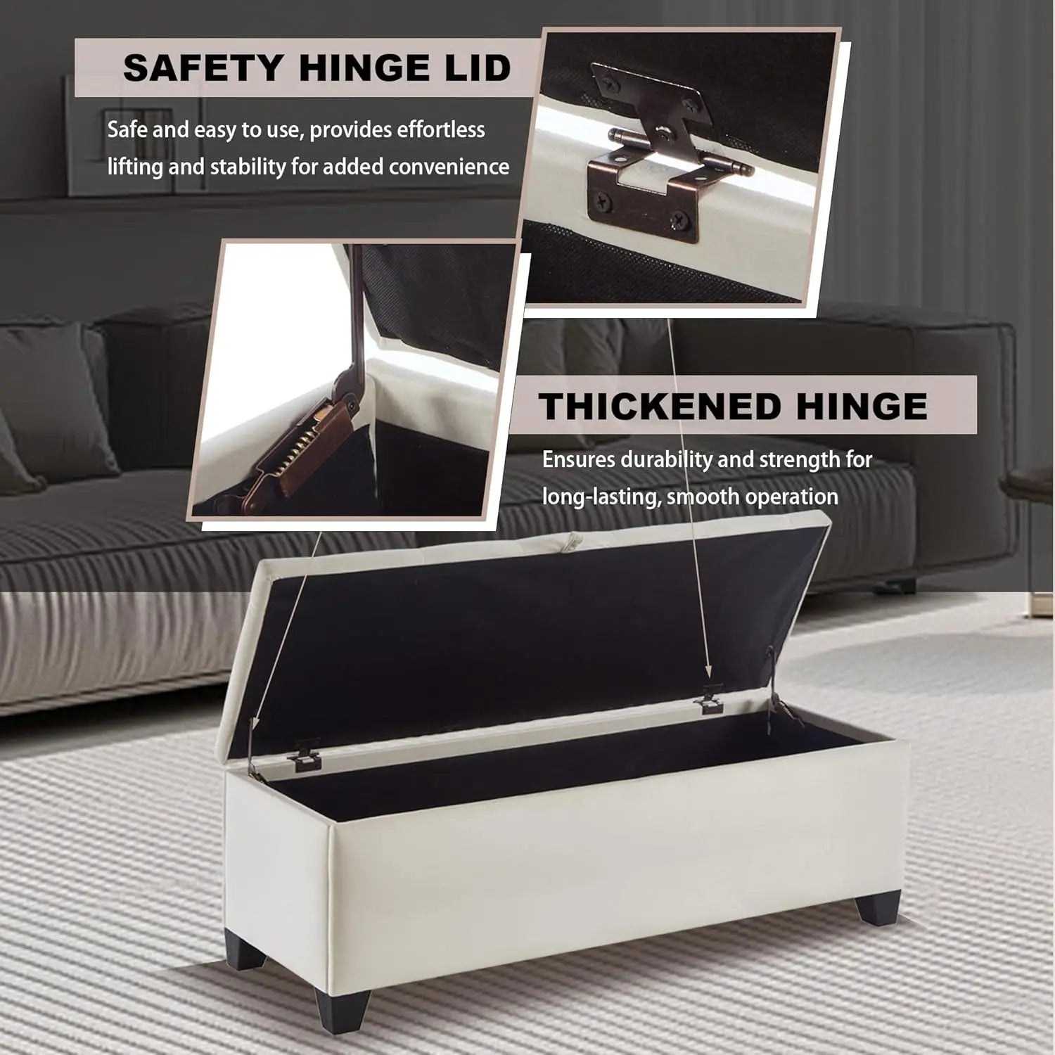 • Sturdy and Durable Construction: Built with a solid wooden frame and sturdy legs, this velvet bench with storage supports up to 300 lbs. The premium velvet covering and thick padding ensure durability and a luxurious seating. Our storage ottoman is equipped with safety hinges; Allowing the lid to open wider and more smoothly. Enjoy quiet operation and protection against finger pinching