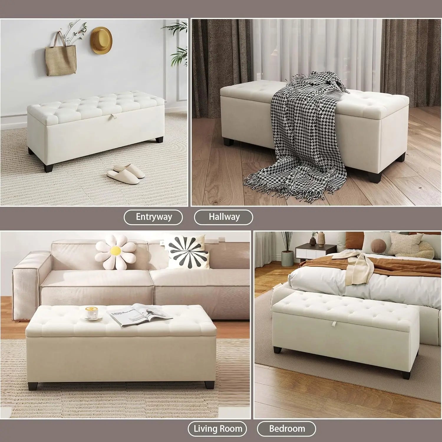 • Spacious Hidden Storage: Equipped with a hinged lid and a large interior compartment, this ottoman bench with storage and seating offers ample storage space. This tufted storage ottoman bench provides ample storage for blankets, pillows, or other household items, helping you keep your room tidy and organized.
