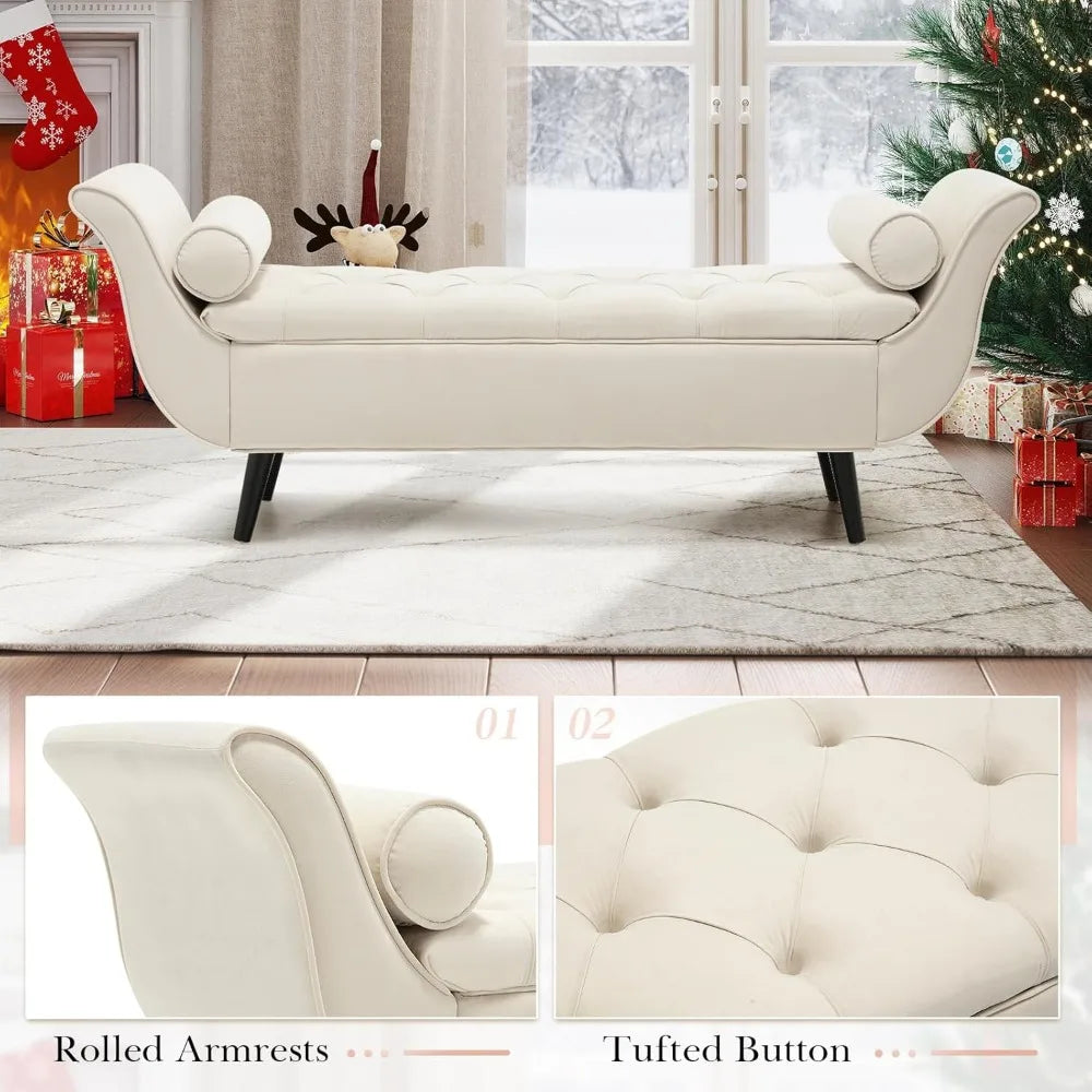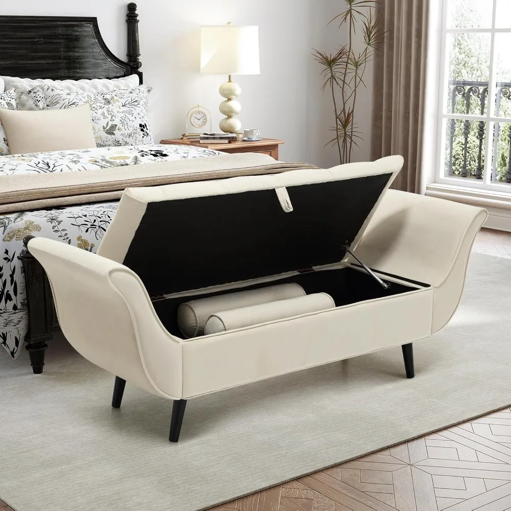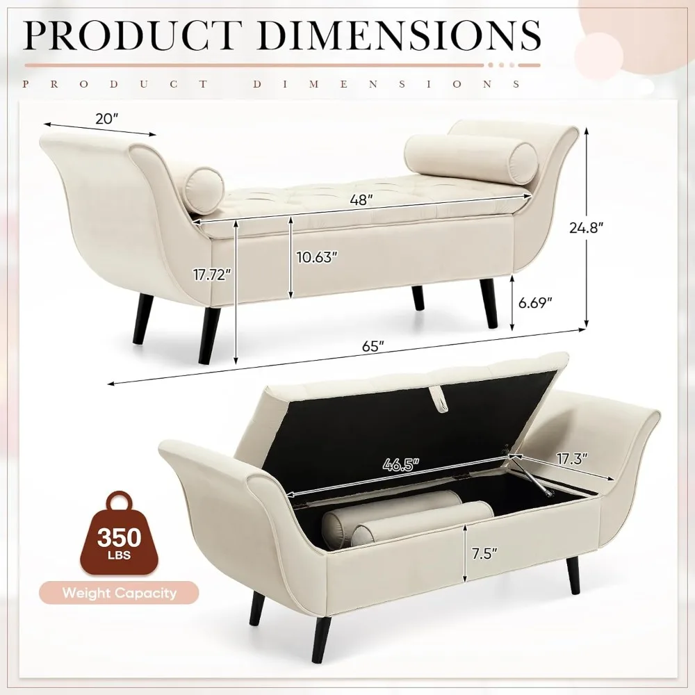 This storage bench is a chic solution for organizing your home. It features a hidden compartment that can be accessed by lifting the lid with a pull ring. The storage space measures 46.5 inches wide, 17.3 inches deep, and 7.5 inches high, ideal for storing items such as books, remotes, and magazines, helping to maintain a tidy living room. Beyond storage, this bench doubles as a seating option. It can be used at the foot of a bed, by a window, or as a reading nook, thanks to its upholstered seat cushions. The bench's elegant design, with soft velvet upholstery, rolled armrests, and solid wood legs, adds a touch of sophistication to your space. Its 65-inch length makes it a fitting centerpiece for larger rooms. Constructed with a sturdy hardwood frame, this bench is built for durability and can support up to 350 pounds. The storage compartment is securely attached to the lid with metal hinges, ensuring safety when storing or retrieving items. Assembly is straightforward, with clear instructions and all necessary hardware provided, making it easy to set up this bedroom storage bench.