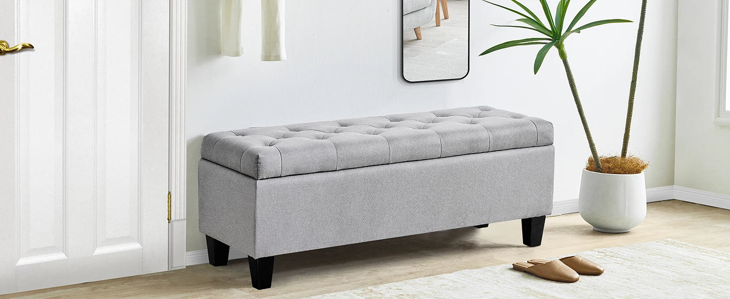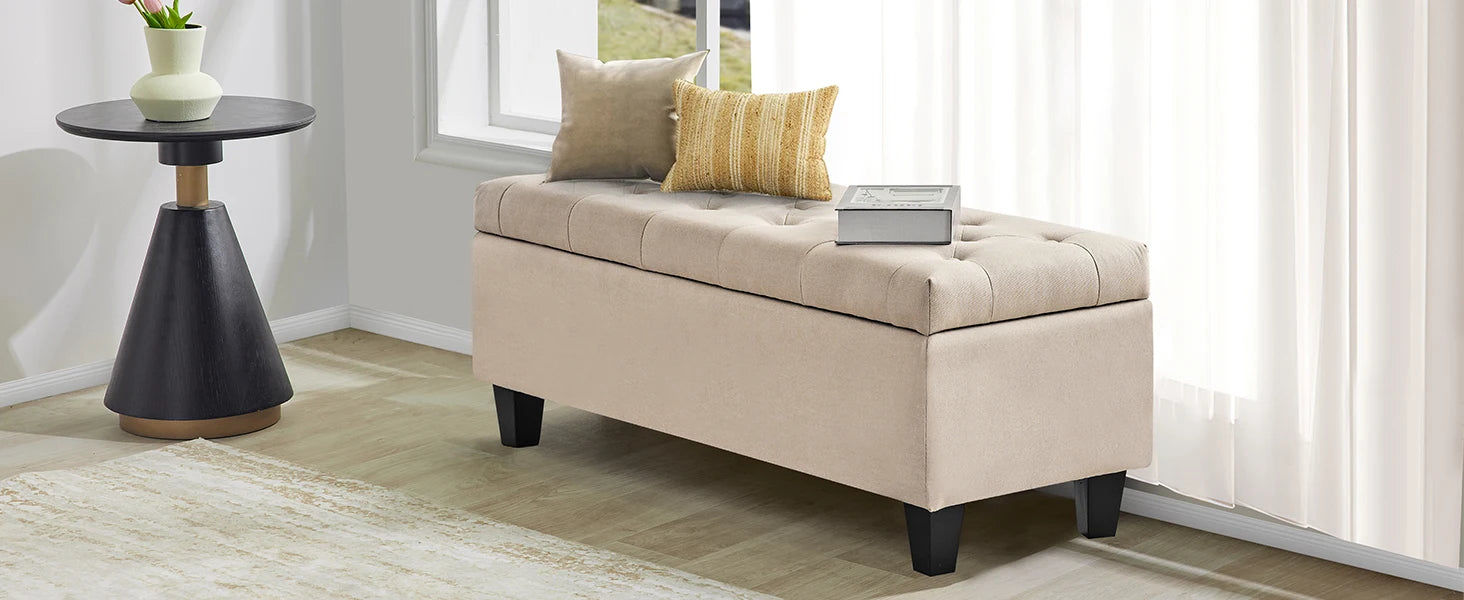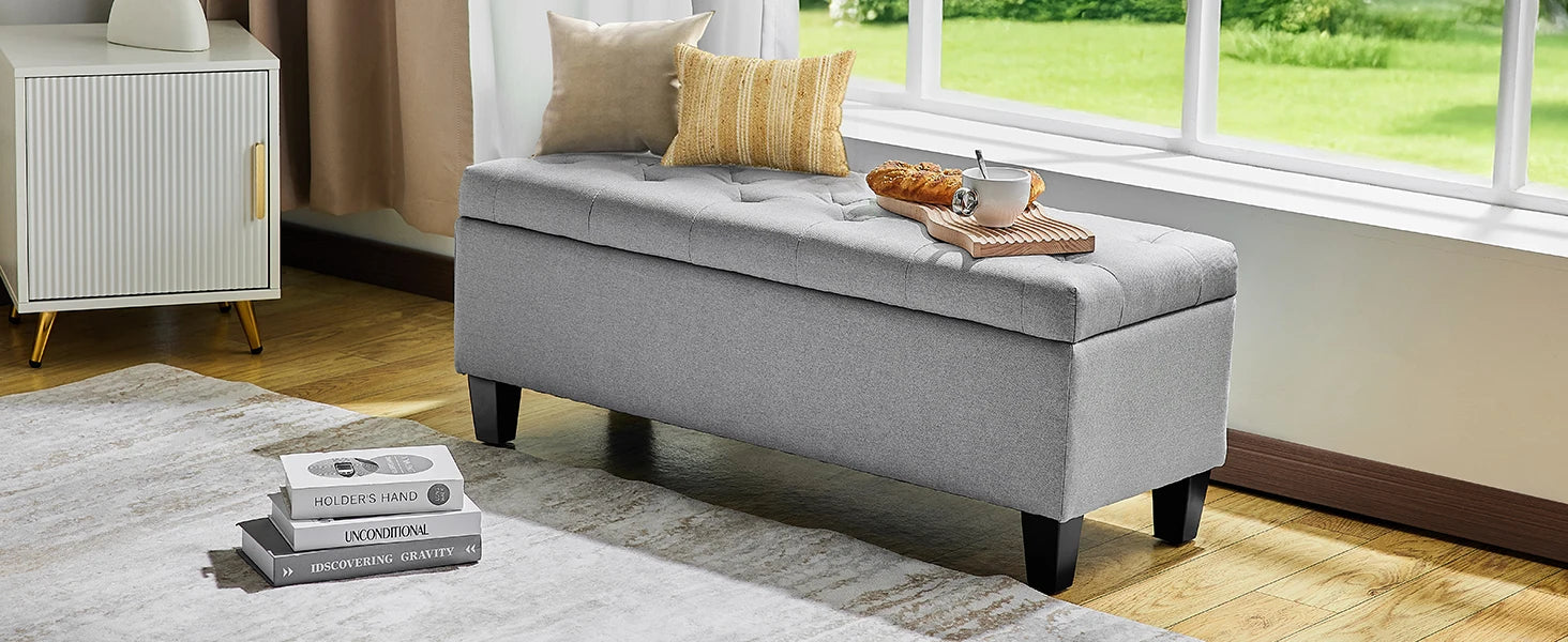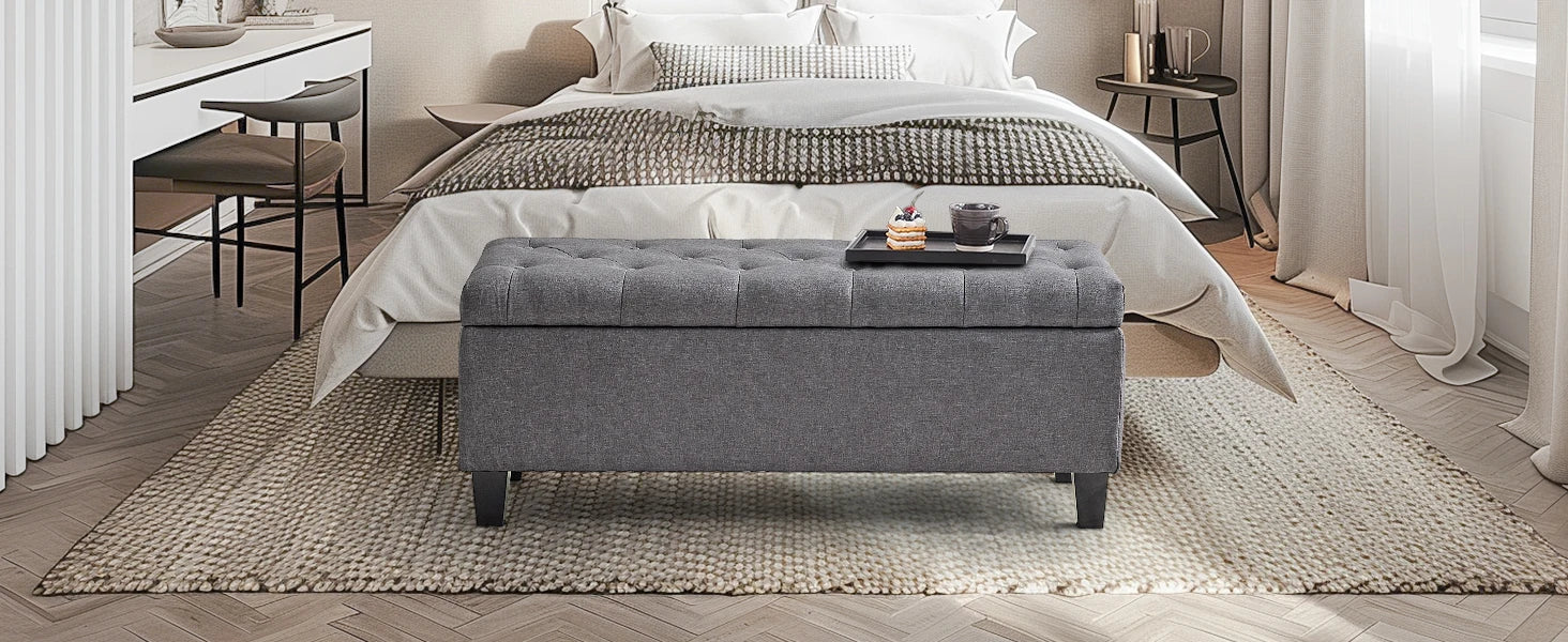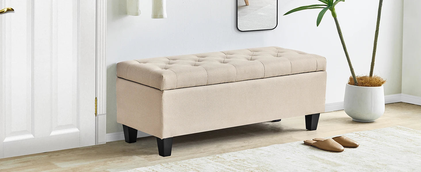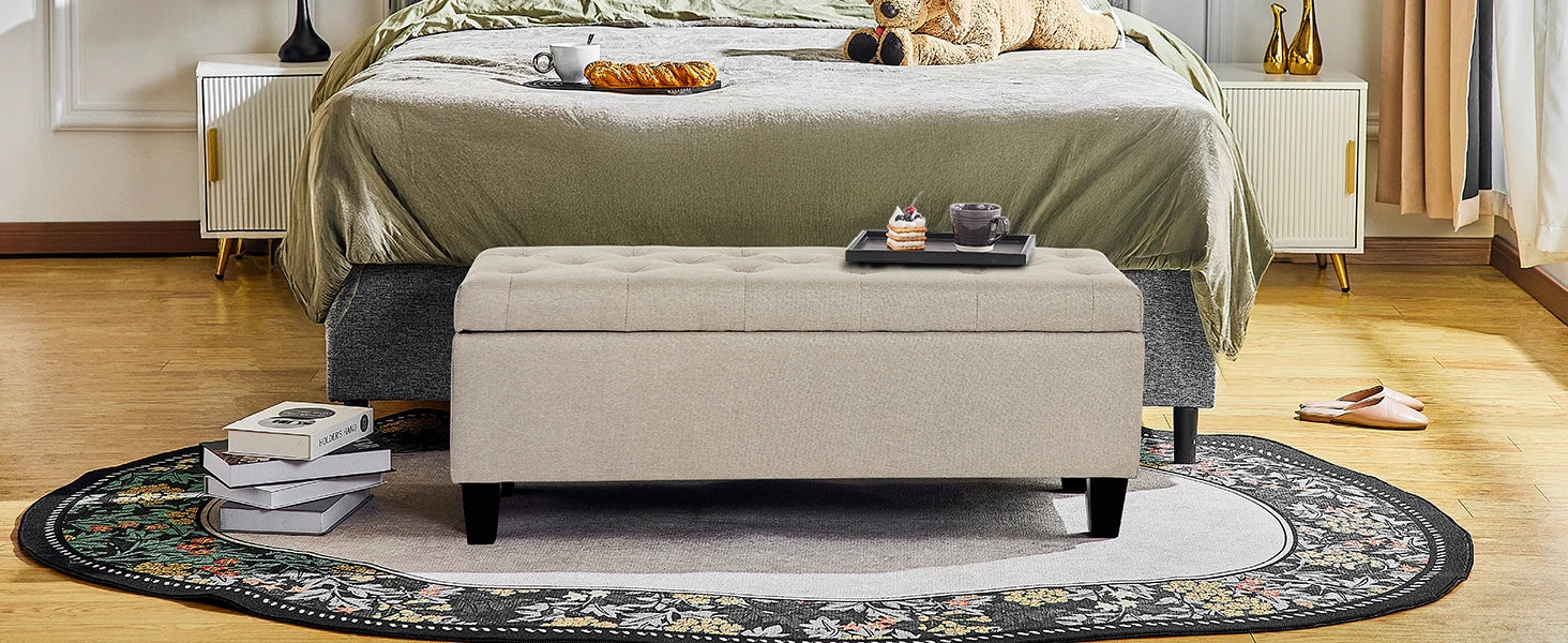 【Comfortable and Elegant】- Covered by linen-look fabric, adorned with button tufting and delicate stitching, filled with high-resilience foam, our storage bench for bedroom not only adds modern touch to your home, but also ensure long lasting comfort.