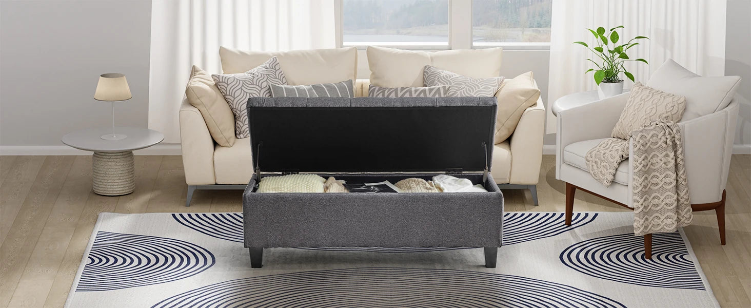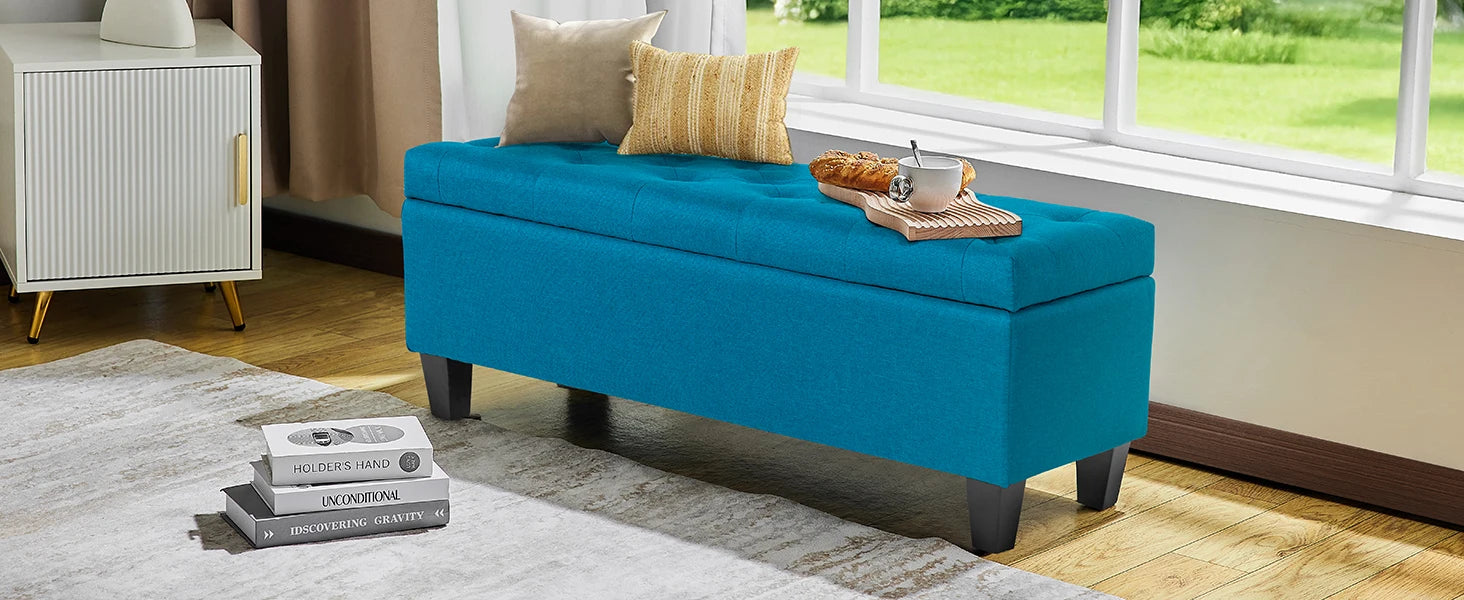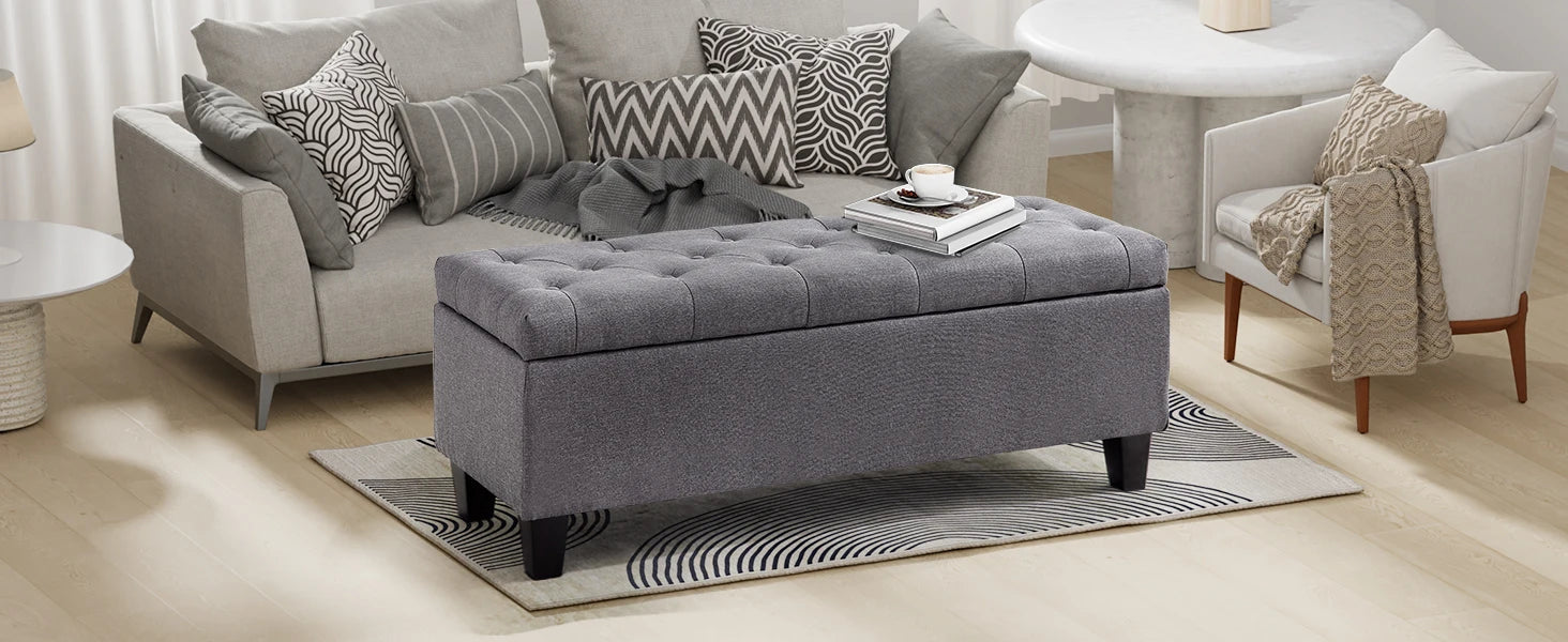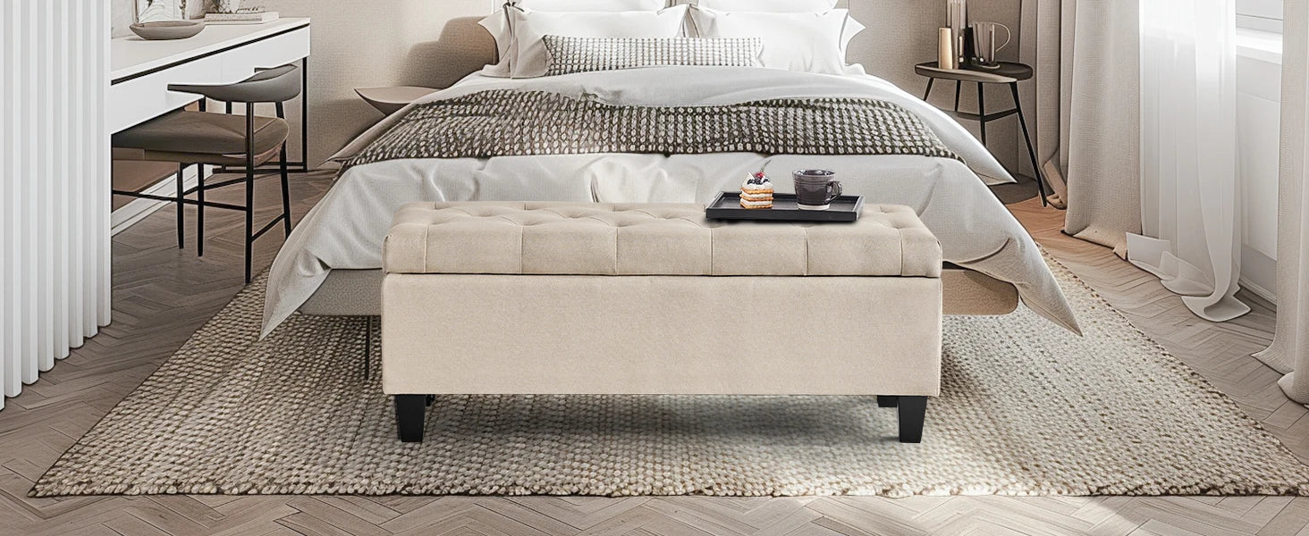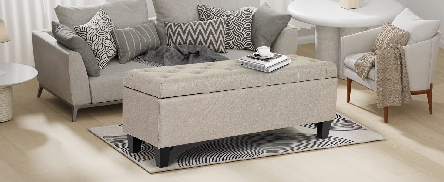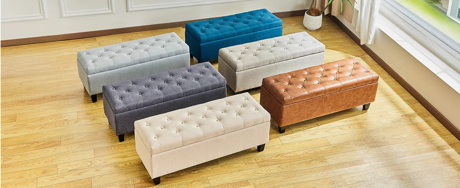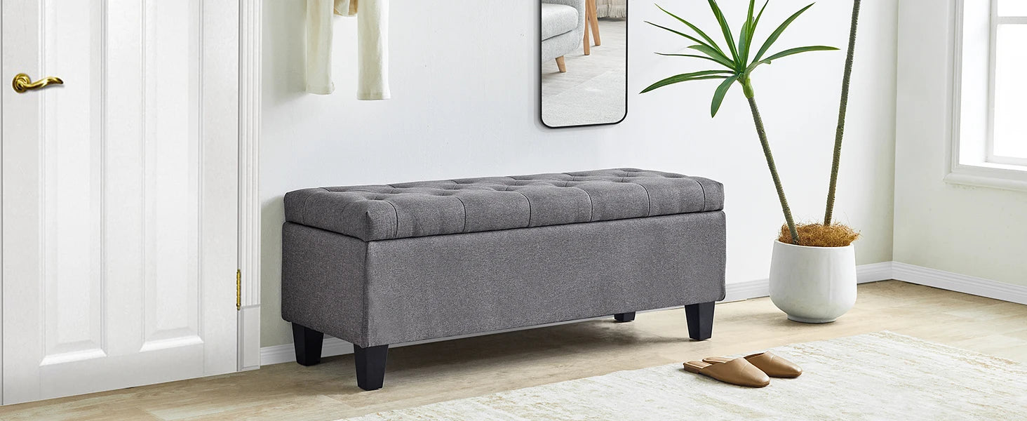 【Comfortable and Elegant】- Covered by linen-look fabric, adorned with button tufting and delicate stitching, filled with high-resilience foam, our storage bench for bedroom not only adds modern touch to your home, but also ensure long lasting comfort.