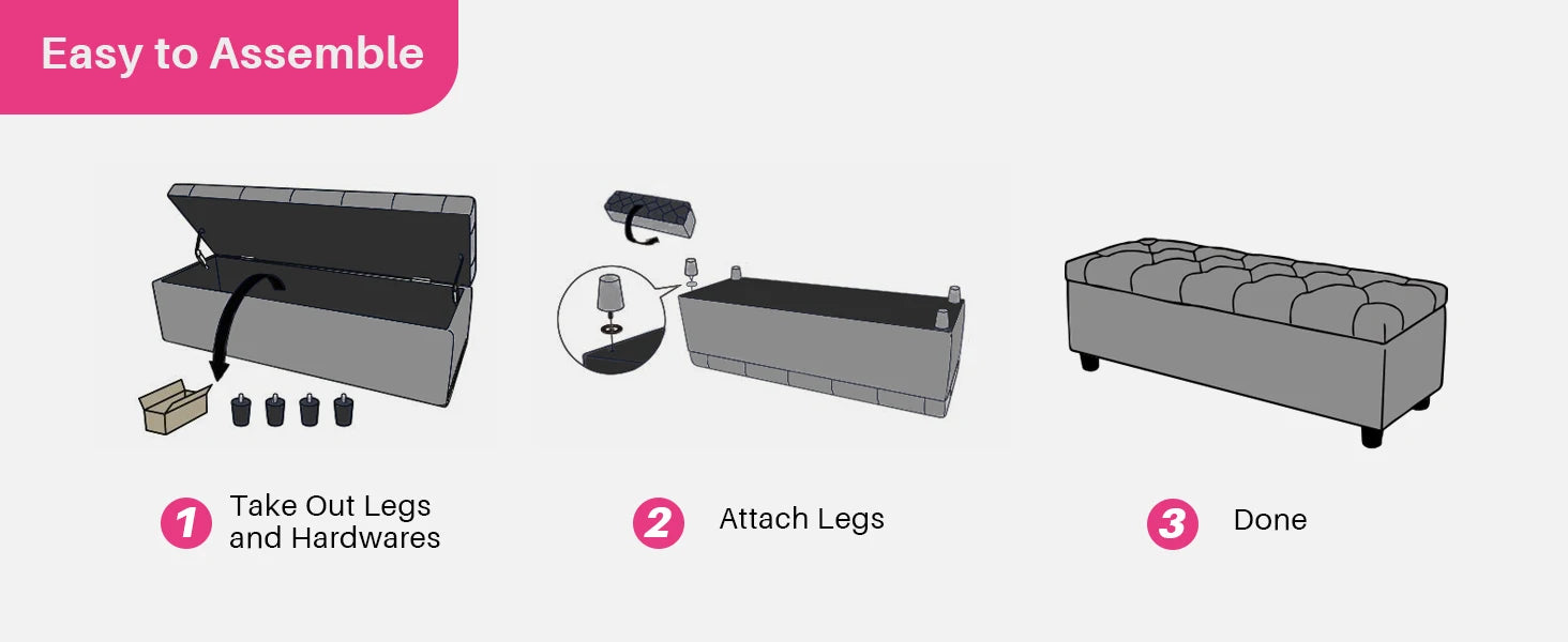 【Easy to Assemble】- This main part of ottoman bench with storage is already pre-assemble, Only you need to install the four feet and we provide you with instructions and tool.