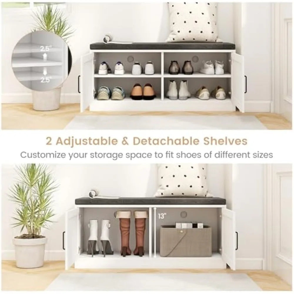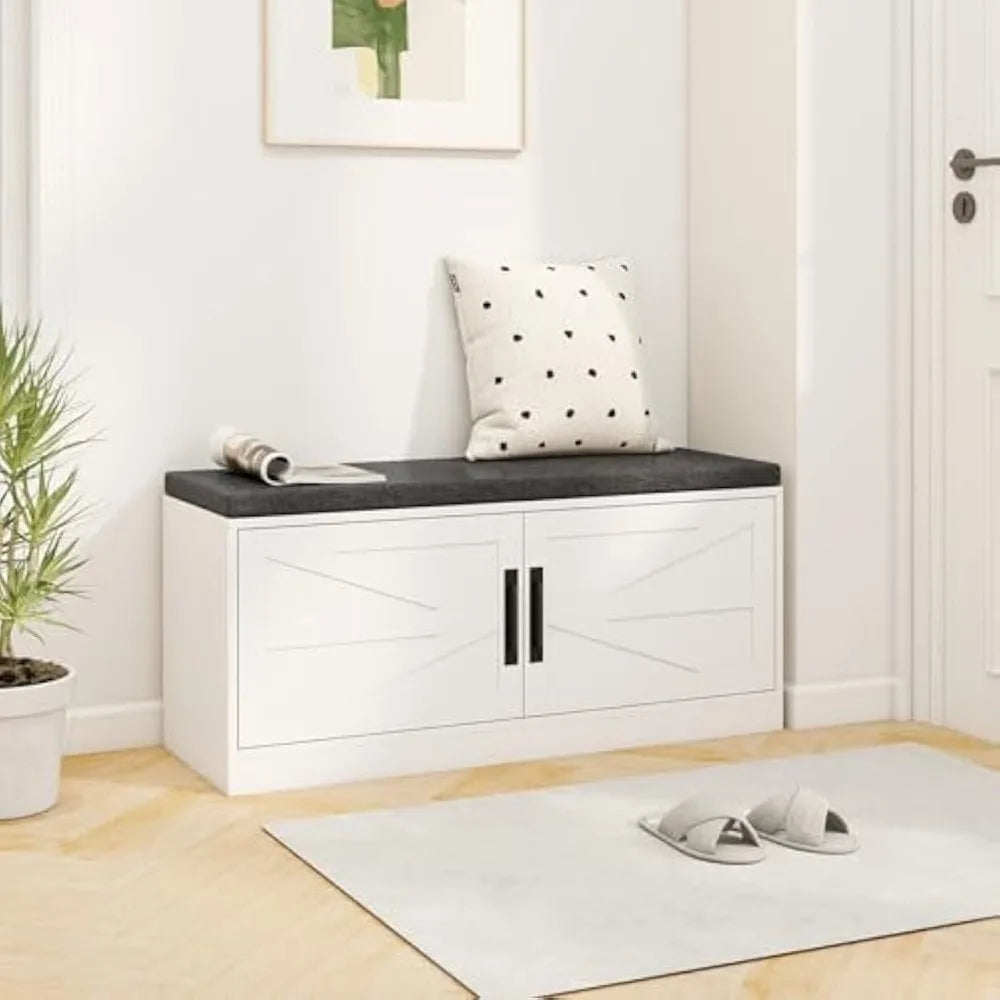 This shoe storage bench offers a versatile and stylish solution for your entryway or living space. It features adjustable shelves that can be customized to accommodate various shoe sizes, with two detachable shelves for added flexibility when storing taller boots or shoe boxes. The bench's seat cushion is made from a soft, breathable fabric filled with high-density sponge, ensuring comfort while changing shoes, and is securely attached with hook and loop fasteners to prevent slipping. The bench is constructed from thick engineered wood panels, providing a sturdy and long-lasting frame capable of supporting up to 400 lbs without wobbling. Quality metal hinges and convenient handles make opening and closing the barn-style doors easy. For ventilation and easy cleaning, the bench includes two holes at the back panels to prevent odor buildup, and the cushion cover can be removed via a zipper for machine washing. With its farmhouse style and barn doors, this storage bench adds a rustic aesthetic to your home while combining seating and storage in one functional piece. It is suitable for use in various living spaces, including entryways, living rooms, and bedrooms.