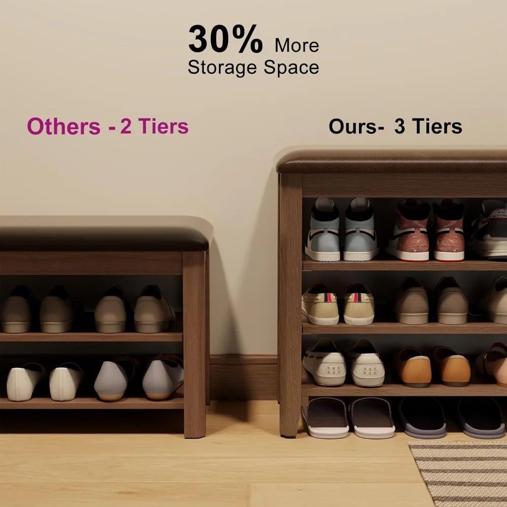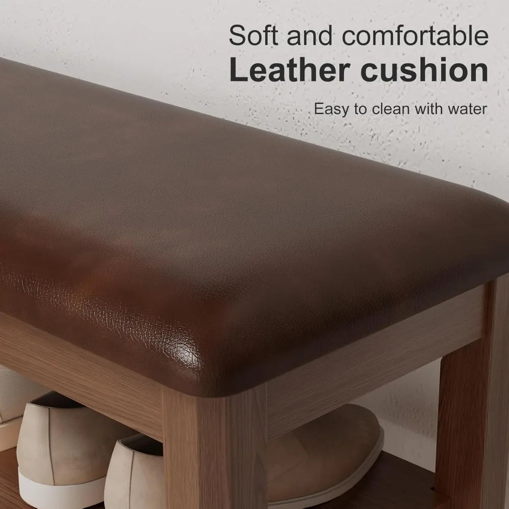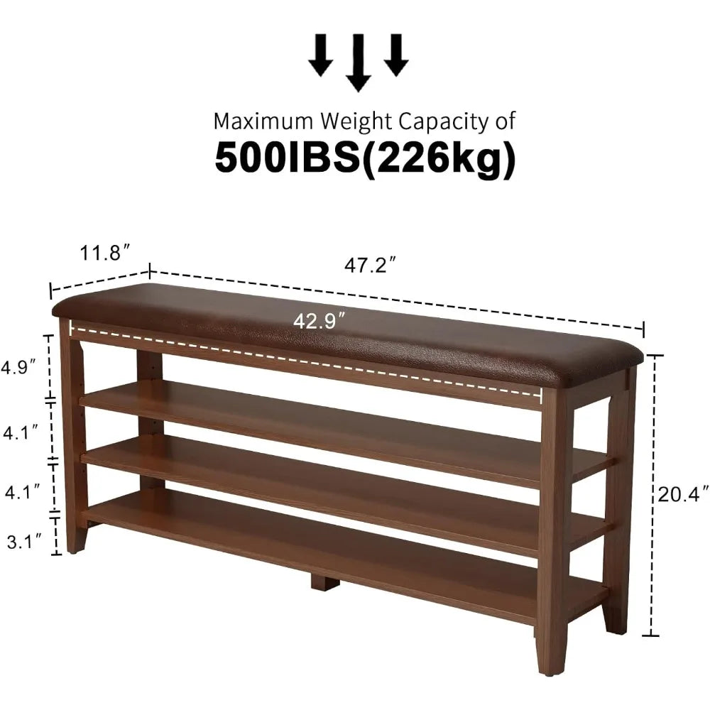 Walnut 3 Tier Adjustable Height Shoe Bench with Leather Cushion for Entryway and Mudroom Storage