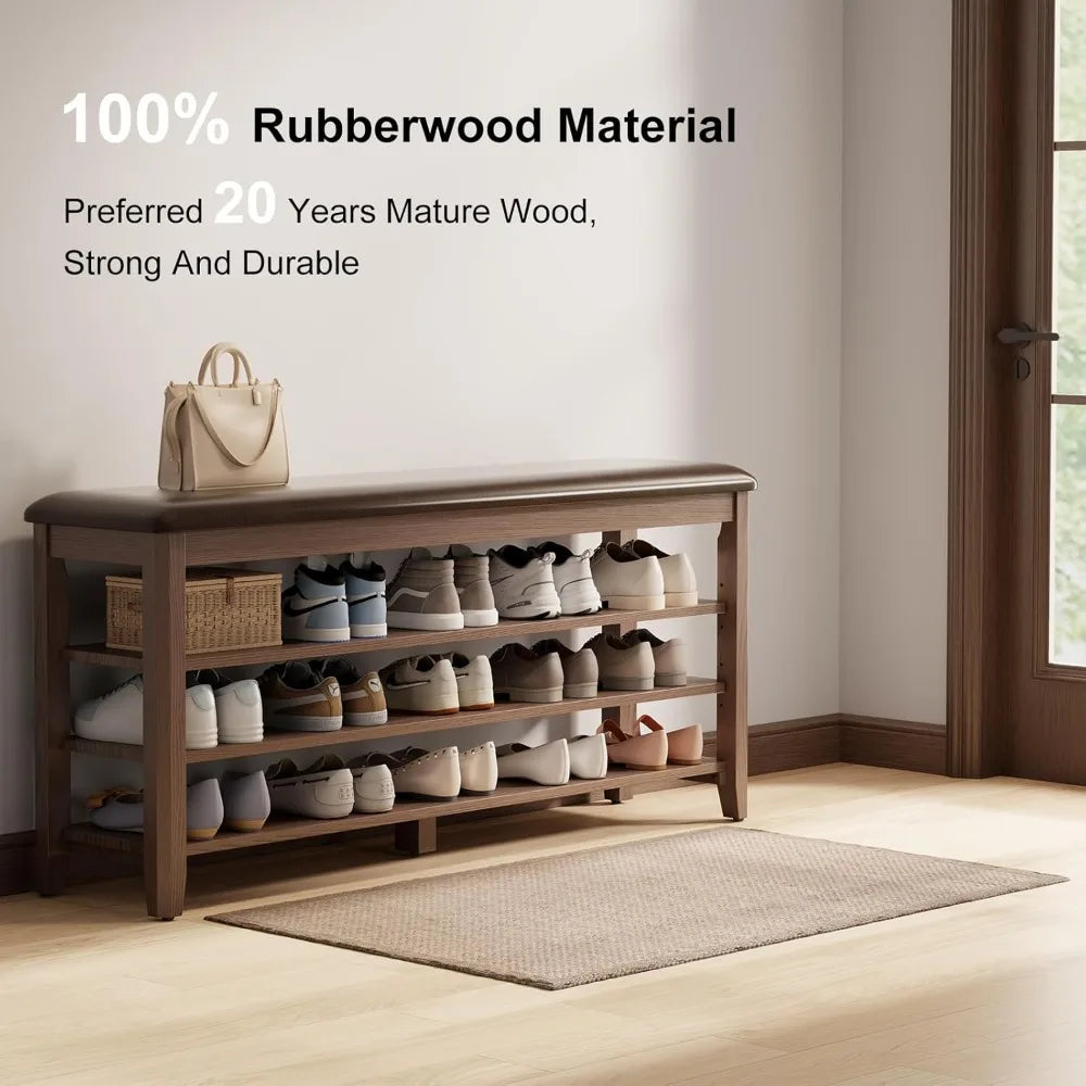 This entryway bench is crafted from 100% sturdy rubberwood, capable of supporting up to 500 lbs, making it perfect for various areas such as entrances, hallways, and mudrooms. Its solid construction ensures durability and stability over time. The bench features a 3-tier shoe storage design, which can accommodate 15-18 pairs of shoes, keeping your entryway organized. The height of the bench is ergonomically designed at 20.47 inches, allowing for comfortable shoe putting on and taking off. It comes with a premium PU leather cushion that is resistant to abrasion, fading, and water, providing a luxurious and comfortable seating experience for daily use. The two tiers of the shoe storage bench are adjustable and removable, allowing you to fit shoes of all sizes, including tall boots and work boots, and customize the storage to suit your needs. Assembly is quick and easy, taking only 15 minutes with detailed instructions and all necessary hardware included. The product also comes with a one-year warranty for your peace of mind.