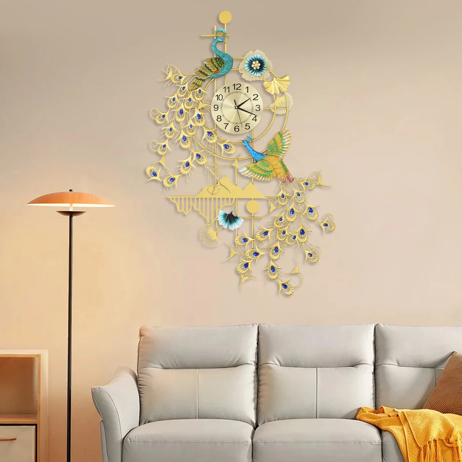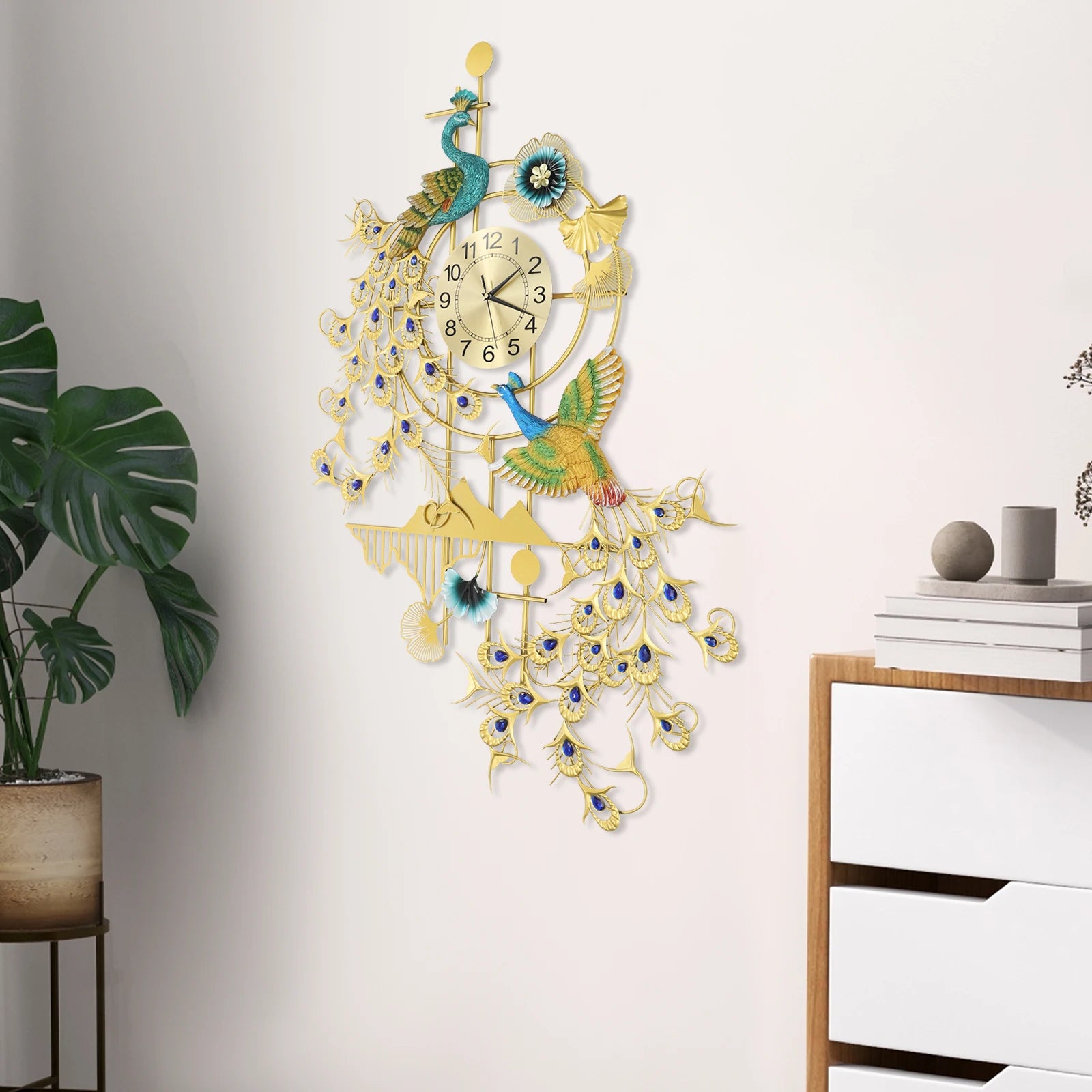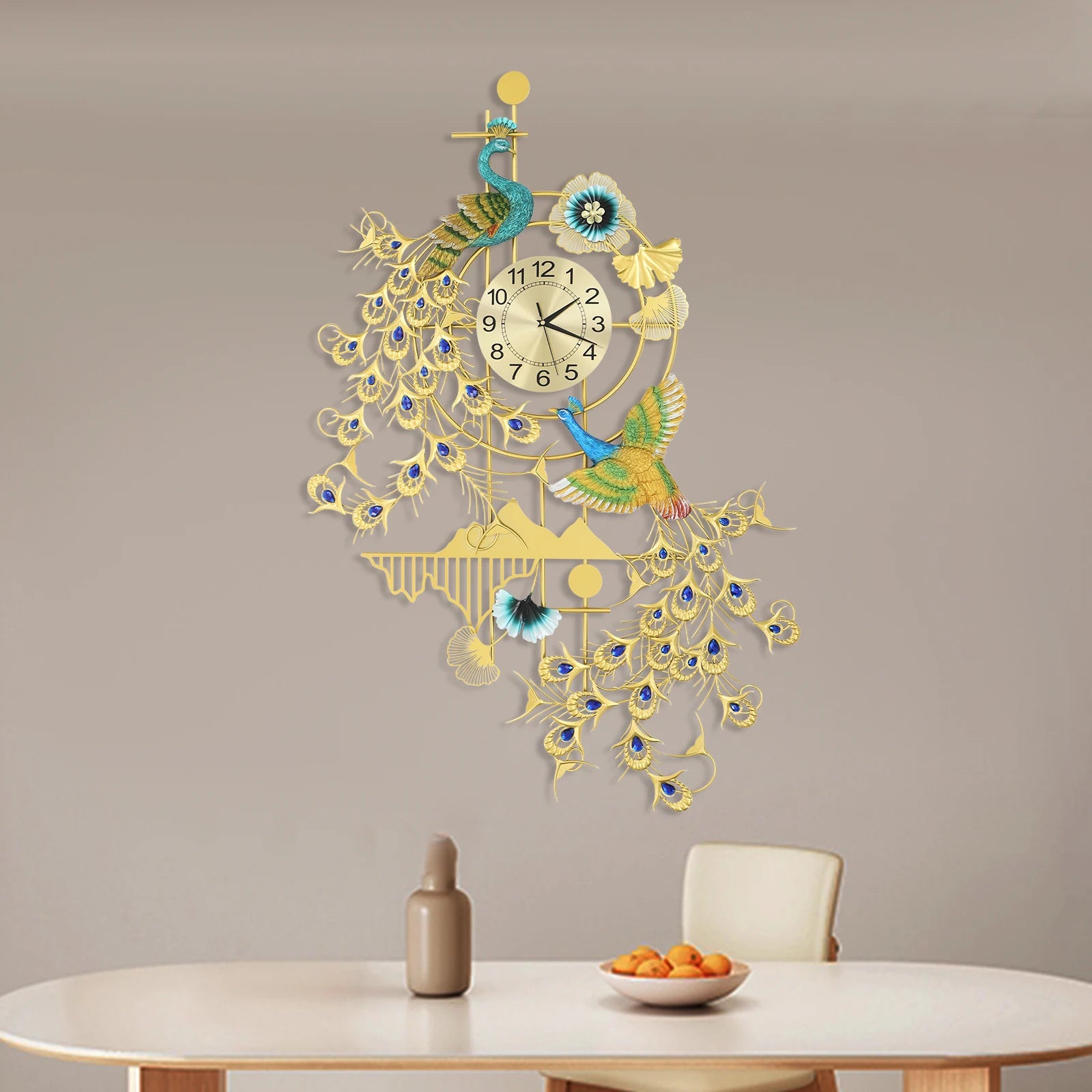Large Peacock Iron Wall Clock Gold Blue Art Wall Clocks 80 120cm