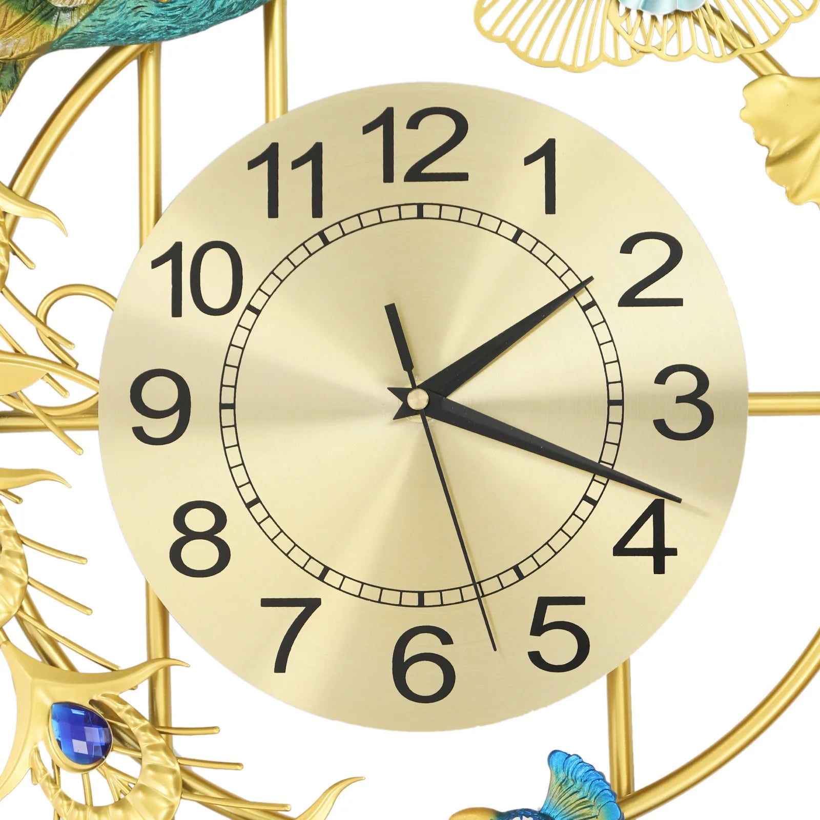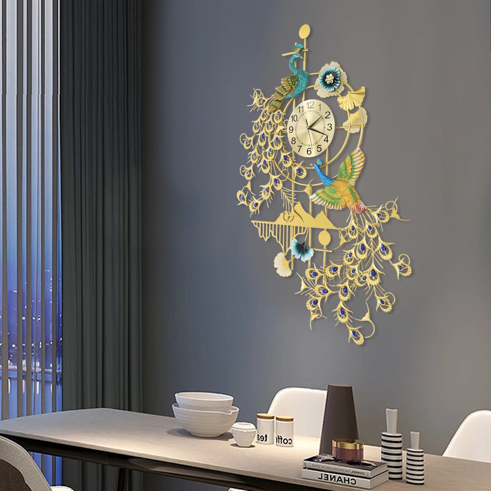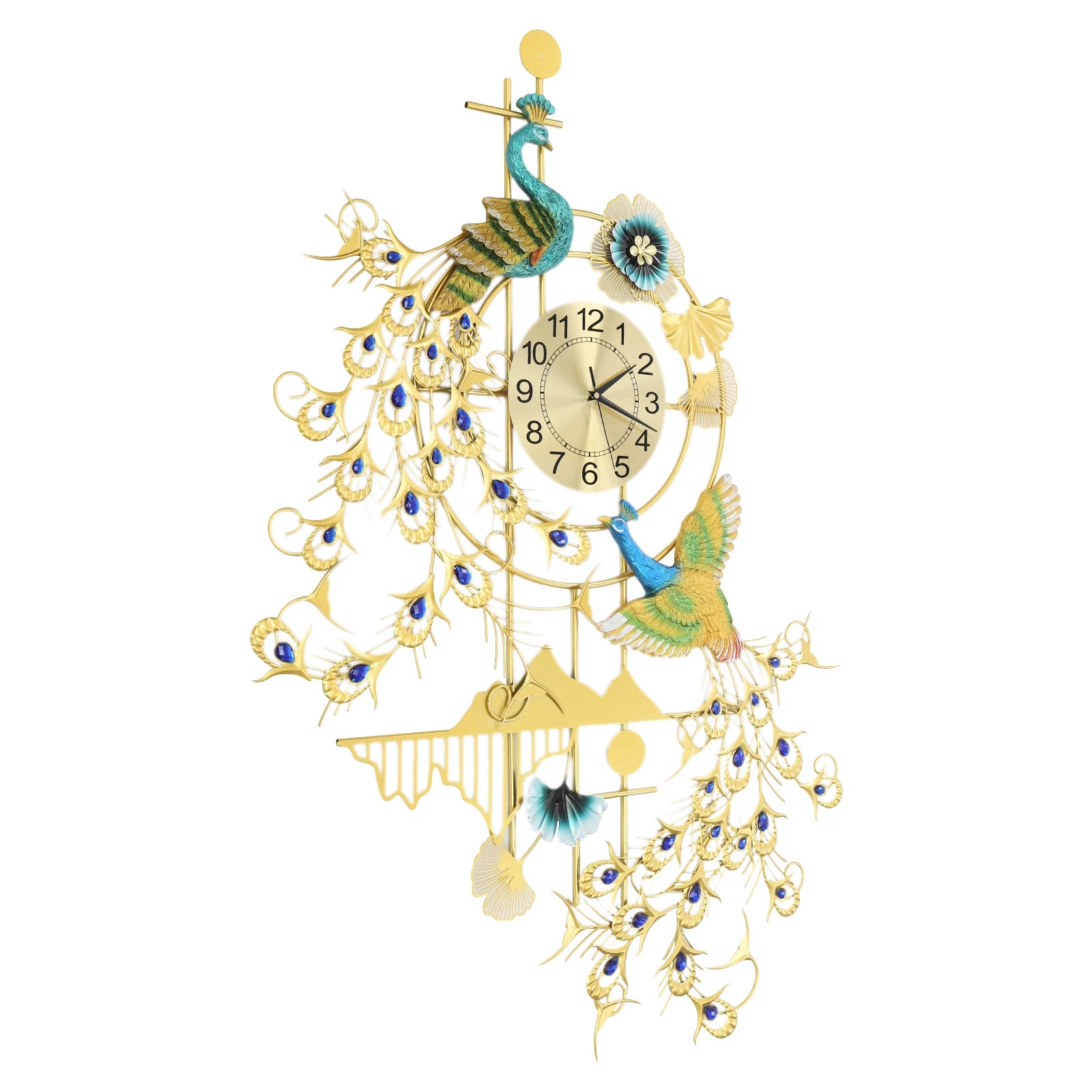 Large Peacock Iron Wall Clock Gold Blue Art Wall Clocks 80 120cm