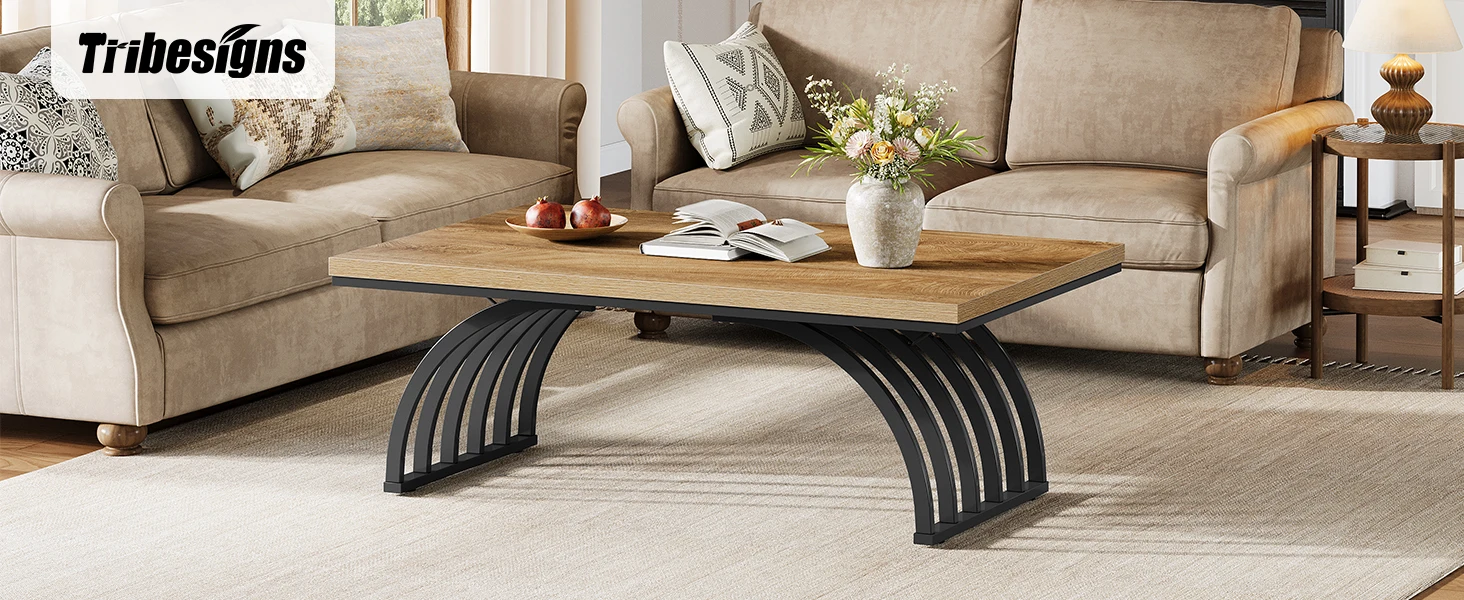 This 47-inch rectangular coffee table creates a warm and inviting living room space. It masterfully blends the rustic charm of wood with the industrial style of a black metal frame, perfectly balancing aesthetics and practicality whether hosting gatherings or enjoying quiet moments of leisure.