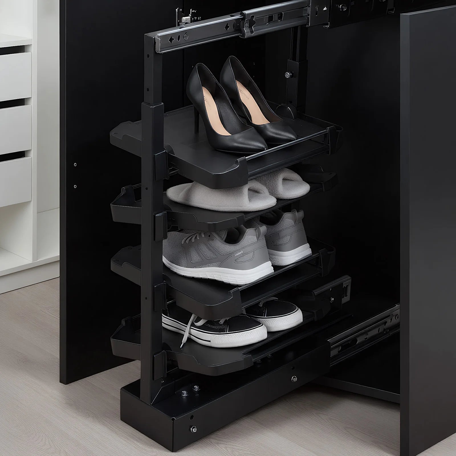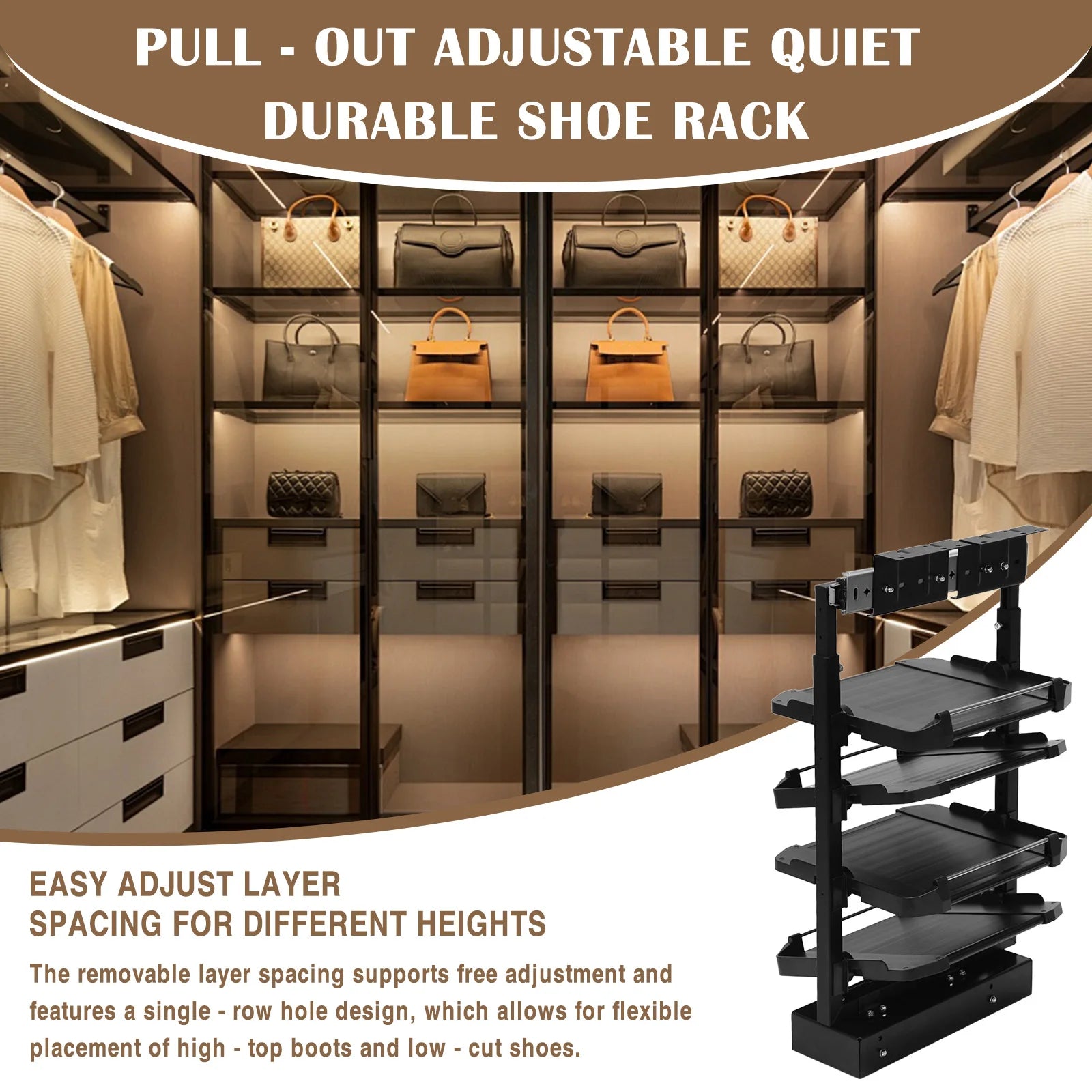 This 333", metal and steel shoestorage brings both functionality and style to your space. The adjustable height lets you adjust it to your preferred height.