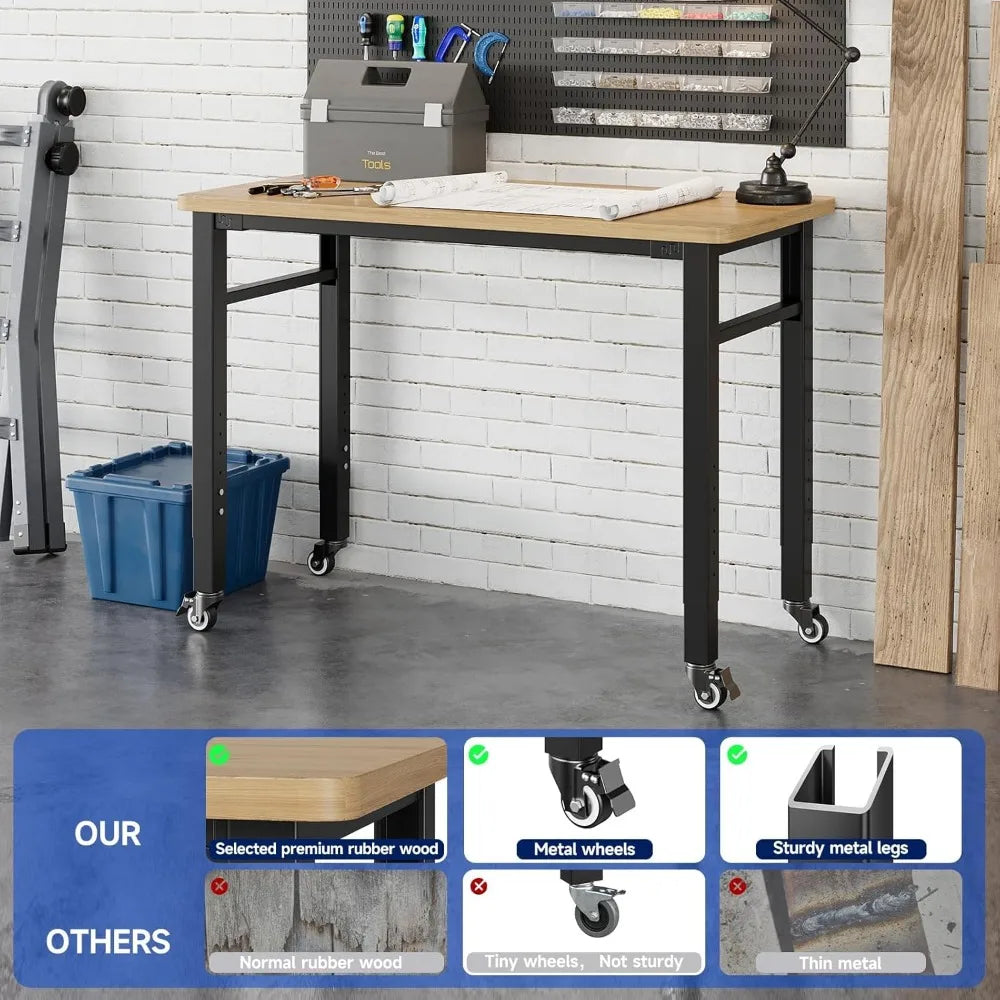 Adjustable Portable Workbench with Wheels Rubber Wood Top - Adjustable Height
