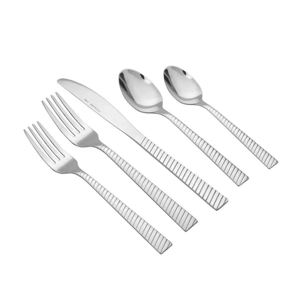 Set includes 20 pieces total - 4 each of dinner forks, salad forks, dinner knives, dinner spoons, and teaspoons