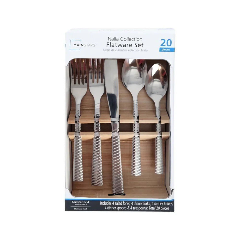 The  Nalla 20 piece flatware set provides full service for 4 people.  Crafted from stainless steel with an elegant silver-toned finish, this affordable flatware features ergonomically designed handles that offer a comfortable grip.  This set is ideal for everyday home dining as well as for college, picnics, camping, RV trips, and outdoor meals.  It includes 4 each of: dinner fork, salad fork, dinner knife, dinner spoon and teaspoon.  Dishwasher safe for easy cleanup.  With simple, timeless styling, the  20 piece Nalla flatware set is perfect for both casual and formal dining.  The durable stainless steel construction and service for 4 make this an ideal starter flatware set.