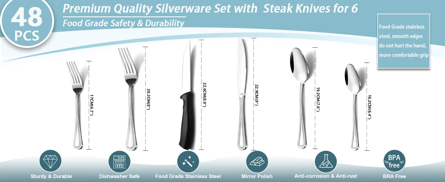 Gymdin 48 pieces forks spoons and knives set is made of more advanced craft as well as better food grade stainless steel with no harmful substances for better quality, which is lead-free and cadmium-free to ensure your health.