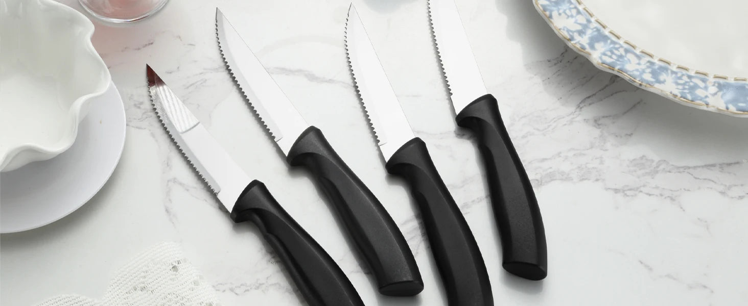 The extra steak knives are equipped with sharp blades, comfortable to hold, which are excellent value for money. So, you don't need to buy steak knives separately, saving you time and effort in selecting them.