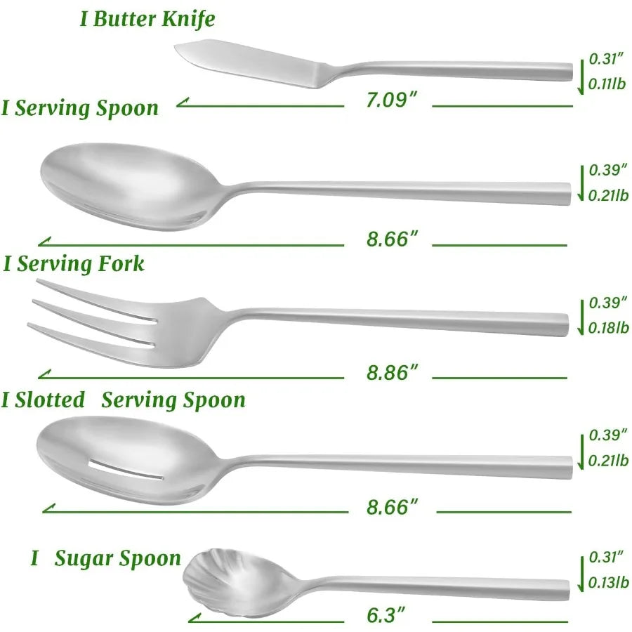 5Piece Silverware Stainless Steel Matte Finished Flatware Thick Heavy Hexagon Cutlery Serving Utensils Set