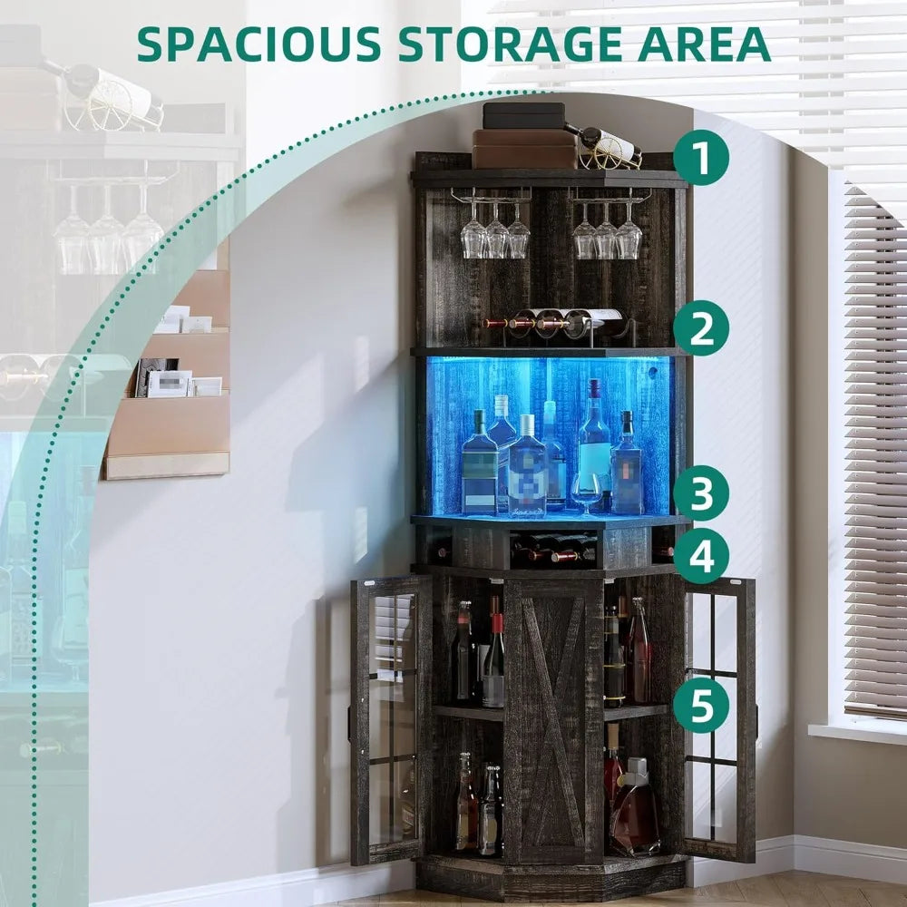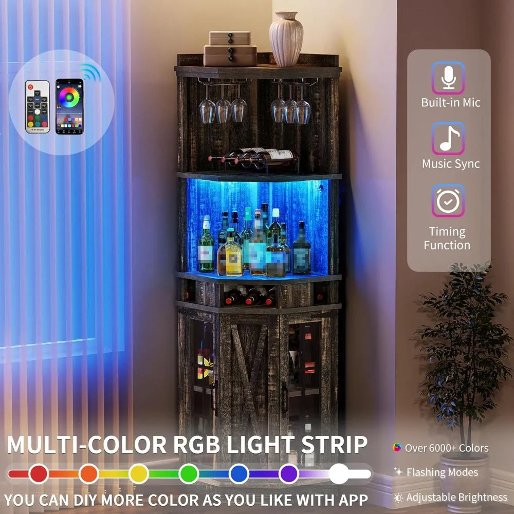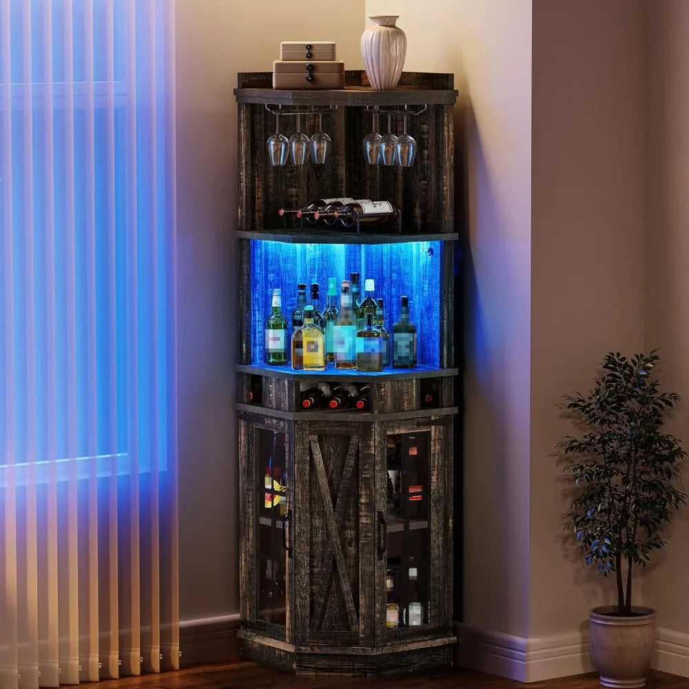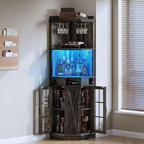 Farmhouse Corner Bar Cabinet with Led Lights Glass