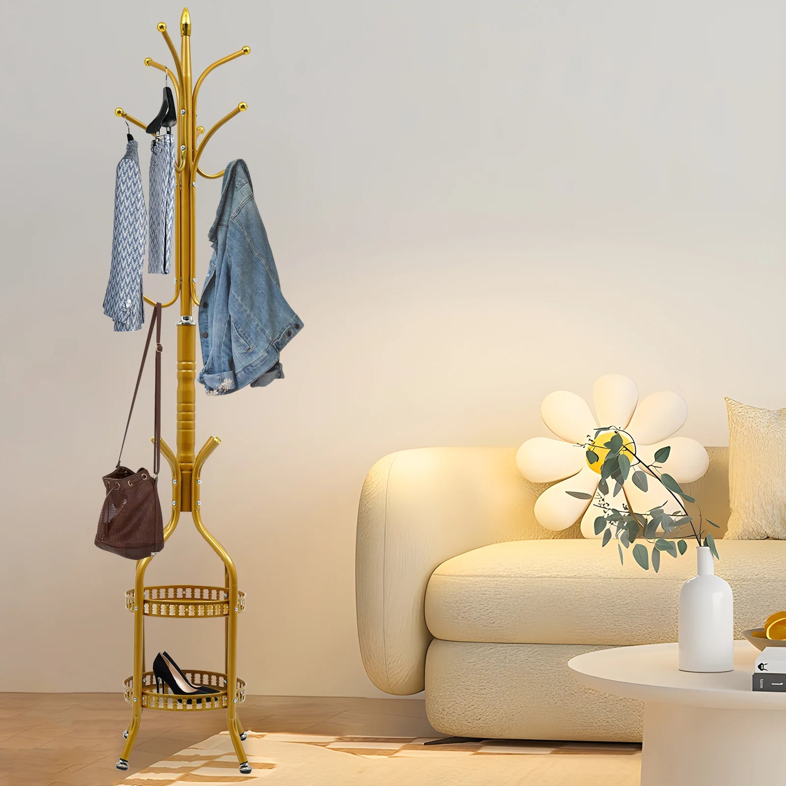 This coat rack combines practicality and artistic beauty. The selection of high-quality materials and fine craftsmanship have built a solid structure and smooth, rounded hanging rod for the product to easily carry your daily coats, hats, and bags. In addition, it is uniquely designed with two shelves underneath, so that home slippers, shoes, umbrellas, shopping bags, and other miscellaneous items can be placed in an orderly manner so that your home space is well organized.