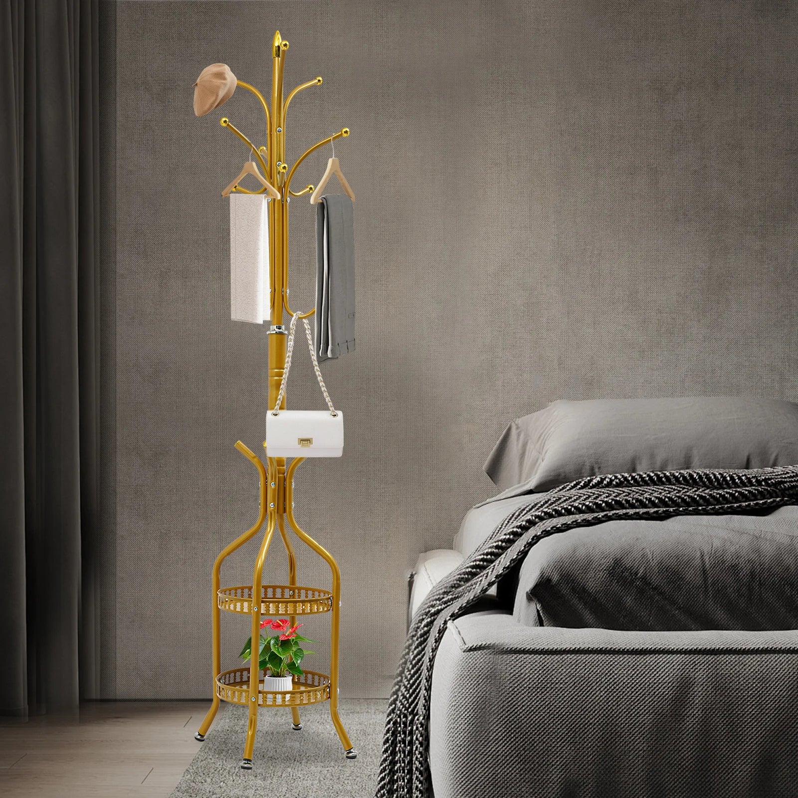 High Space Utilization: The product takes up only a small amount of floor space, which allows it to be placed anywhere in the room to hang your clothes. Multiple hooks, storage baskets, and a multi-tier design allow it to hang a variety of hats, coats, and short-sleeved clothing and place your umbrellas, shopping bags, and other miscellaneous items, greatly improving the utilization of space.