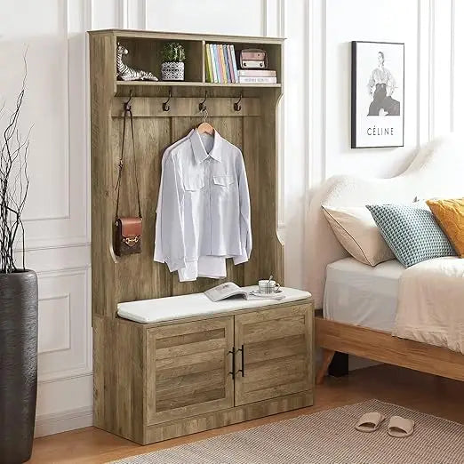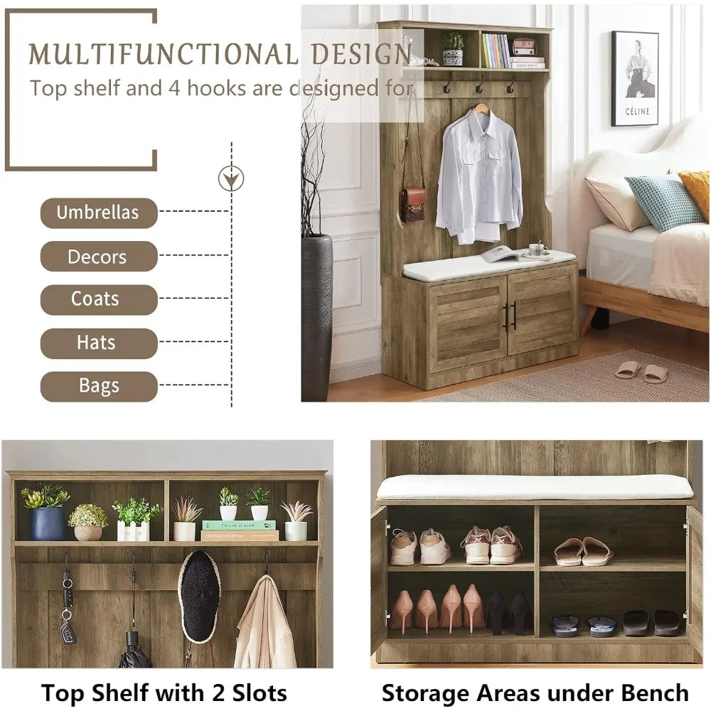 • 3 in 1 Hall Tree with Bench: The freestanding hall tree for entryway combines coat racks, a sitting bench and storage shelves at one piece of single furniture. The stool top is equipped with a movable padded cushion to raise your sitting comfort. You can keep your coats, hats, bags and keys at hand and place your photos, books and other decoration on the top shelf