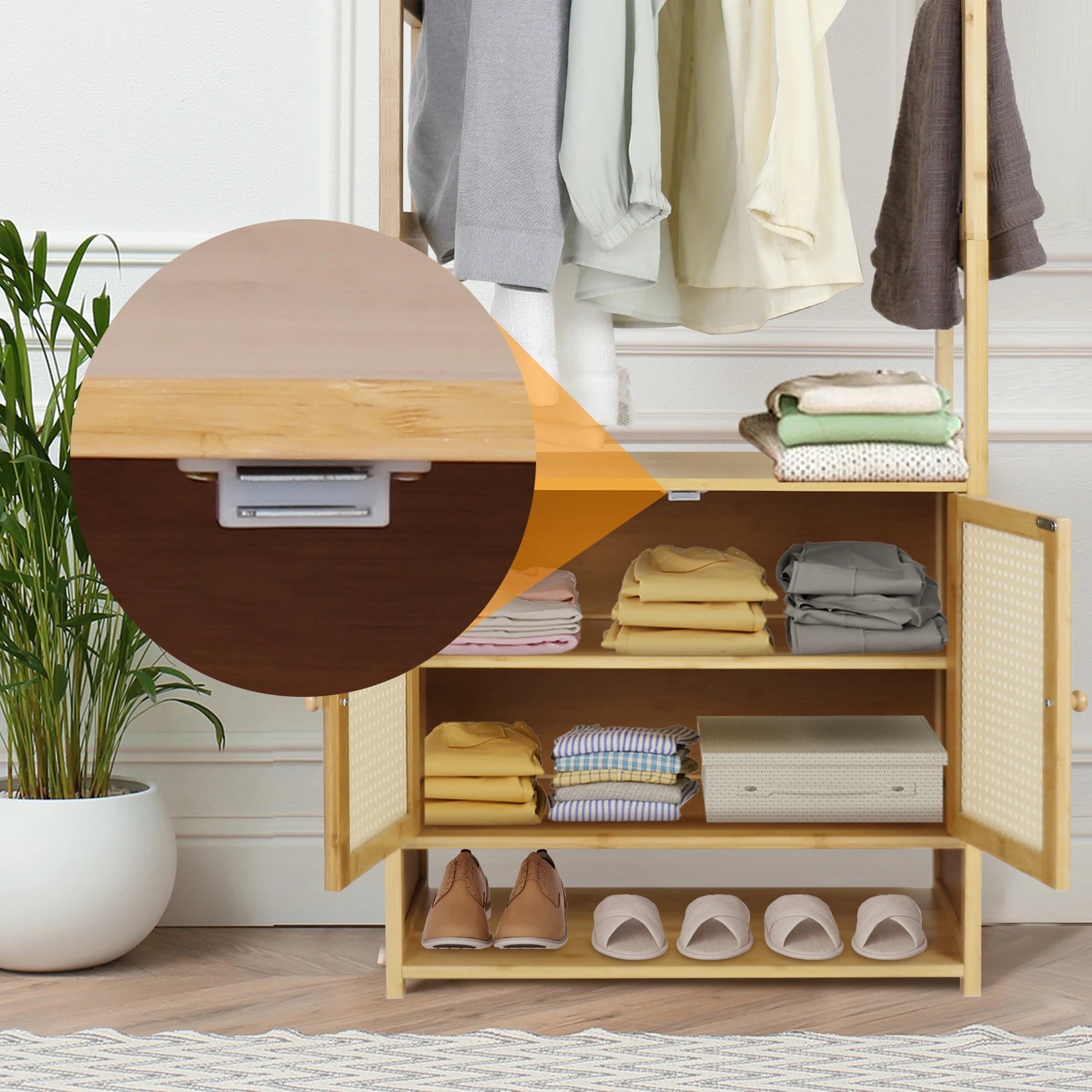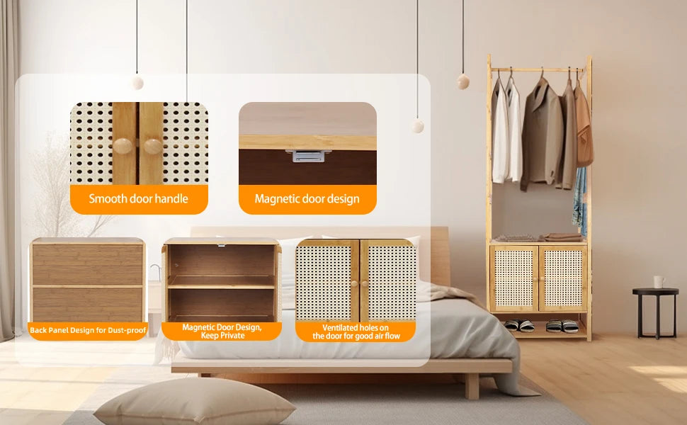 【Practical Clothes Stand】With its hanging rod perfect for hanging different kinds of clothes, coats, dresses, T-shirts, store various stuff, baskets, necessities on the two-tier interior shelves, which has a door that is closed through magnet lock to keep safe and private, also with a bottom area to place shoes, extra side racks for pants, scarves and belts, really maximize your storage and stay organized without mess
