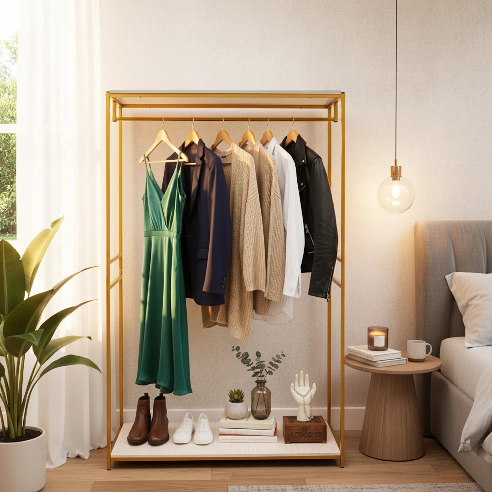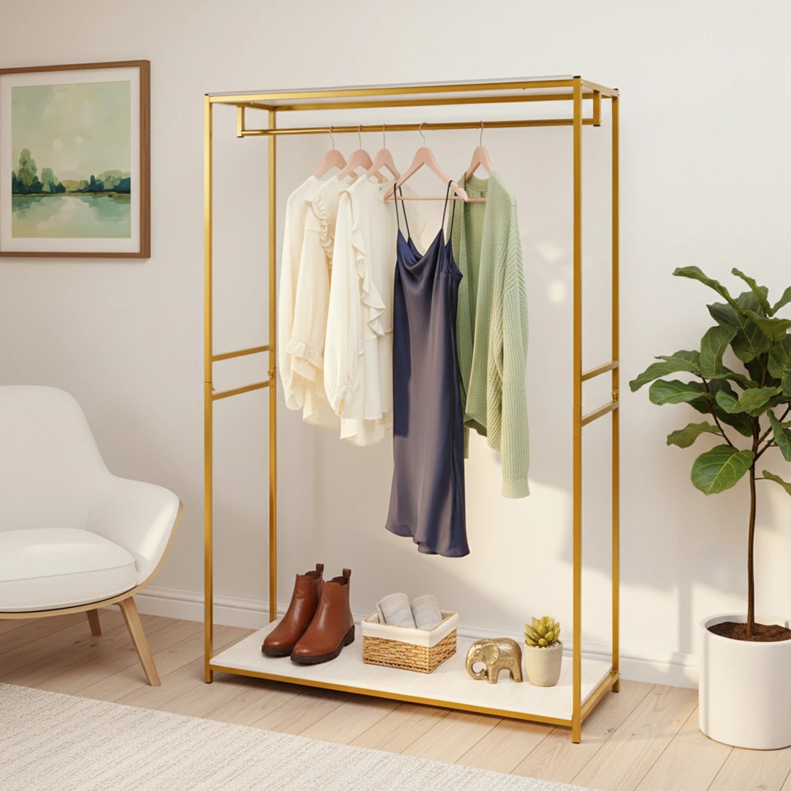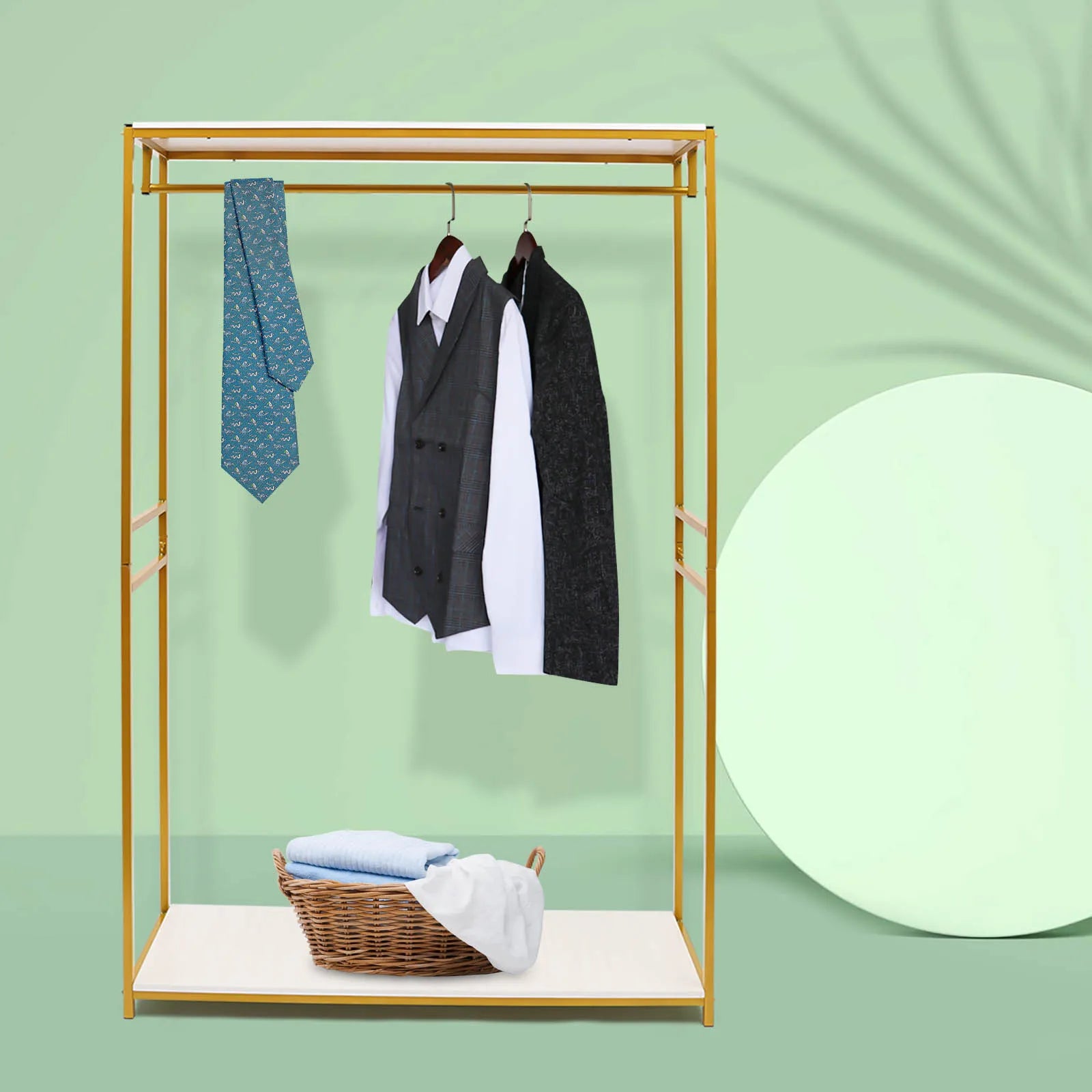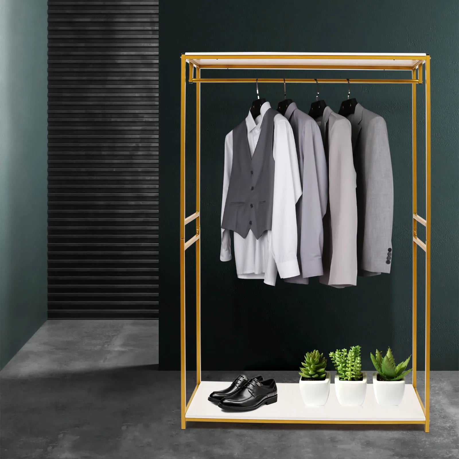 Experience the elegance and practicality of the clothing display rack and make your clothing displays more eye-catching. Featuring the sleek look of a gold frame, this stylish display is designed to provide you with a clothing display solution that is both beautiful and functional. Whether in a boutique, at a fashion show, or at home, it will help you display your clothing collection better.Key Features