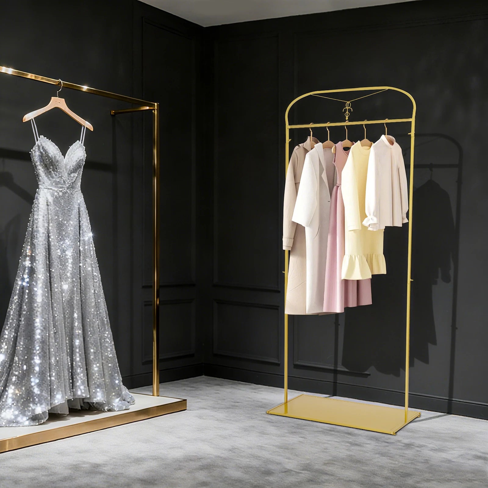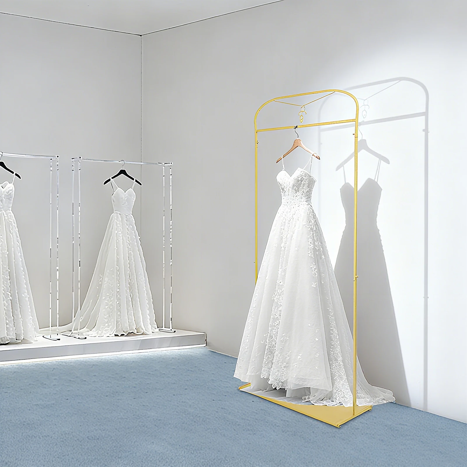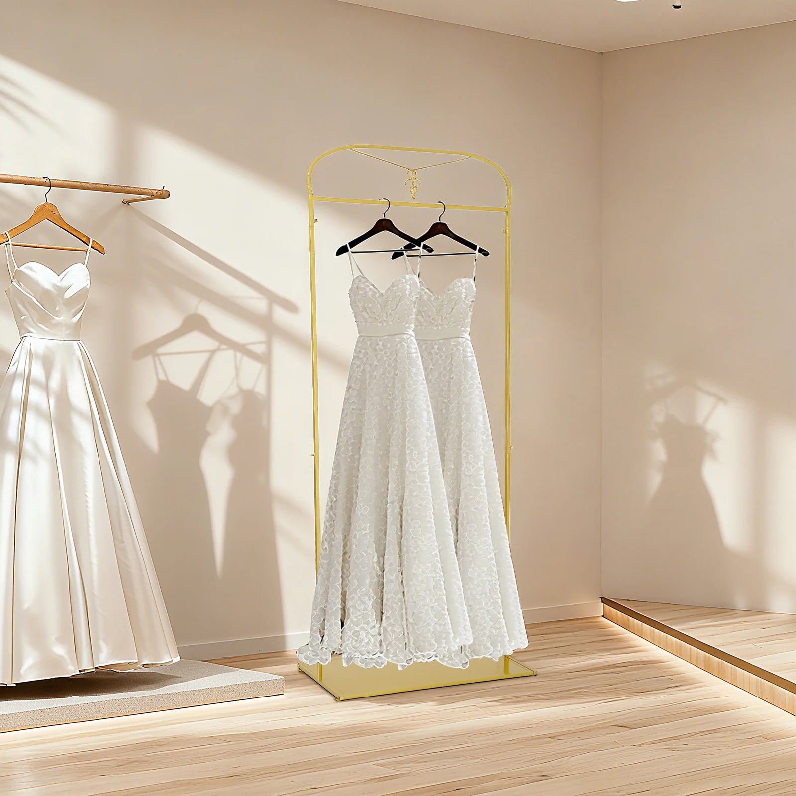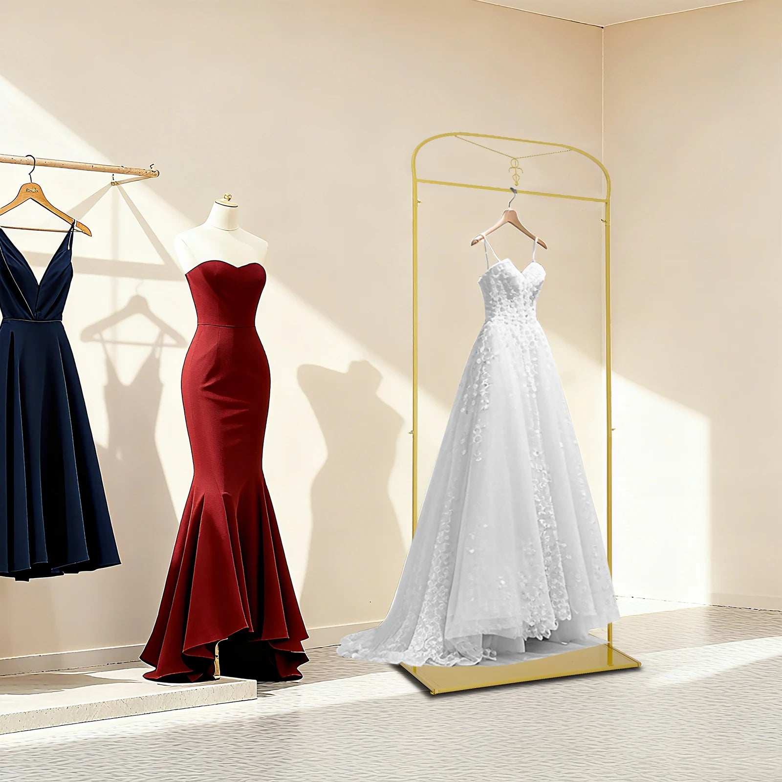 This dress display is both good-looking and high-quality and has stood the test of time with its warm and calm timeless texture. It is made of steel tubing with a nano-baked finish for a long life and corrosion protection. It releases a delicate luster, allowing a warm and quiet atmosphere to permeate your entire space.