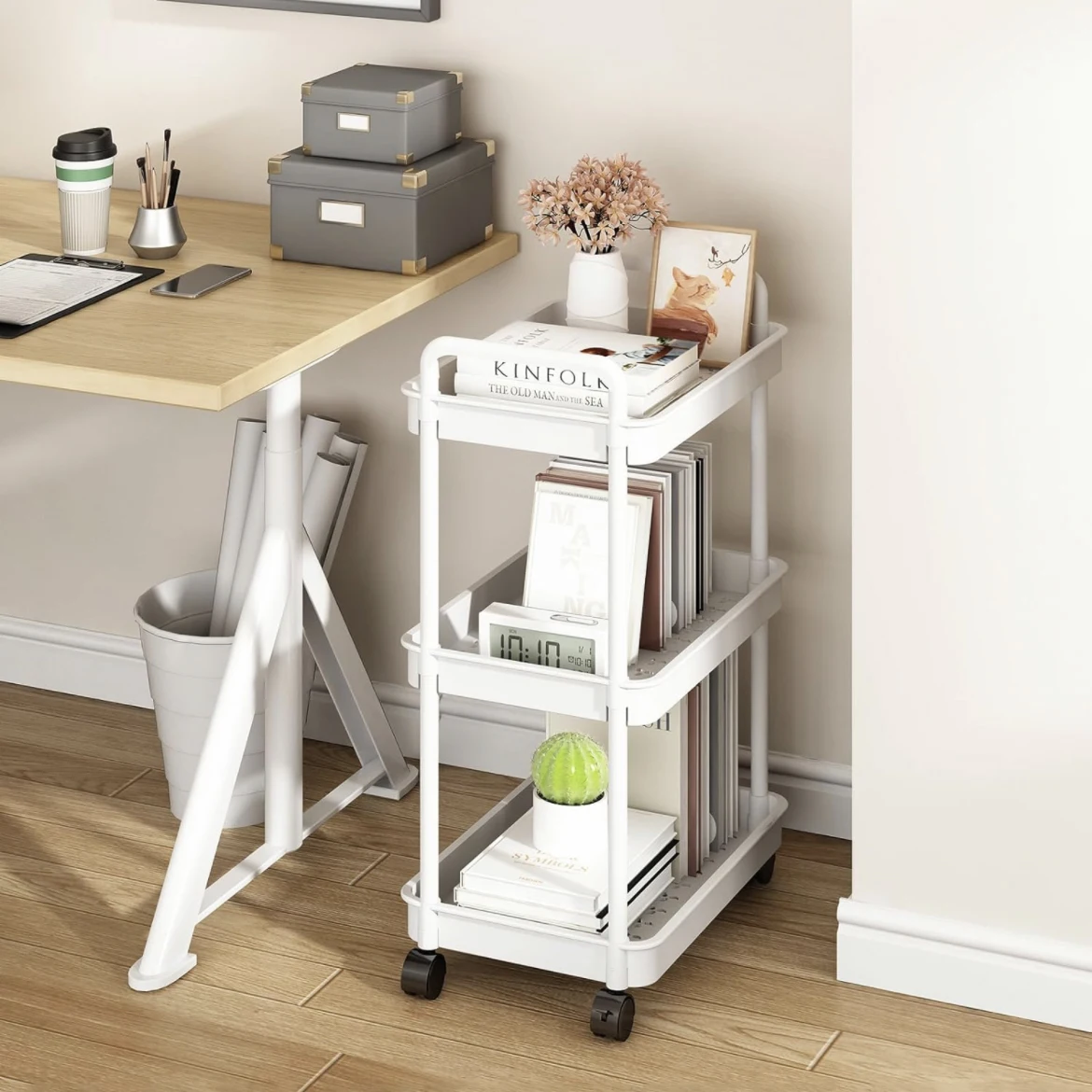 Save Space: It covers most of your needs. Even though it is a narrow space, our organizer cart has 4 large capacity storage baskets to make sure you can hold a lot of things. Also, it is detachable which allows it not just to be put on the floor, but on the table as well.