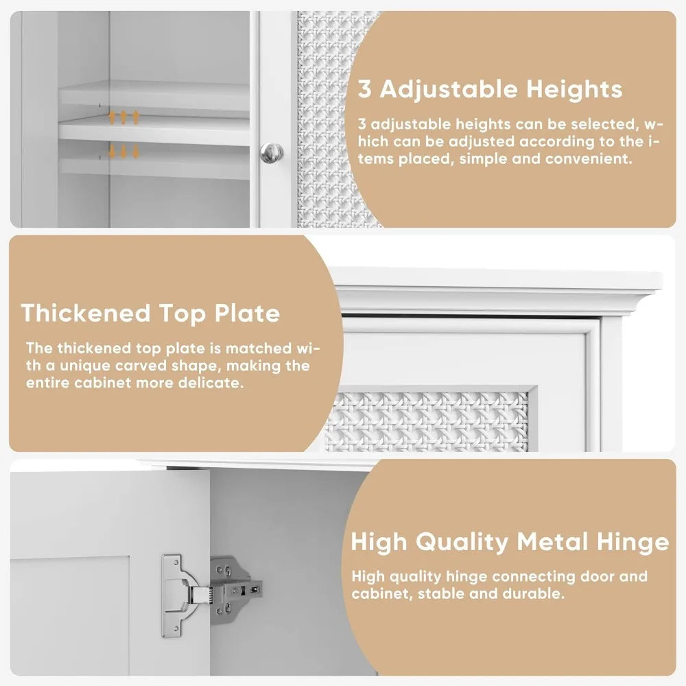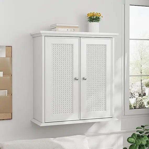 White Bathroom Cabinet Wall Mounted with Rattan Doors Medicine - Adjustable Height