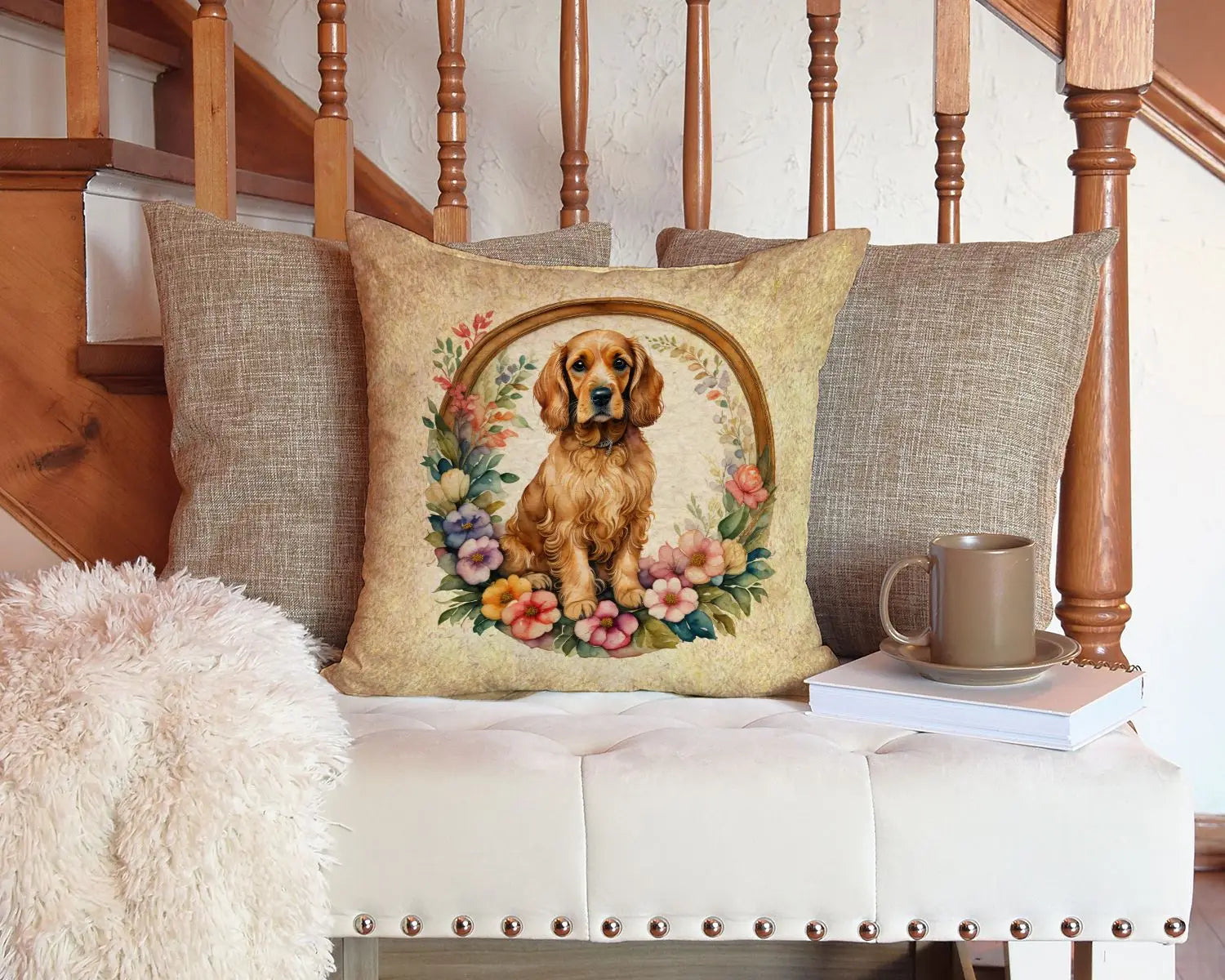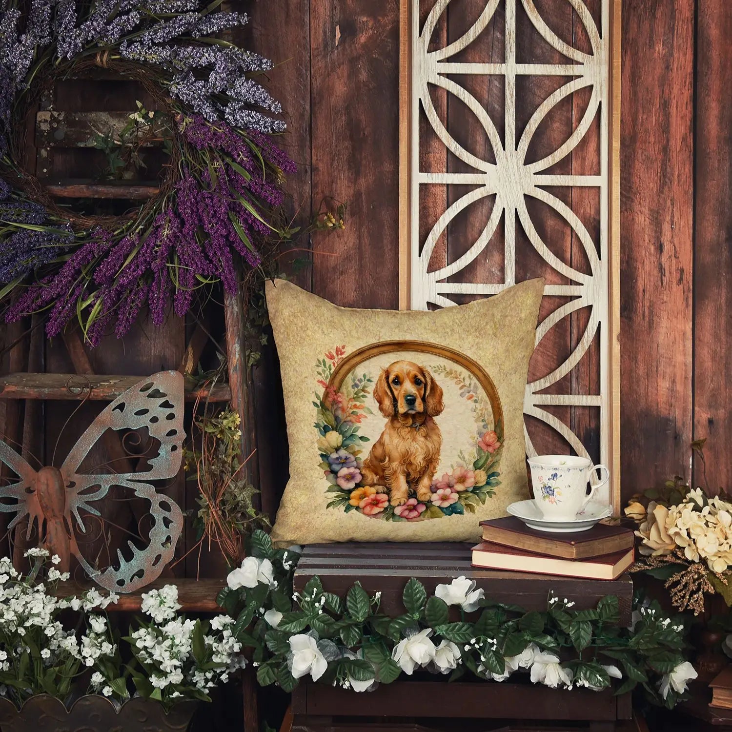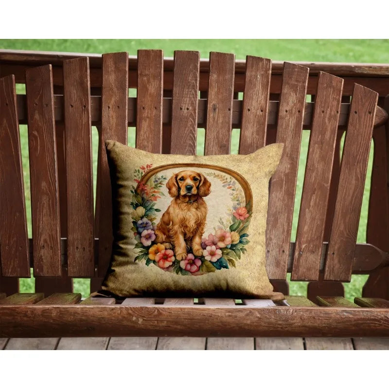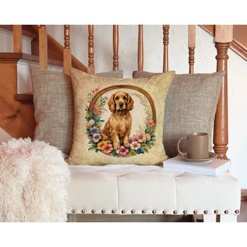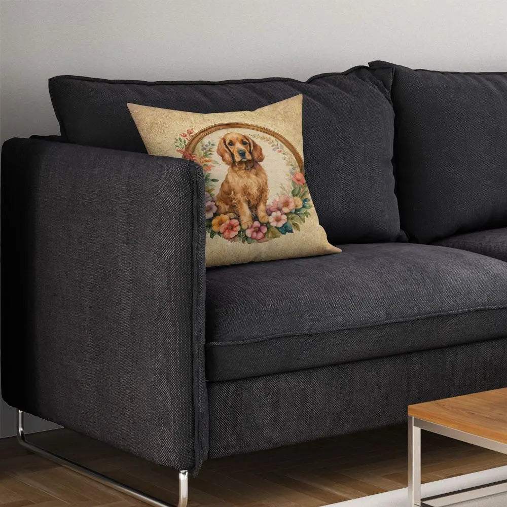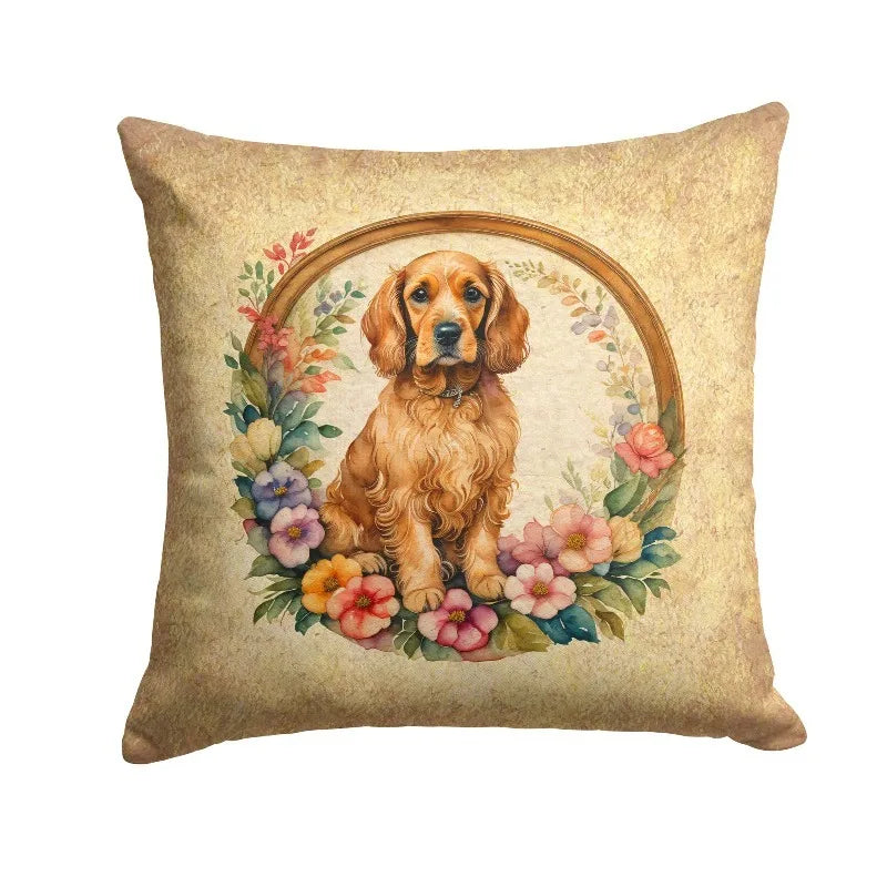 Charming Cocker Spaniel Flowers Throw Pillow 14in Machine Washable