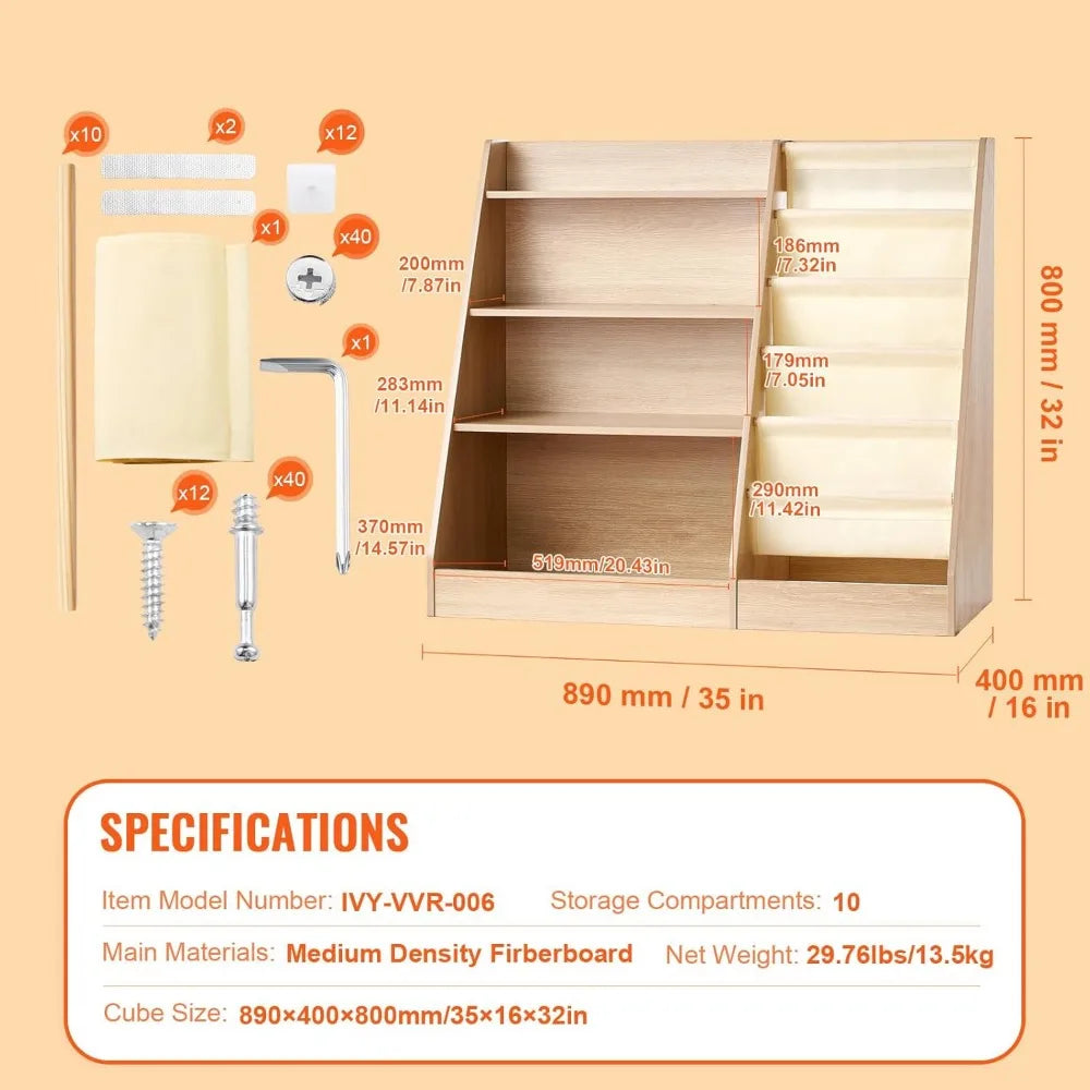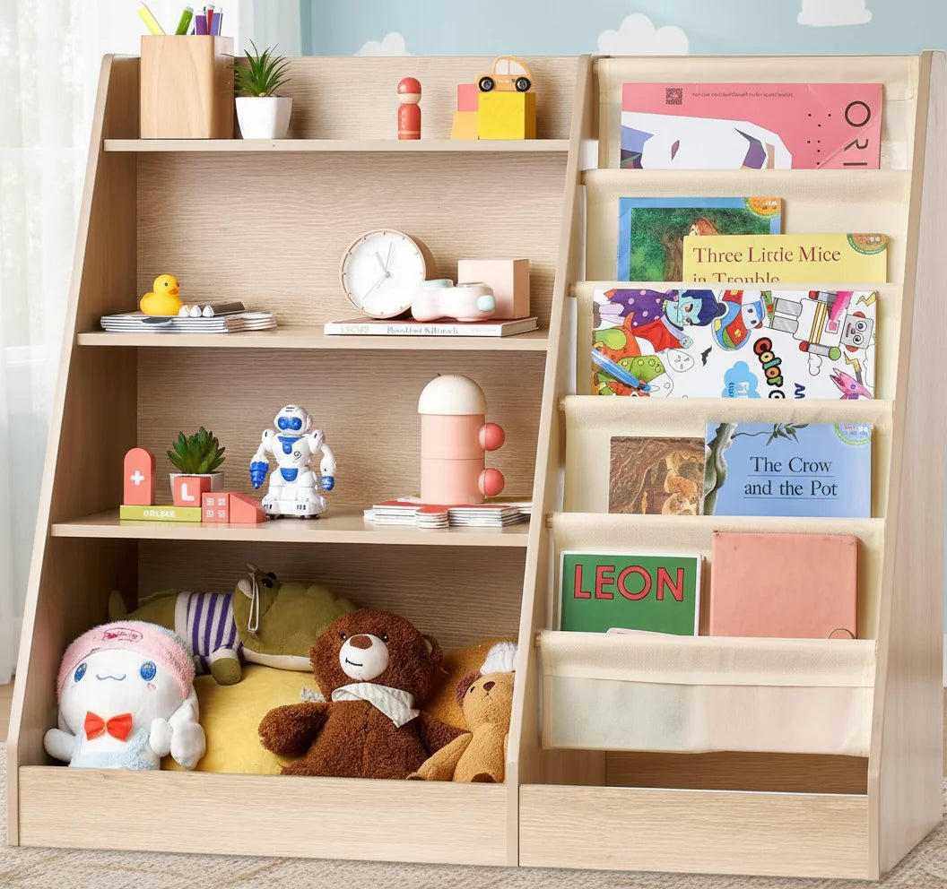Tier Wooden Kids Bookshelf with Toy Storage Layer Sling