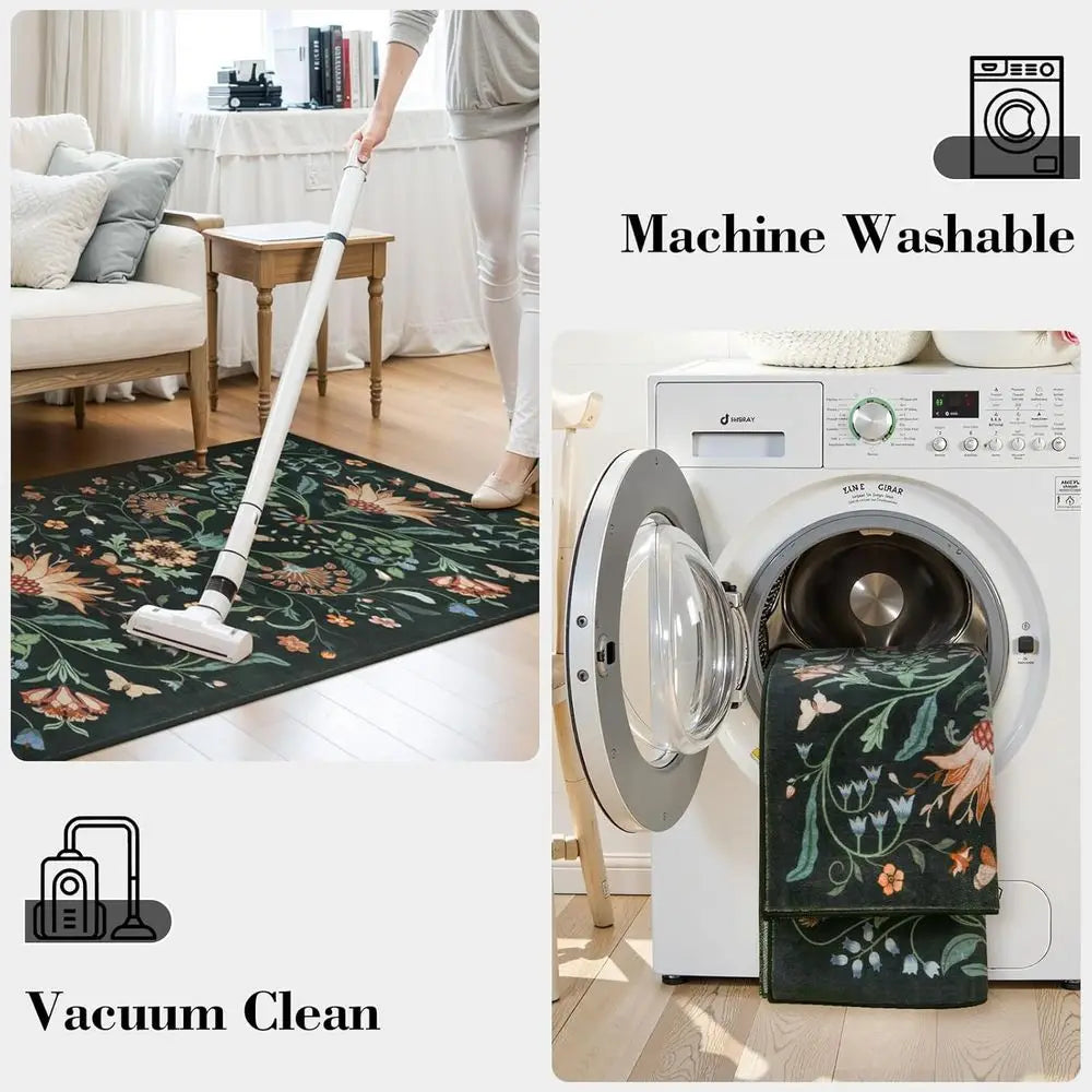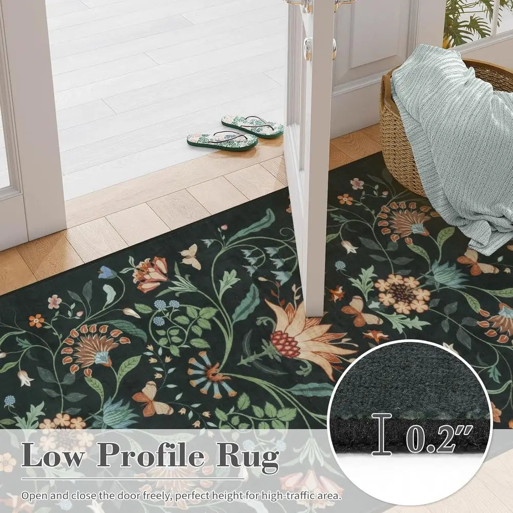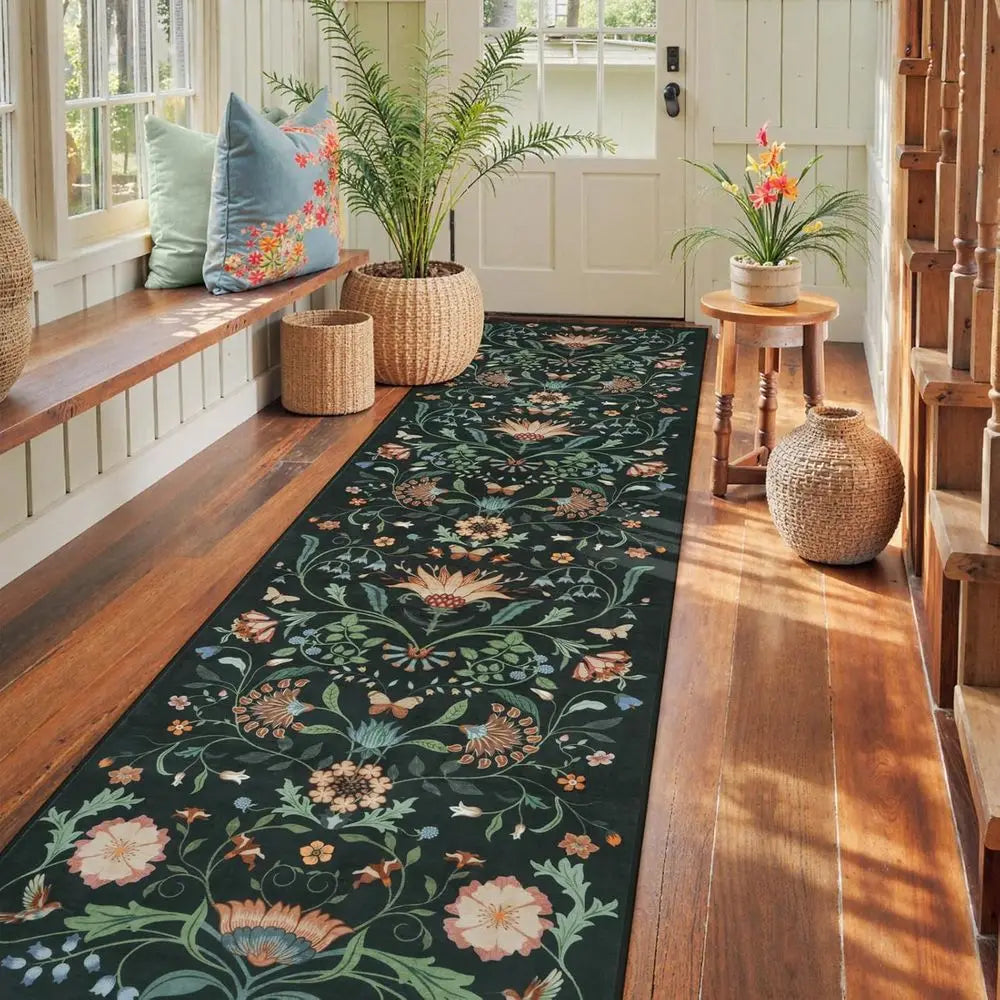 Black Vintage Boho Floral Rug Runner 6ft 10ft Washable