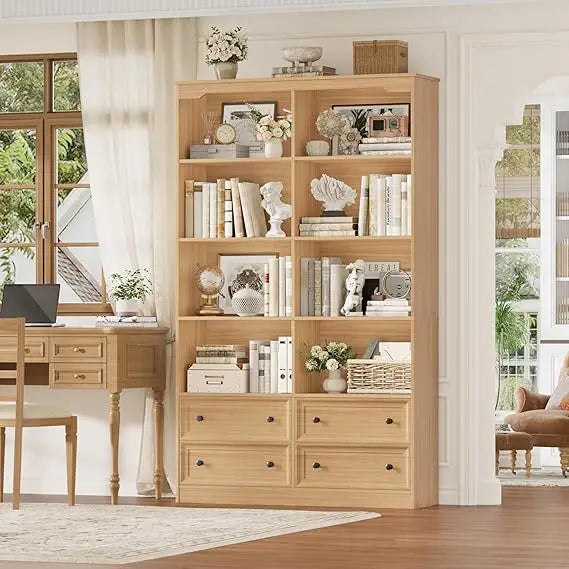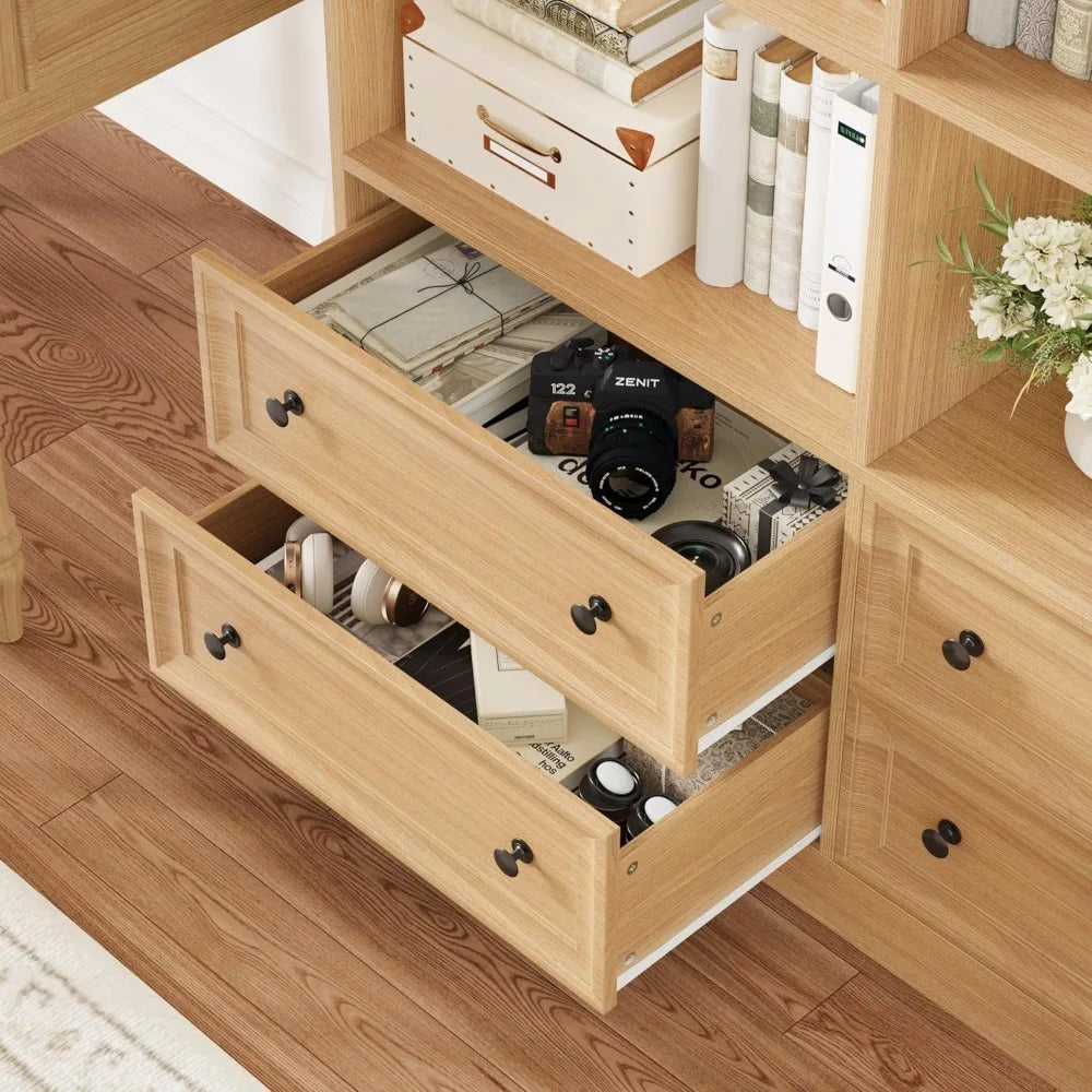 Double Wide Tier Bookshelf with Drawers Large Natural Wooden