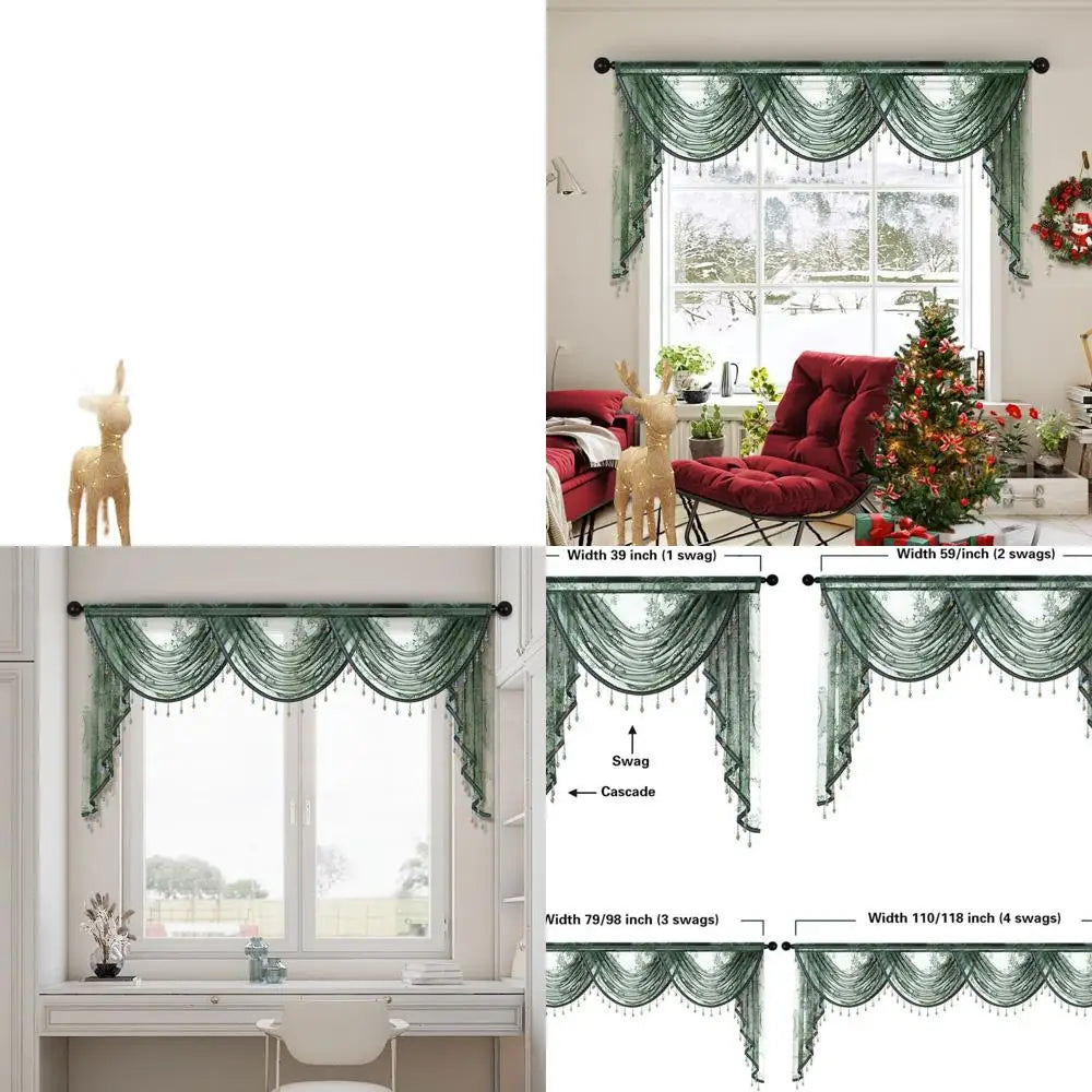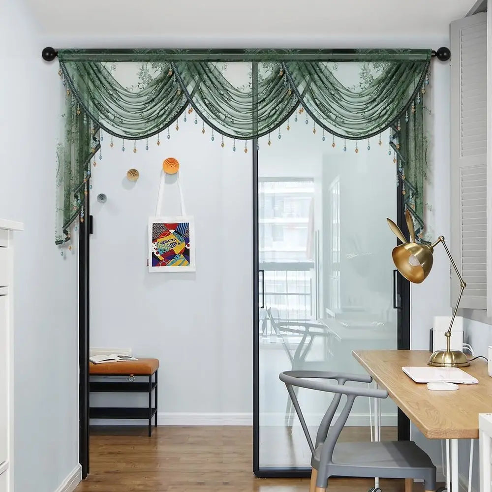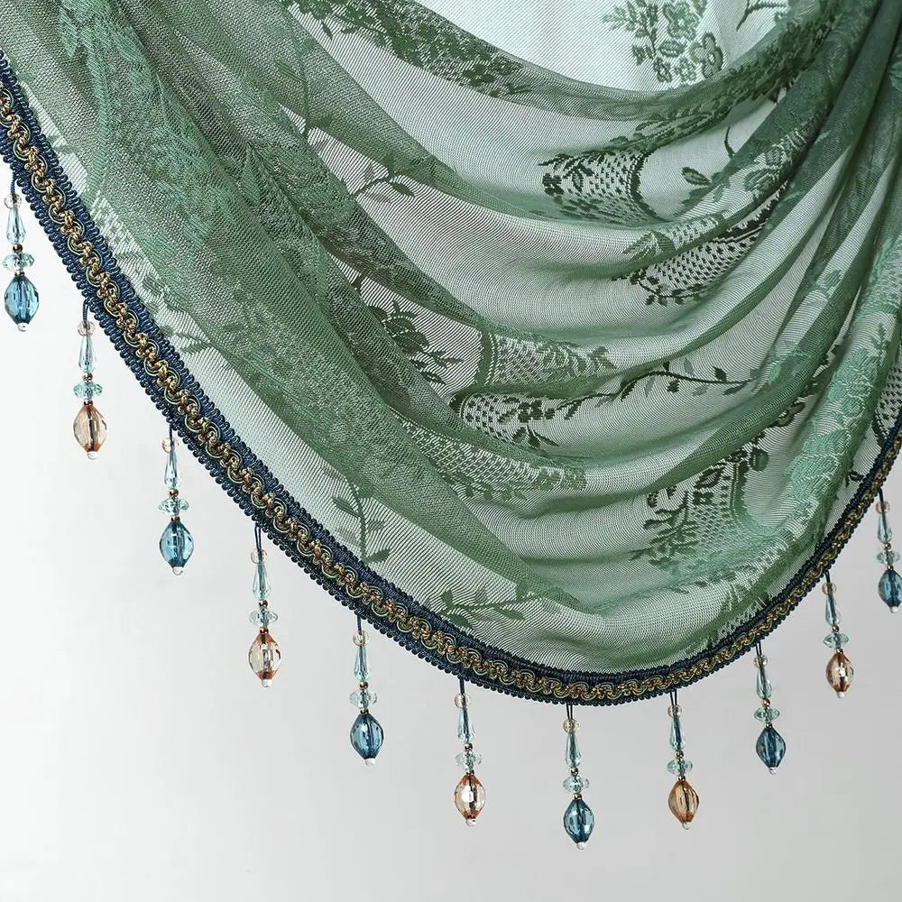 Elegant Green Floral Lace Curtain Valance with Beads Sheer