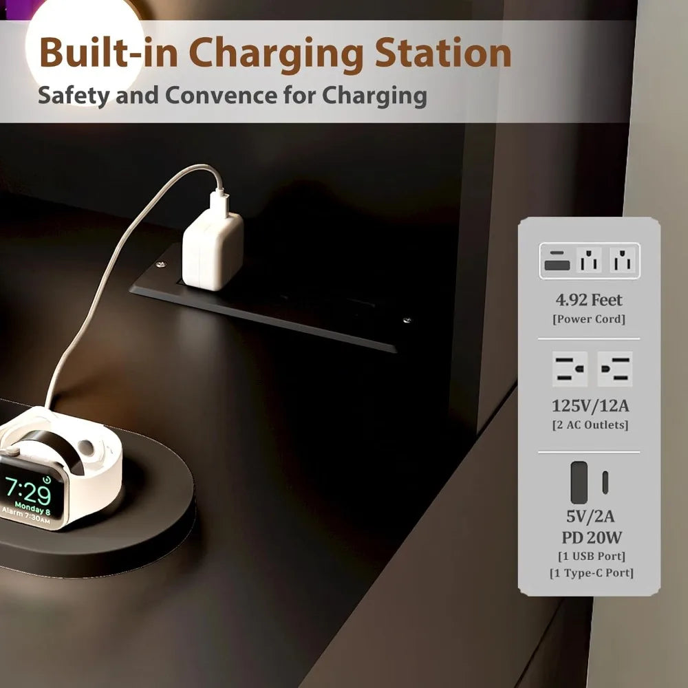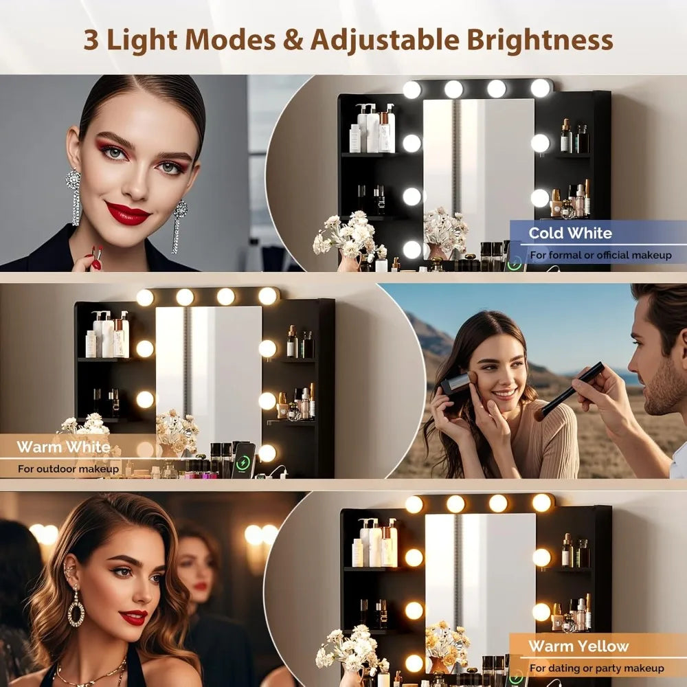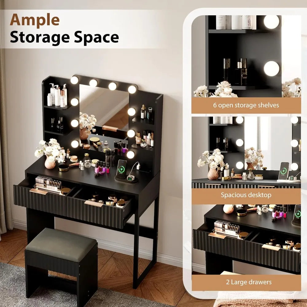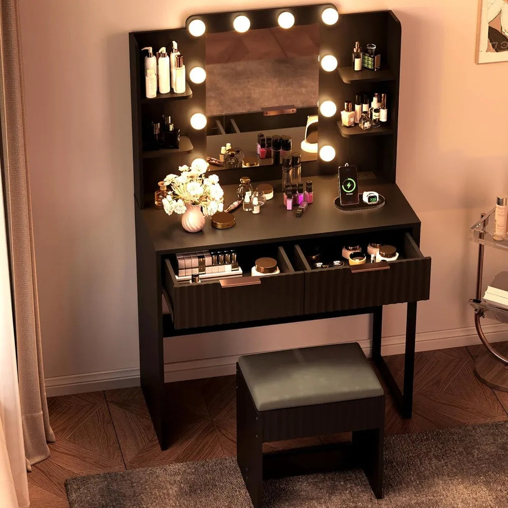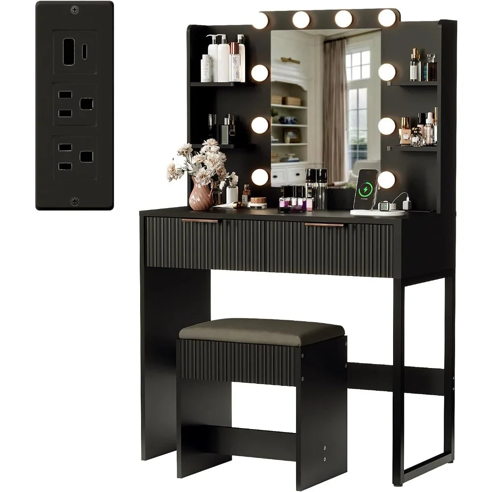 Fluted Makeup Vanity Desk with Mirror Lights Power Outlet