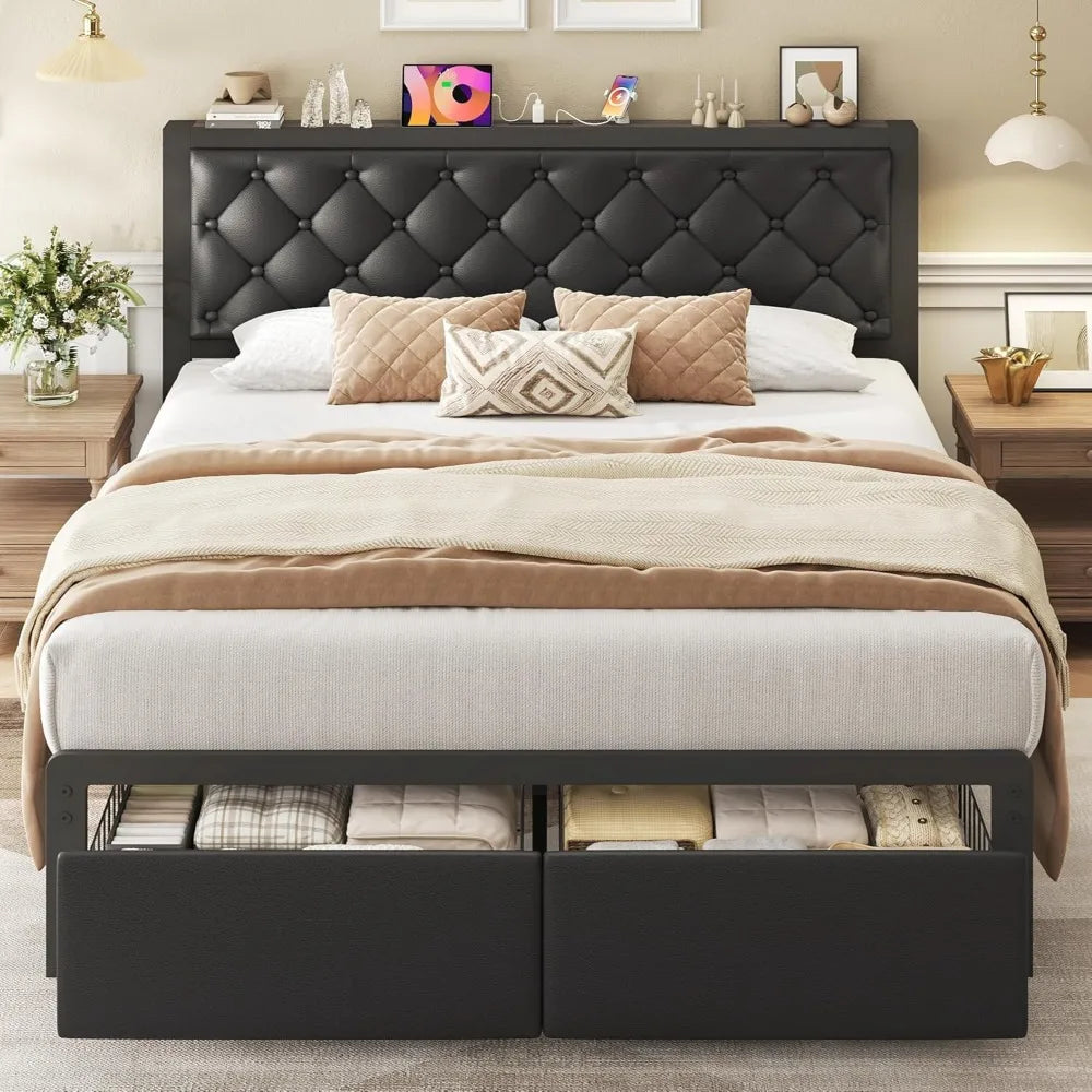 Frame With Storage Drawers Upholstered Headboard Button Tufted Bed (Queen)