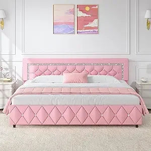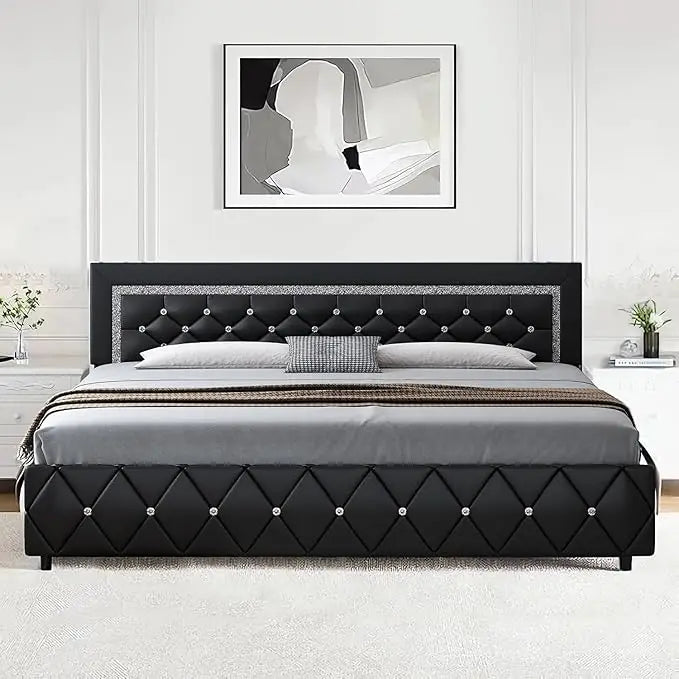 King Bed Frame with Diamond Headboard Faux Leather Upholstered (King)