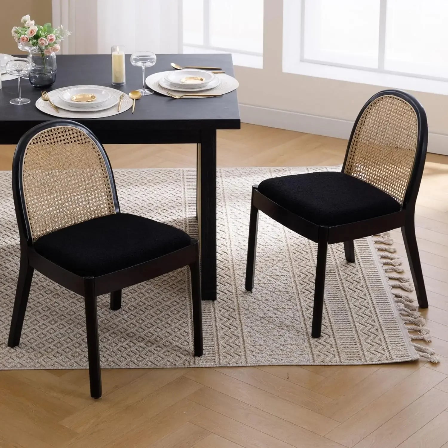 Linen Dining Chairs Set Natural Woven Cane Back Side