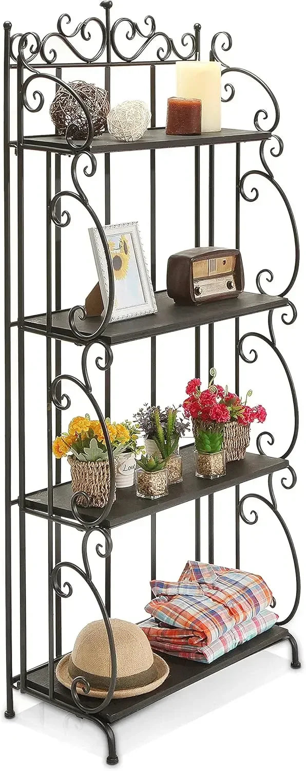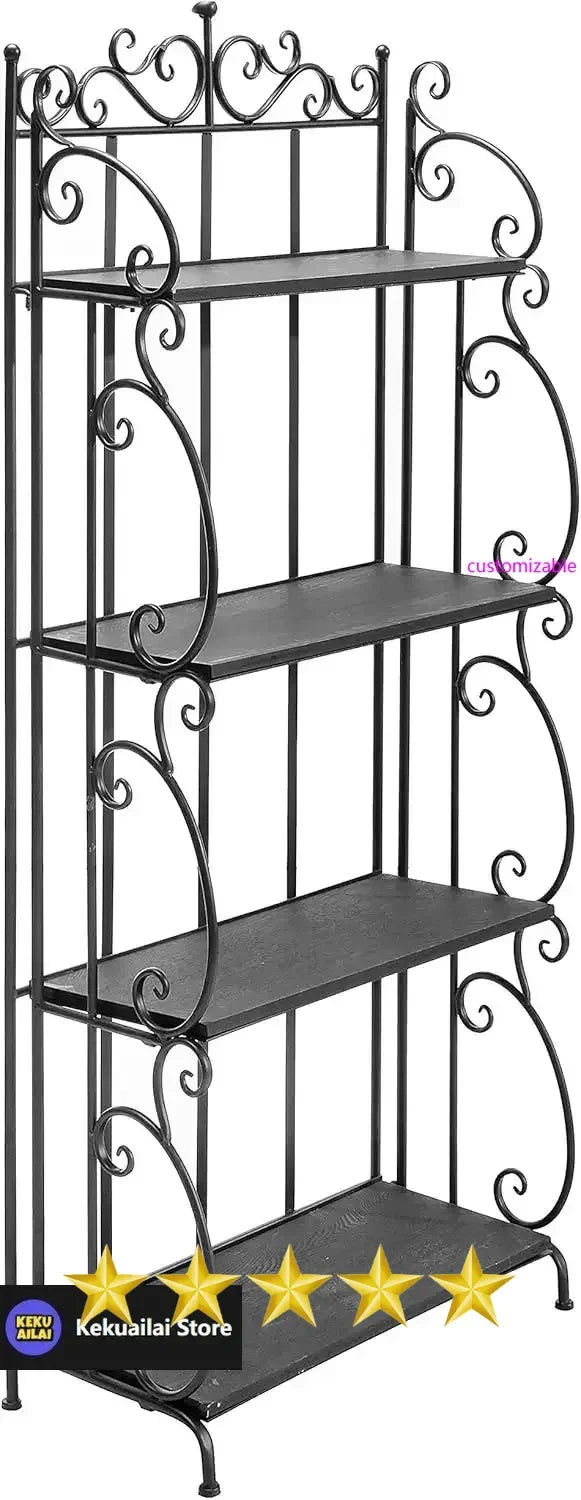 New2025 Black Metal Freestanding Shelf Rack Decorative Bakers Bookshelf