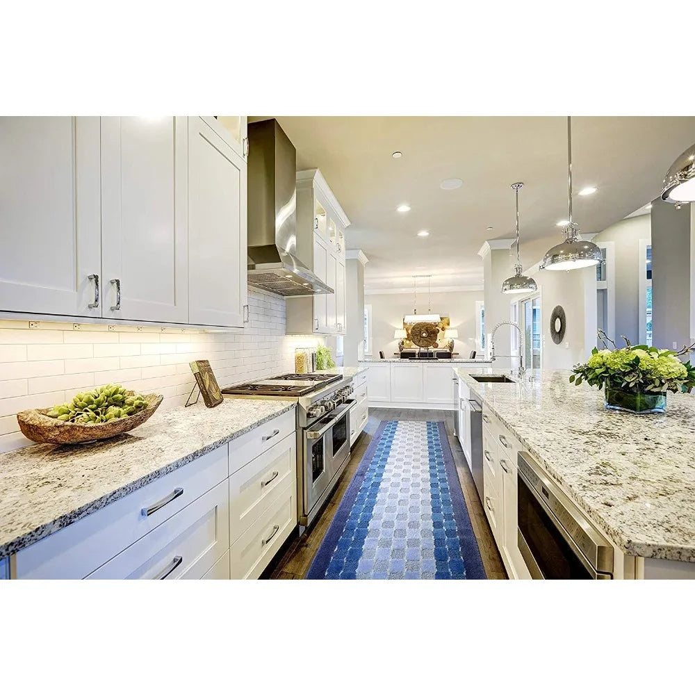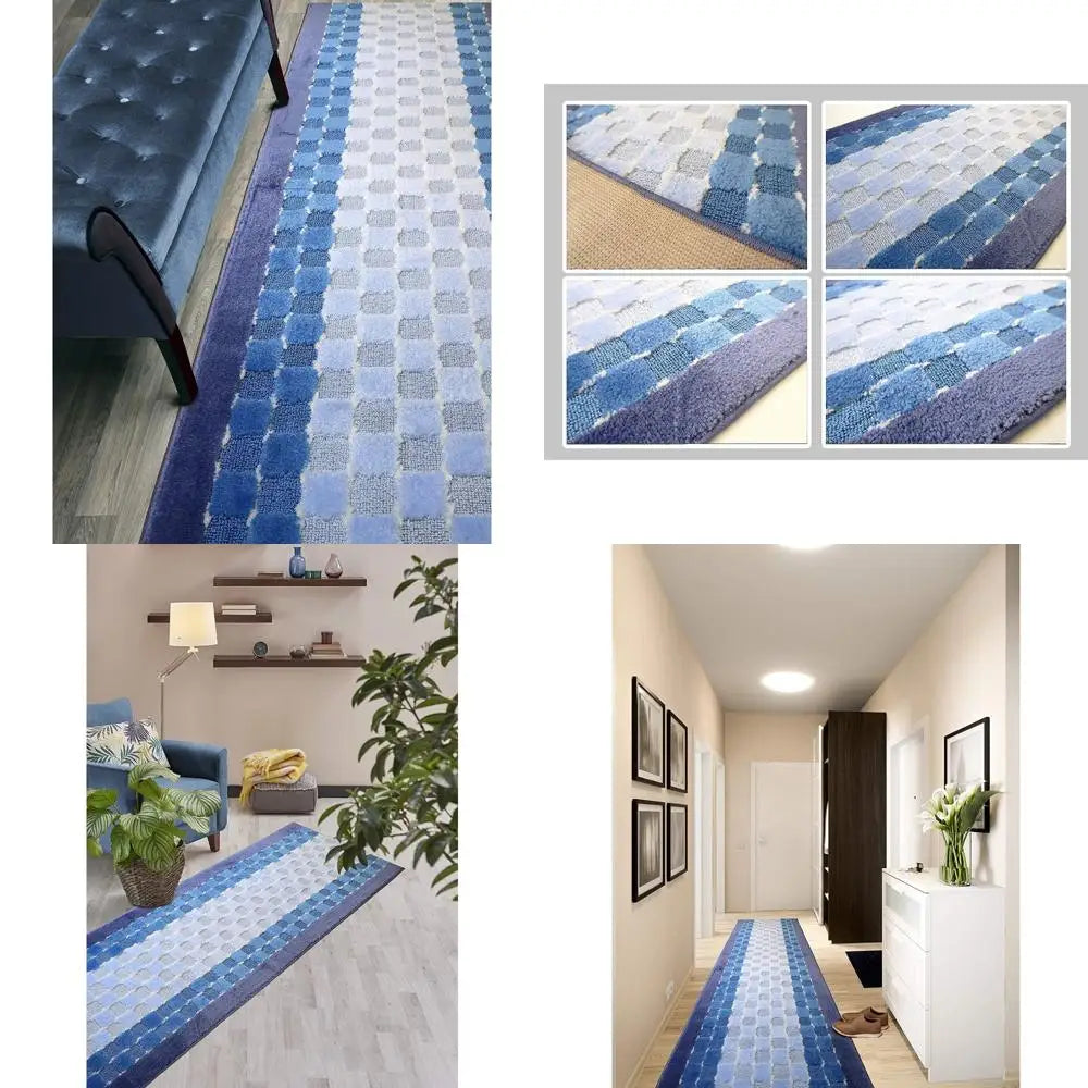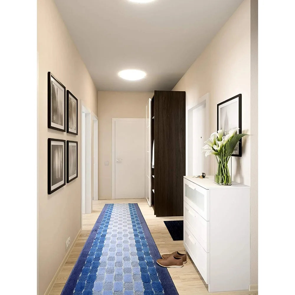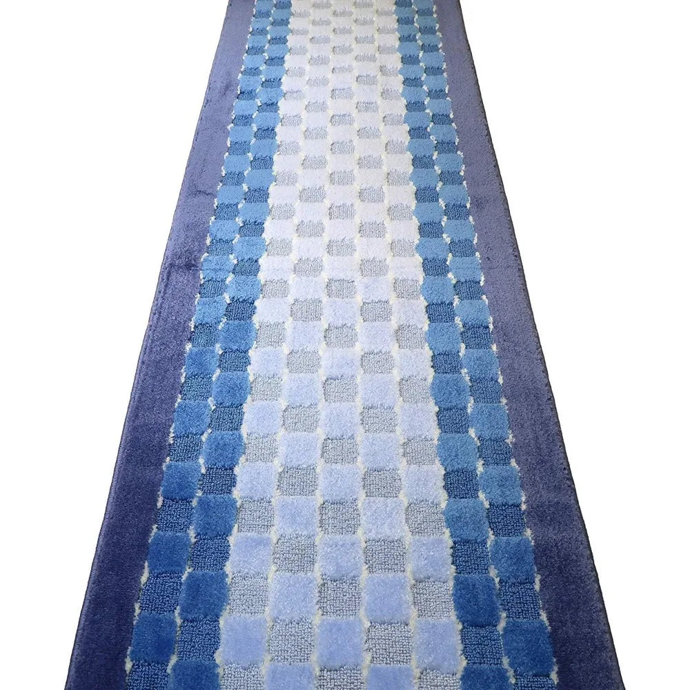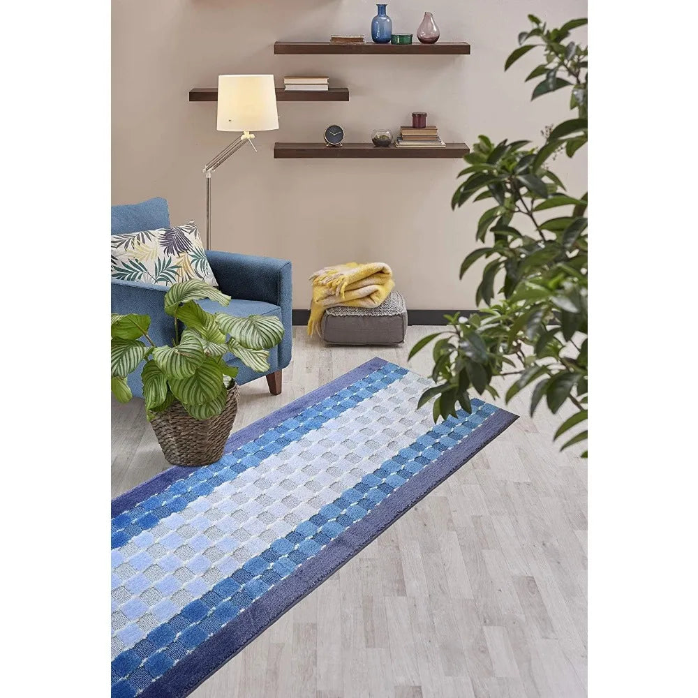Slip Resistant Checkered Blue Hallway Runner Rug Custom Length