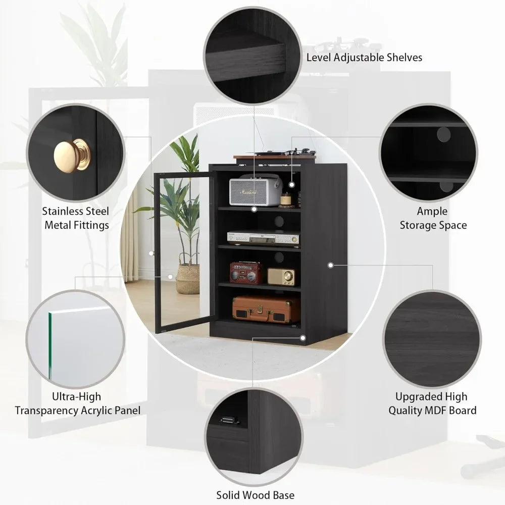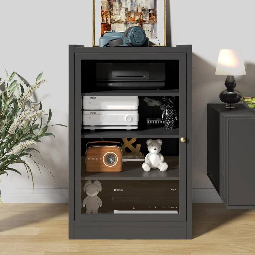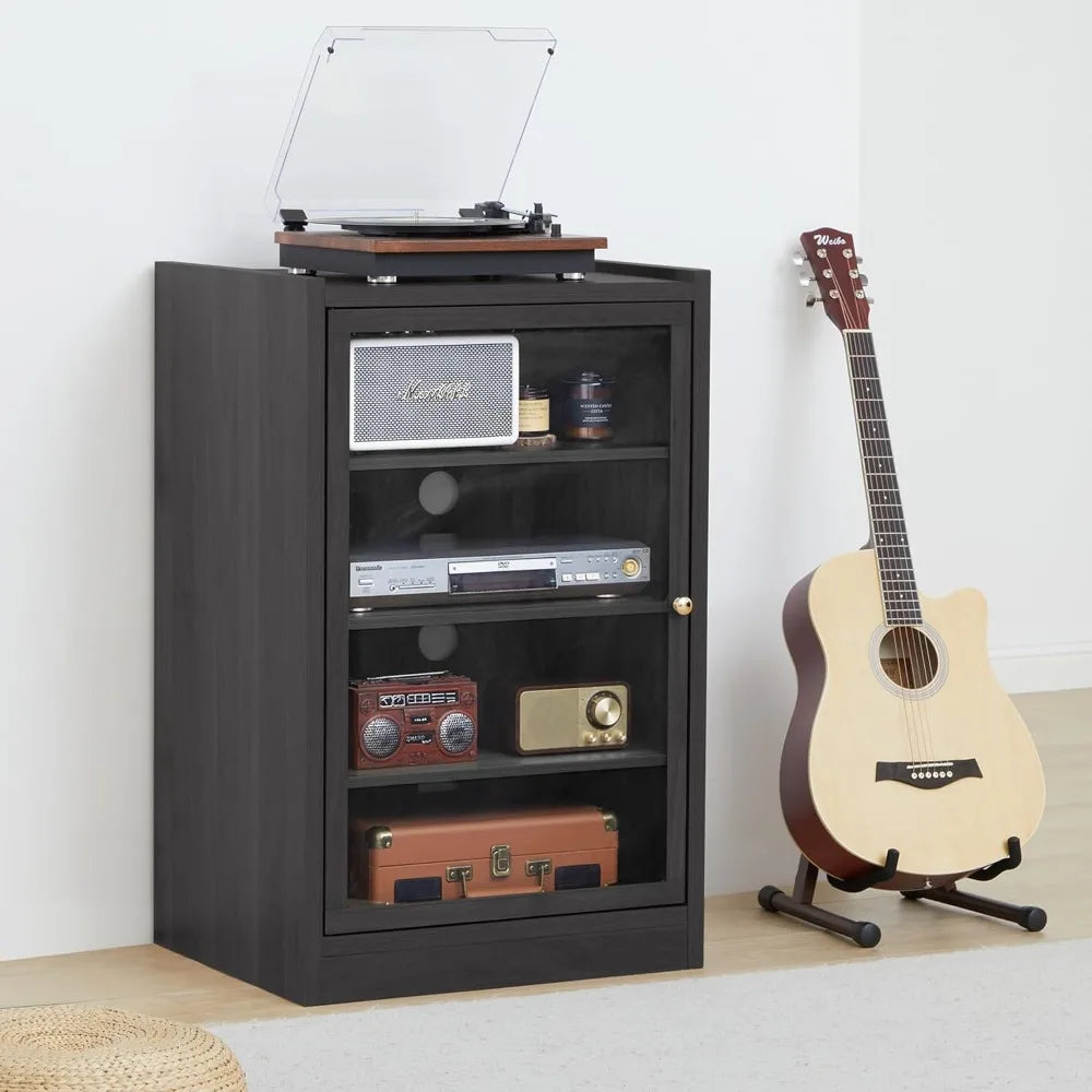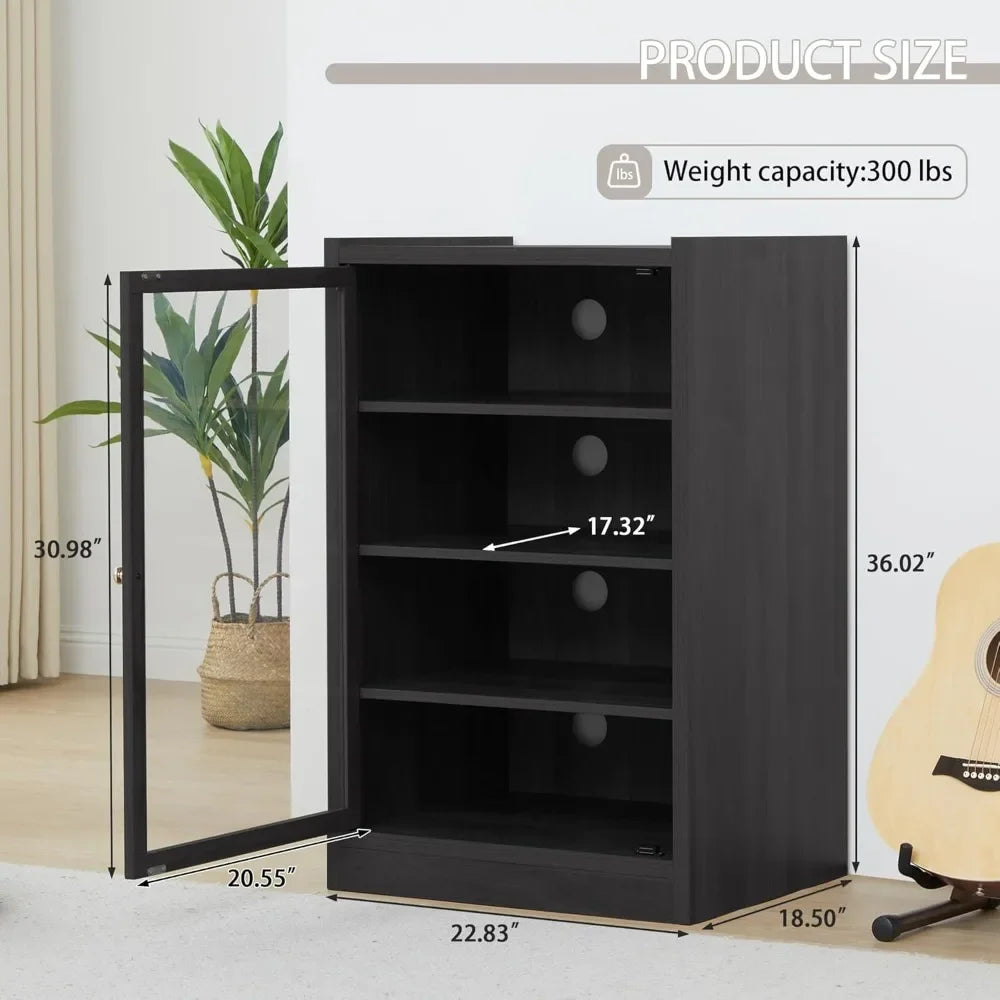 Sturdy Black Shelf Stereo Cabinet with Door and Cable