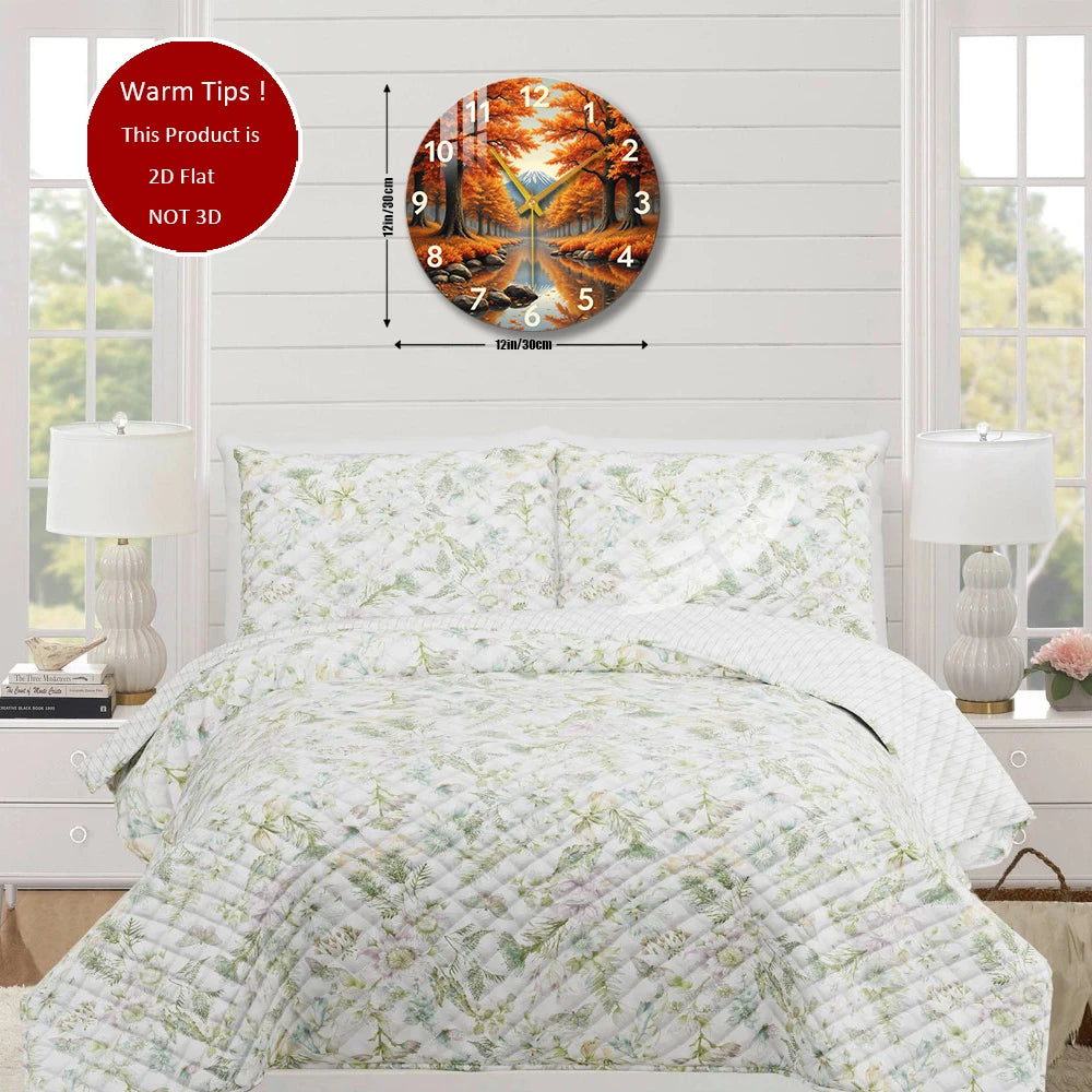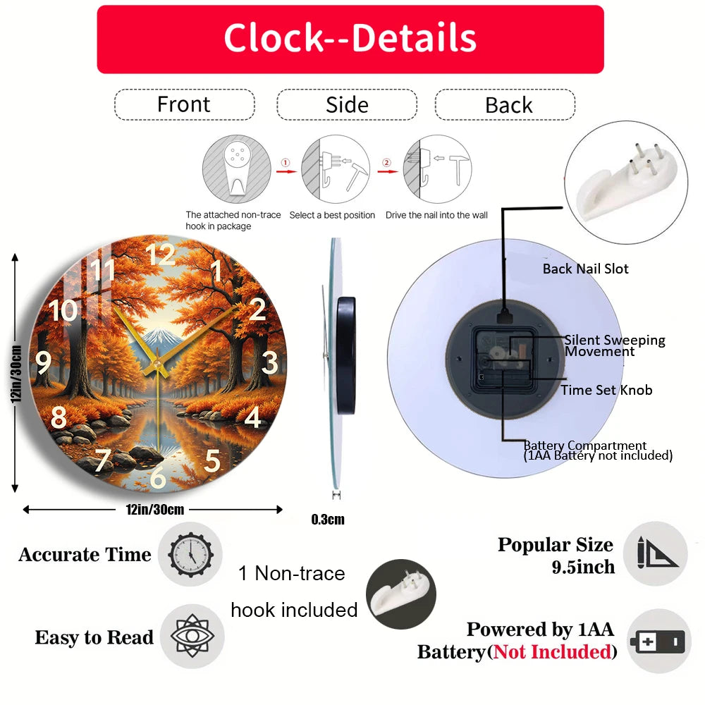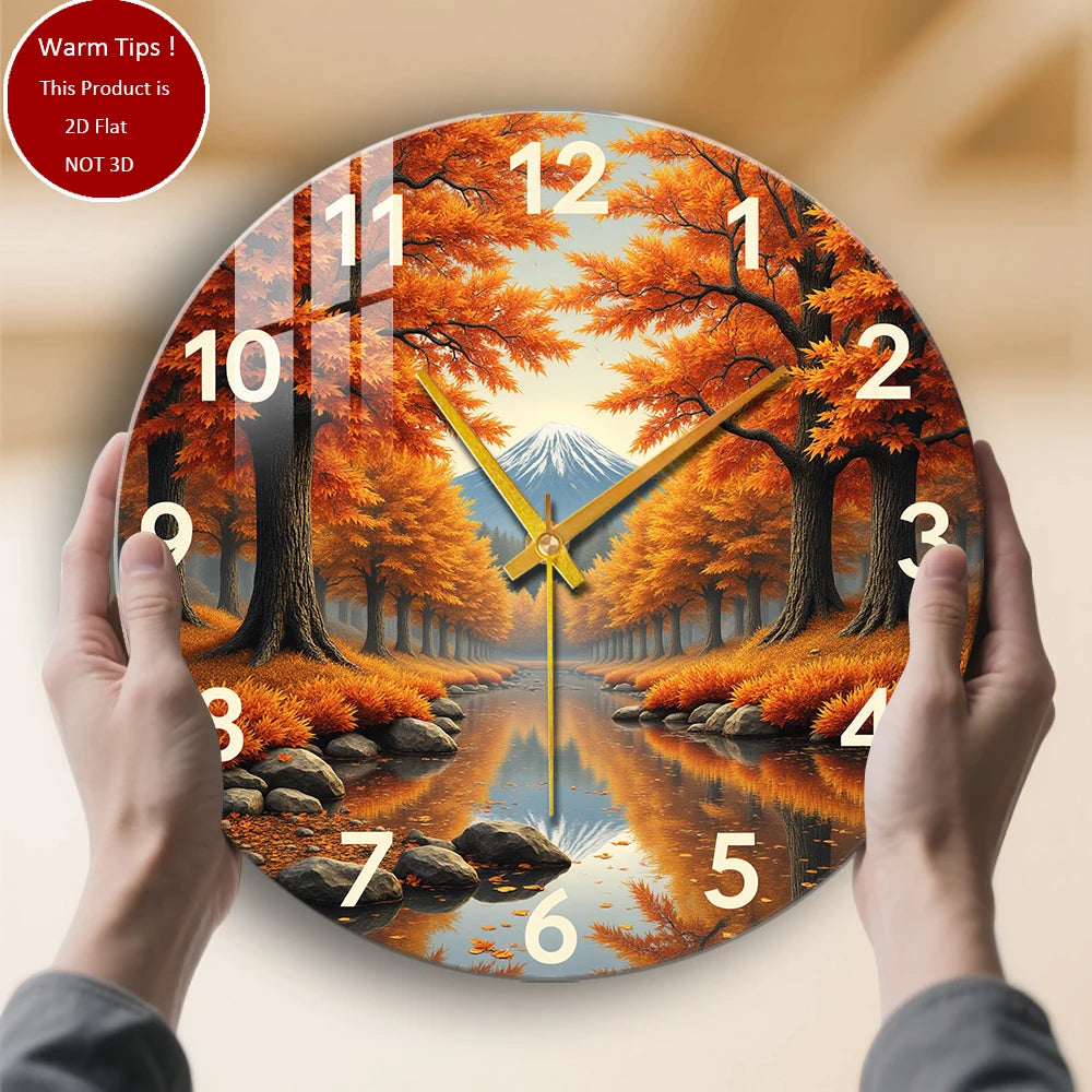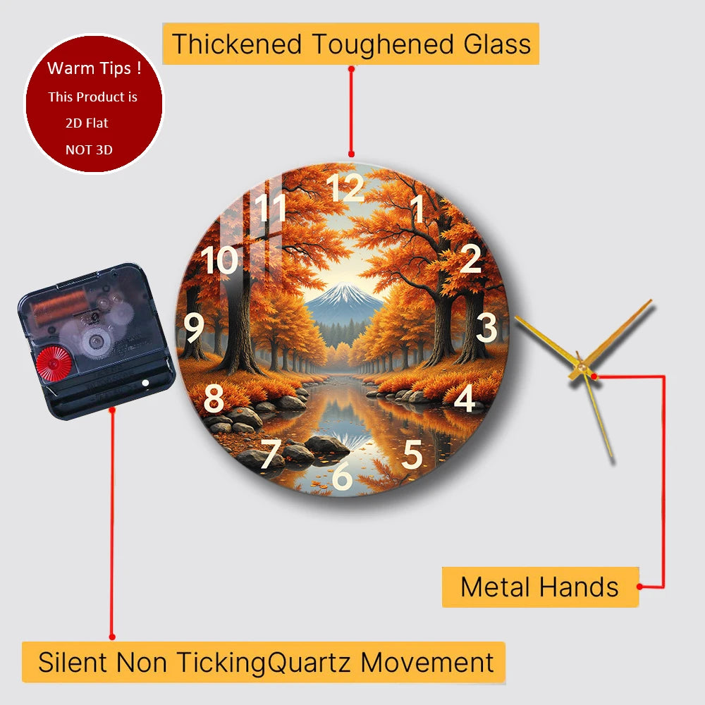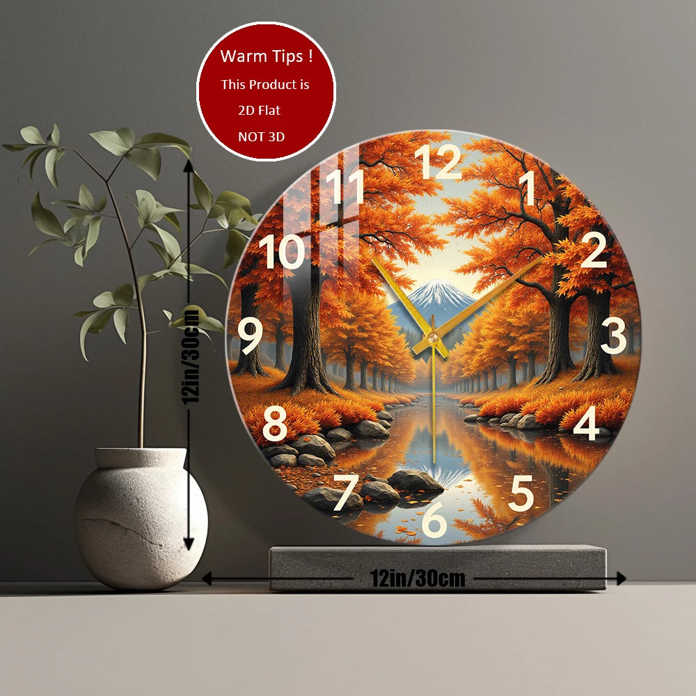 Tempered Glass Wall Clock Autumn Forest River Mount Fuji (12 inch--30x30CM)