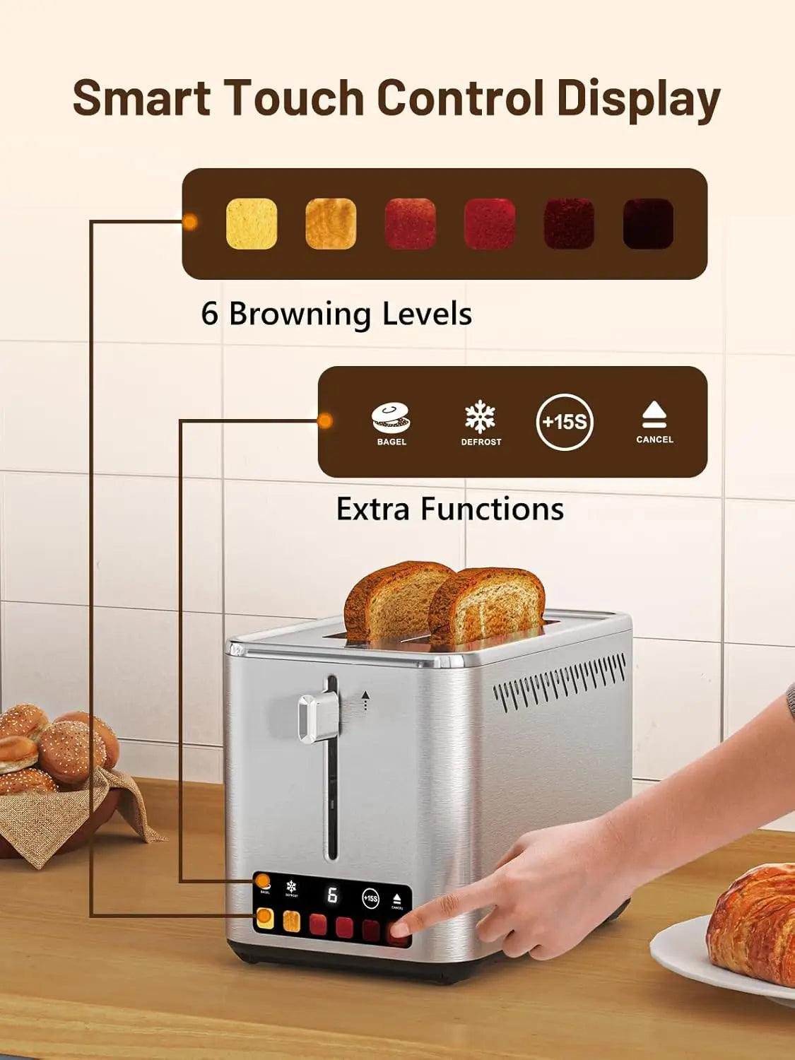 Touch Screen Slice Toaster with Browning Levels Bagel Defrost